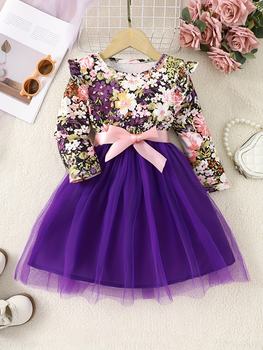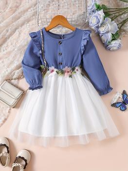 Girls’ Knitted Round Neck Long Sleeve Floral Print Mesh Dress Party Princess Dress