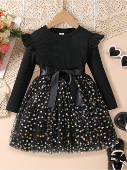 1-Piece Set: Girls’ Spring and Autumn Thin Dress, Children’s Comfortable and Soft Simple Dress with Star Print, Lace Trim, Round Neck, Long Sleeves, Belt Decoration, Puffy Skirt, One-Piece Dress. Cute and Elegant Princess Dress for Girls, Suitable for Youth, Sweet Holiday Style Outfits. for Ages 4-5-6-7-8, Suitable for Outdoor Activities, Casual Wear, Parties, Holidays, and as a Gift