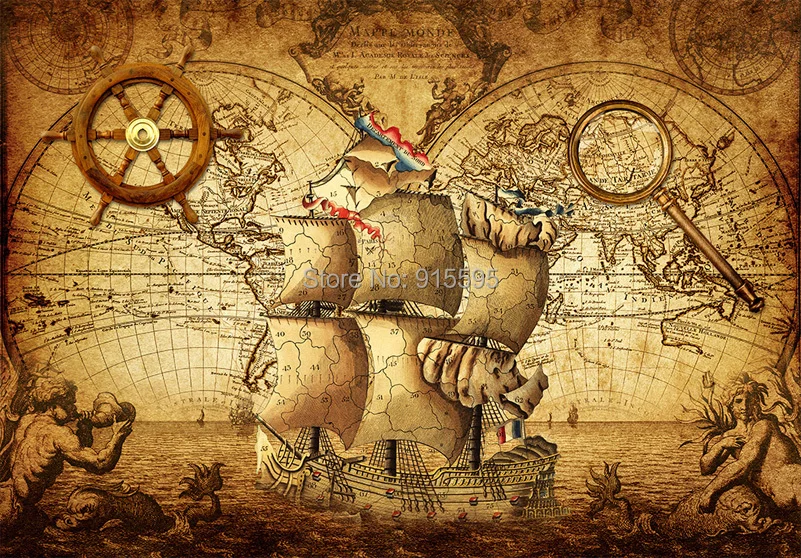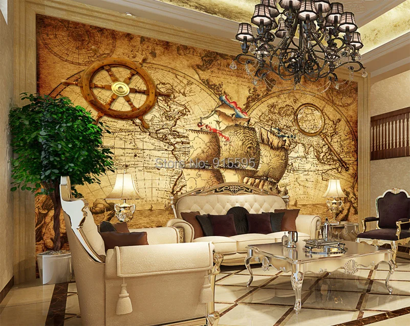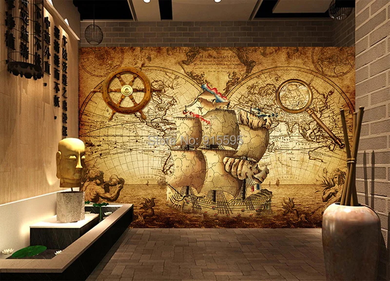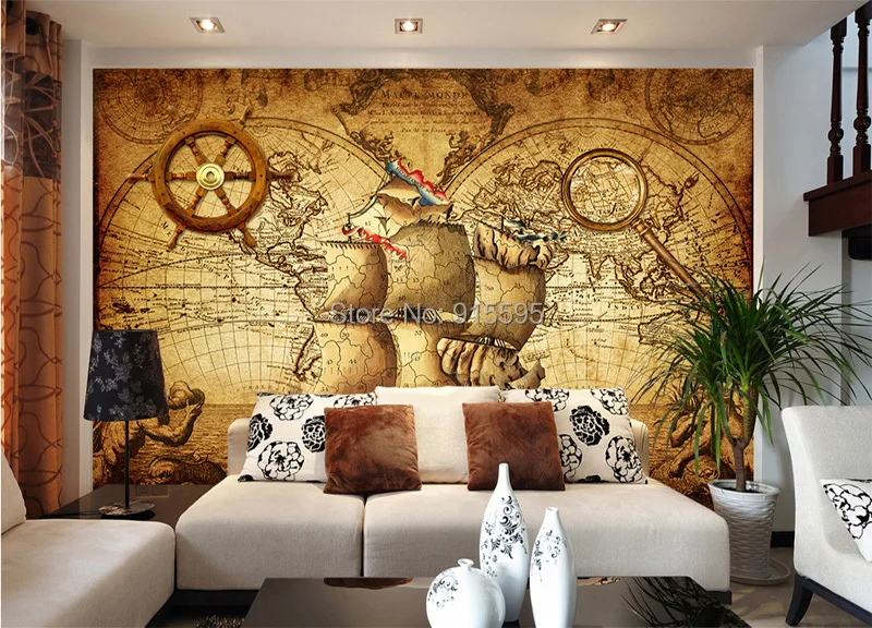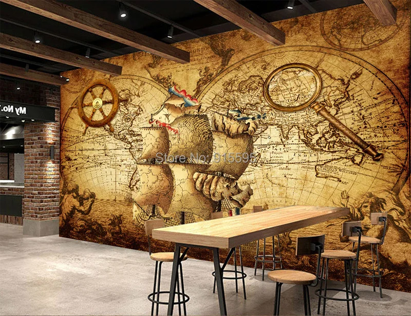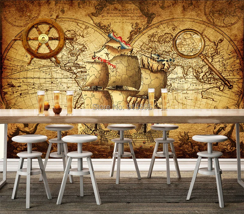الرجعية الحنين المشارك غرفة ثلاثية الأبعاد خلفية مخصصة جدارية غير المنسوجة ورق حائط ديكور الملاحة الإبحار خريطة العالم لوحات جدارية