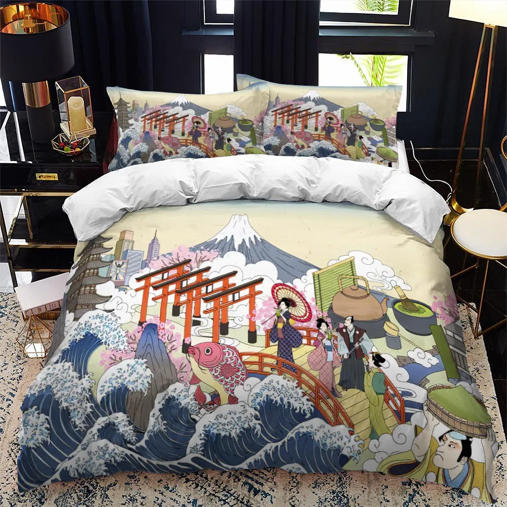النمط الياباني مجموعة غطاء لحاف الملك الملكة كامل الحجم Ukiyo-e موضوع موجة نمط مجموعة الفراش البوليستر فوجي الجبل غريبة نمط