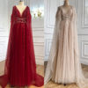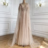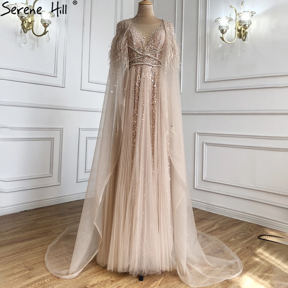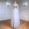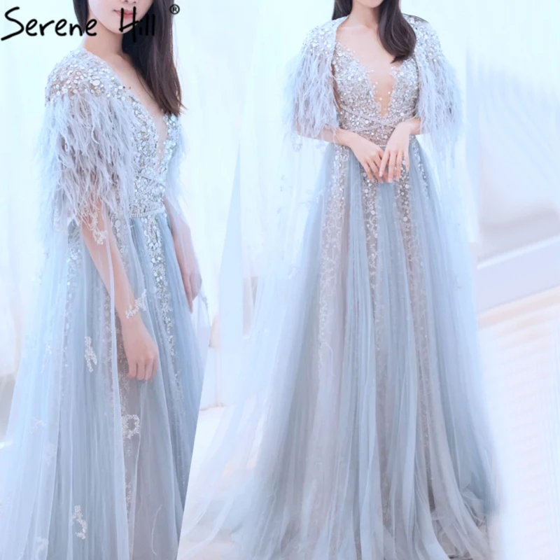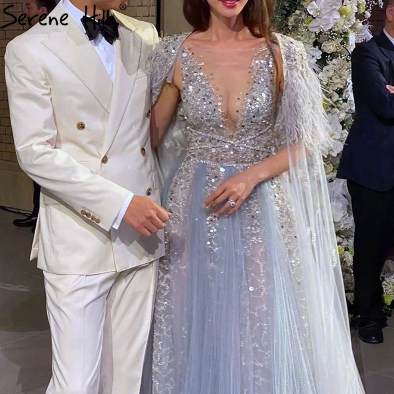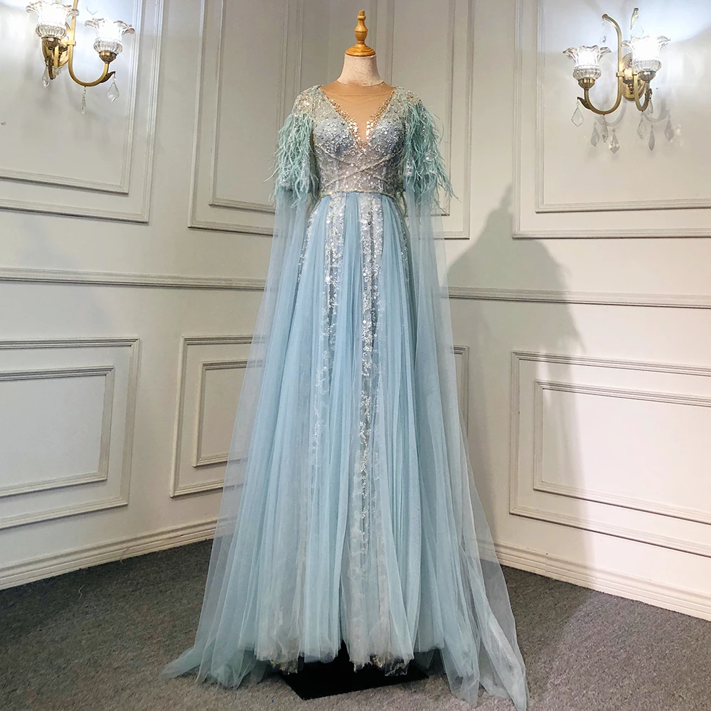 سيرين هيل فاخر دبي رمادي مساء فساتين رسمية مع ريشة شال كاب الذهب العربية المرأة رداء حفلات الزفاف طويل LA70640