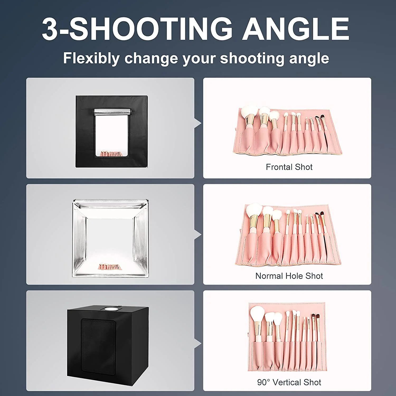 2. زوايا اطلاق النار متعددة:صندوق إضاءة الصور مصمم باحترافية مع نافذة تصوير أفقية أمامية واحدة ونافذة عمودية واحدة. زوايا اطلاق النار مرنة تمكنك من اختيار أي موقف اطلاق النار الصورة ، وأداء ميزات المنتج أكثر كمالا والجمال.