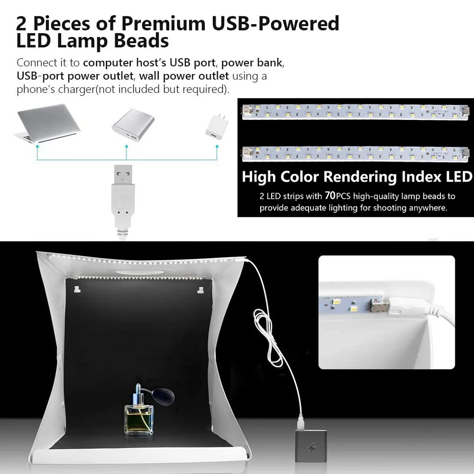 1. يعتم:دمج 132 عالية الجودة الخرز مصباح ليد مع مجموعة عكس الضوء 1%-100% ، 5500K درجة حرارة اللون. يمكنك بسهولة ضبط السطوع للحصول على تأثير الإضاءة المطلوب. مثالية لاطلاق النار على العناصر الصغيرة مثل المجوهرات والاكسسوارات ولعب الأطفال والساعات والأدوات وغيرها من البنود.