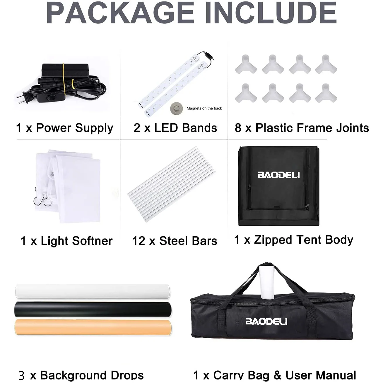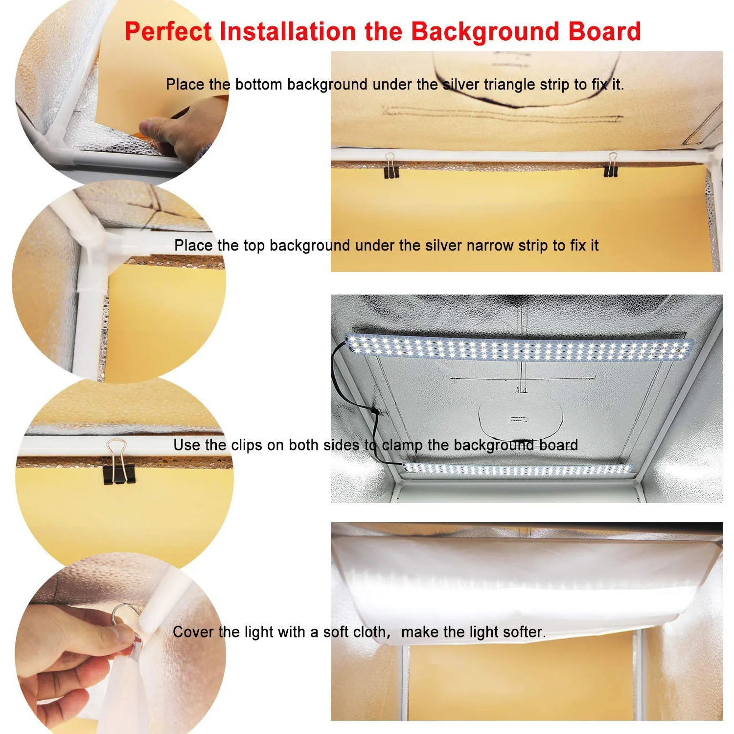 5. قائمة التغليف:(1) x جودة 16 ”x 16” x 16 ” / 40x40x40 سم مكعب استوديو الصور خيمة صندوق ؛ (3) x الخلفيات البلاستيكية (أسود ، أبيض ، تان) ؛ (2) × إخراج 5500K LED أشرطة الإضاءة ؛ (1) × محول الطاقة ؛ (1) × ضوء المنقي الناشر القماش ؛ (1) × حقيبة حمل ؛ (1) × دليل المستخدم