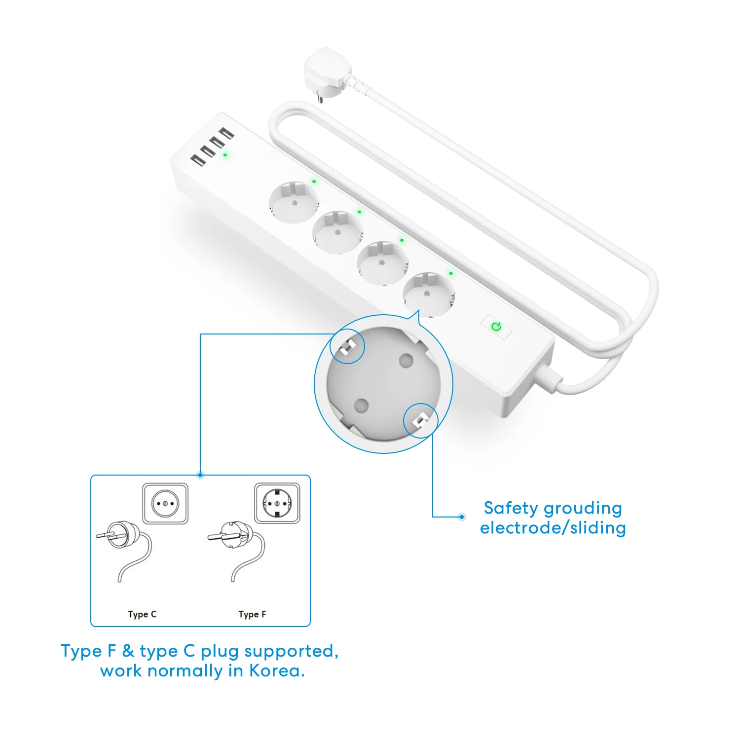 EU/FR:100-250V~, 50/60Hz 10.0A for single outlet, 16.0A maximum load 5V 2.4A for single USB port 5V 4.0A for four USB ports,US/JP: 90-125V~, 50/60Hz, 15.0A maximum load 5V 2.4A for single USB port 5V 4.0A for four USB ports,UK: 100-250V~, 50/60Hz 10.0A f