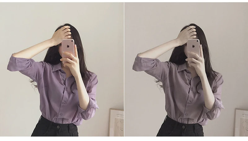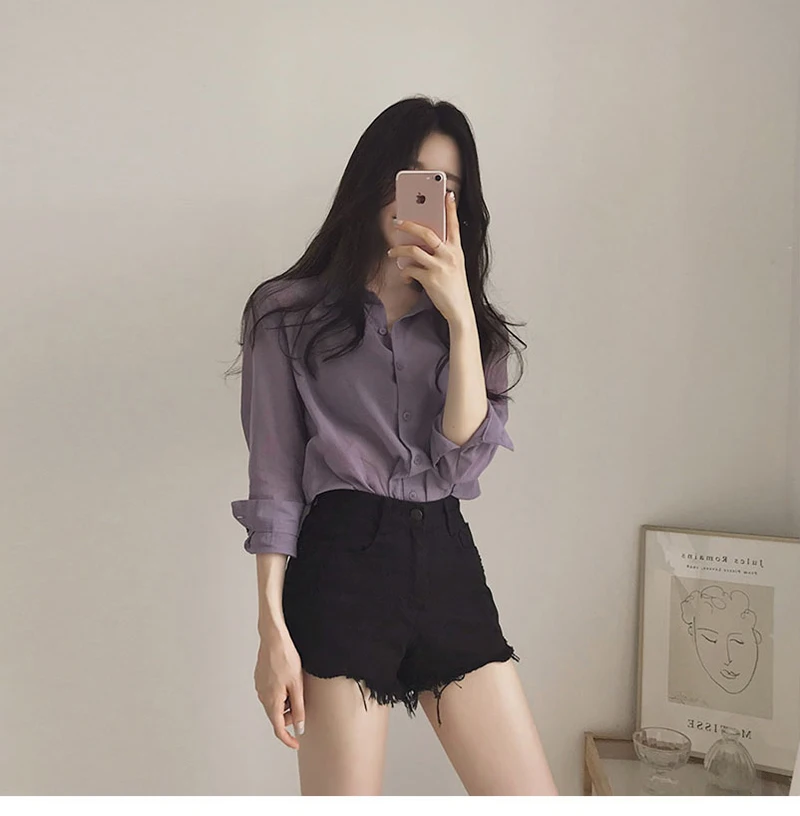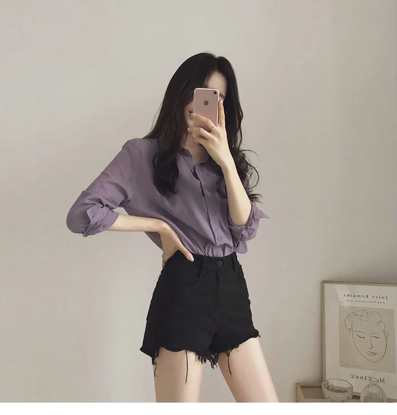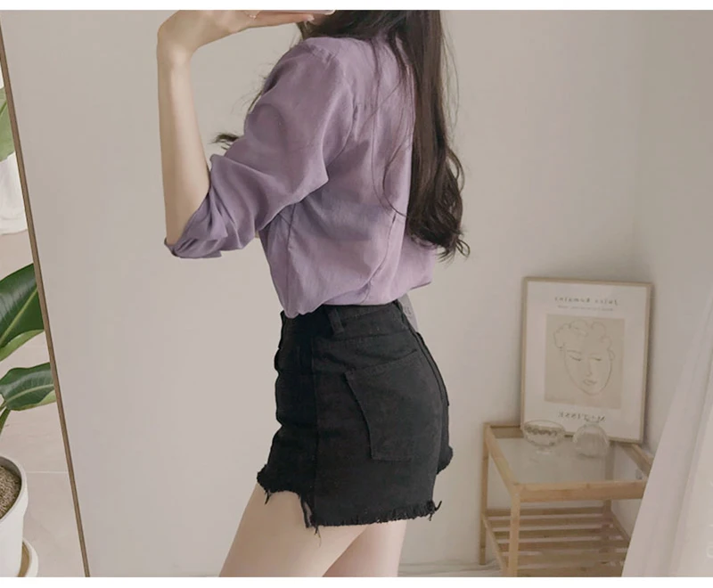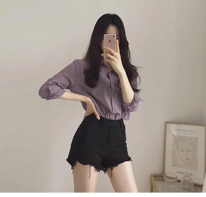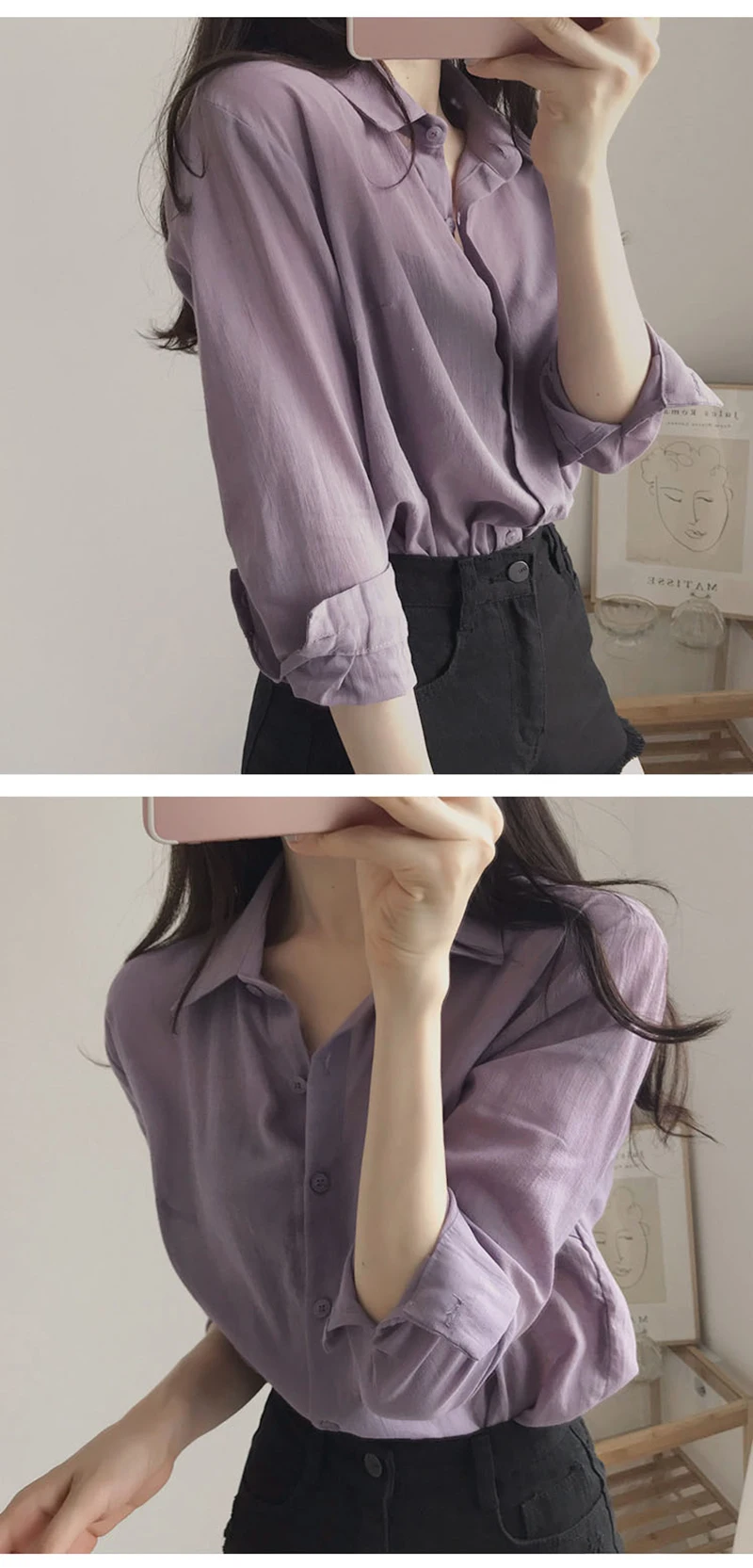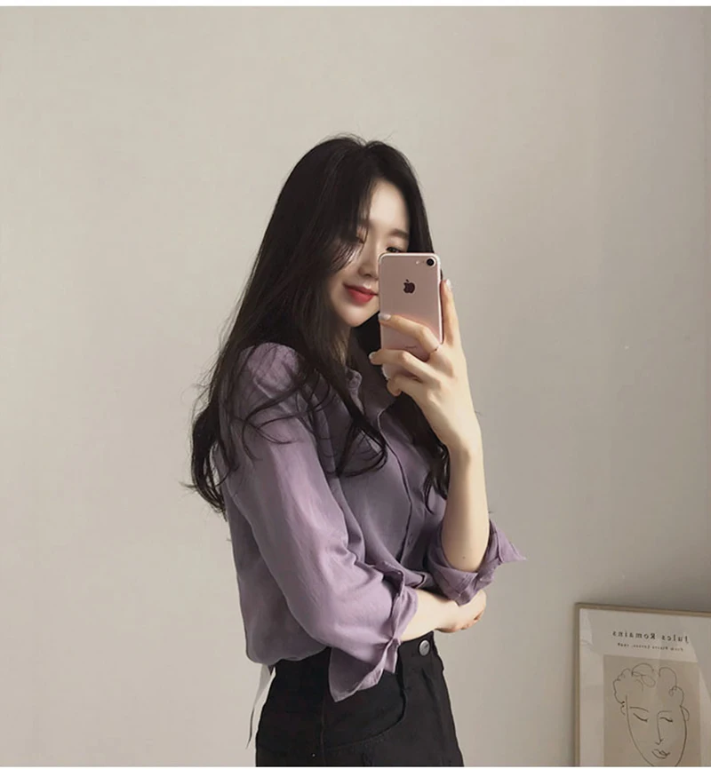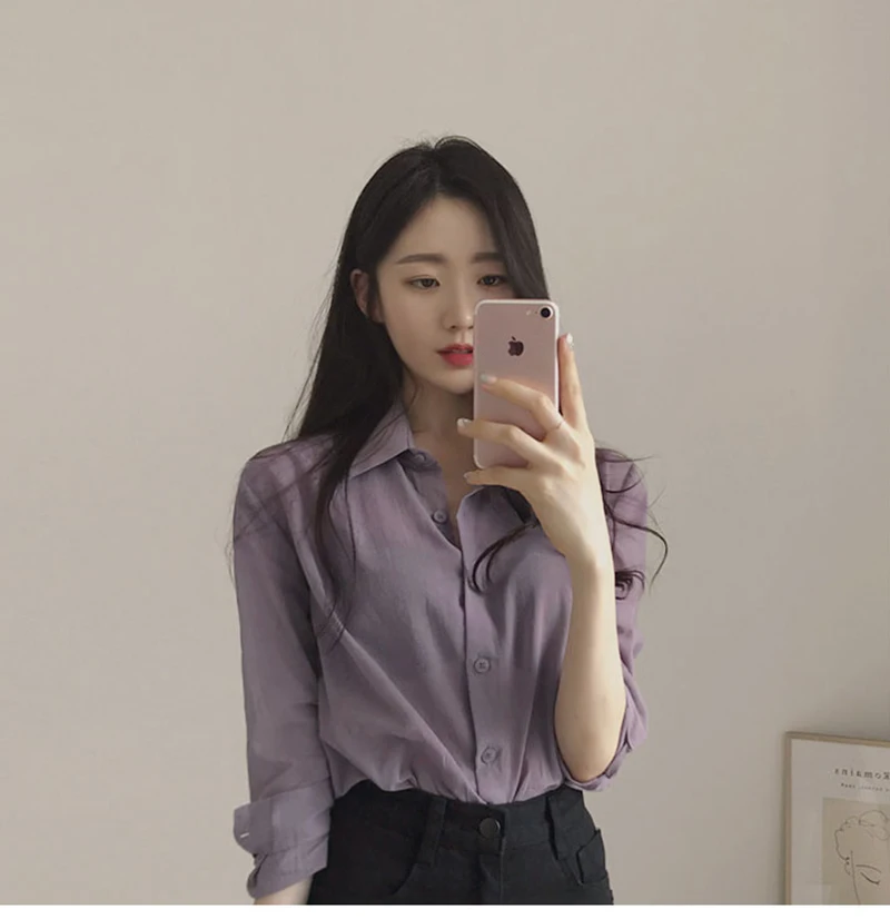 الحد الأدنى لطيف الأرجواني قميص السيدات التلبيب واحدة الصدر رقيقة بلوزة الربيع الصيف الكورية كم كامل بلوزة المرأة