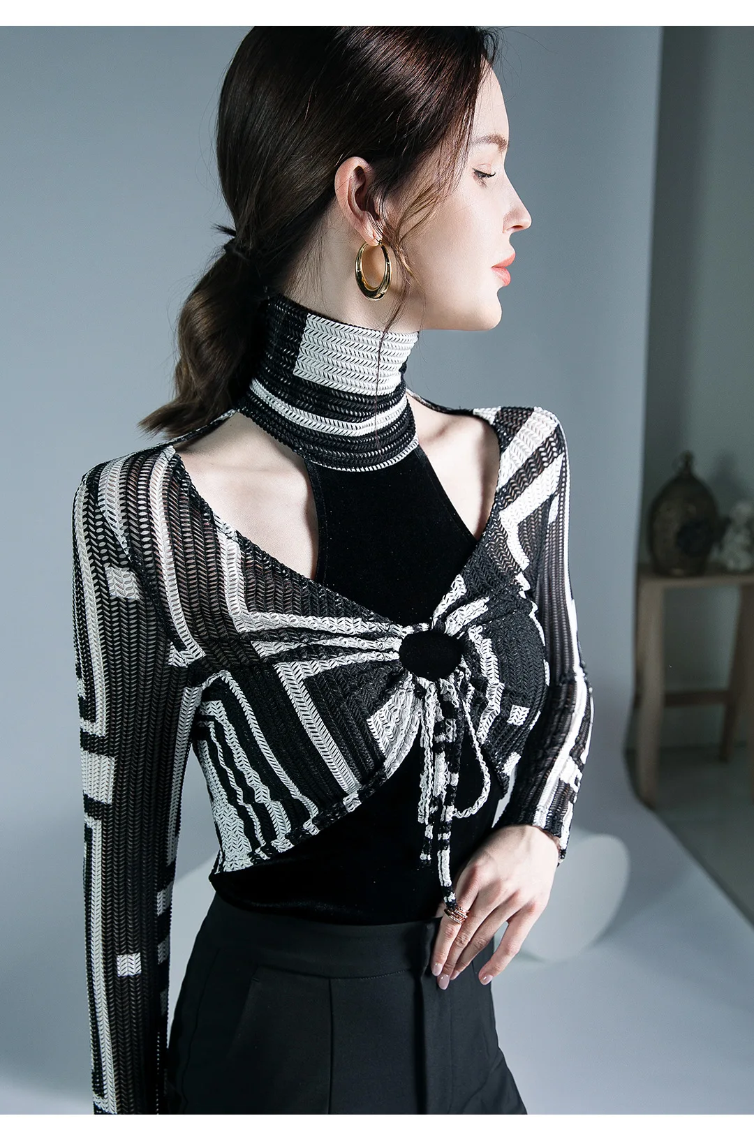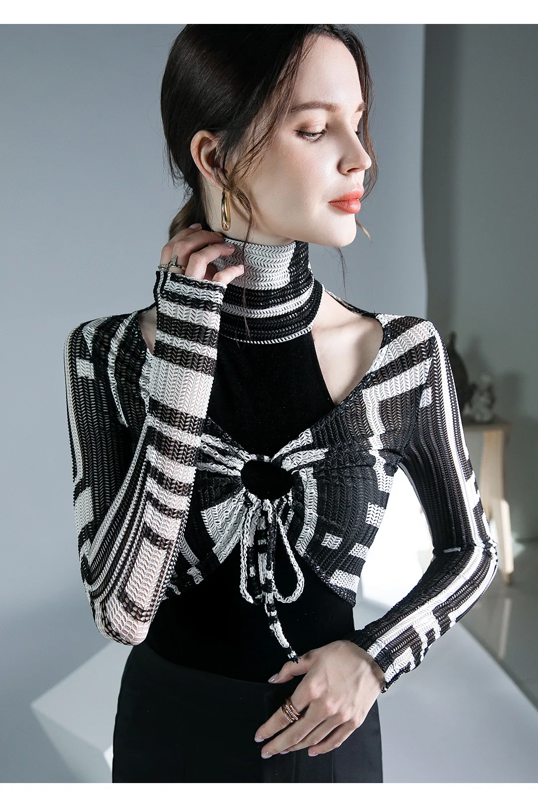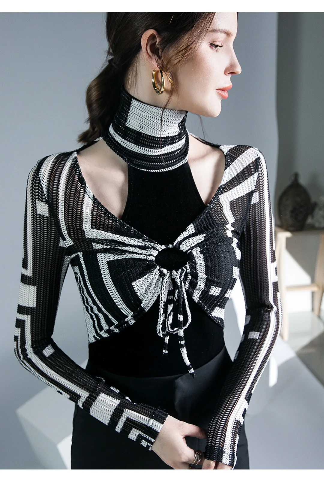 الخريف الربيع الإناث الياقة المدورة كامل الأكمام خليط تي شيرت الفتيات الجوف خارج سليم القمم تيز تي شيرت امرأة
