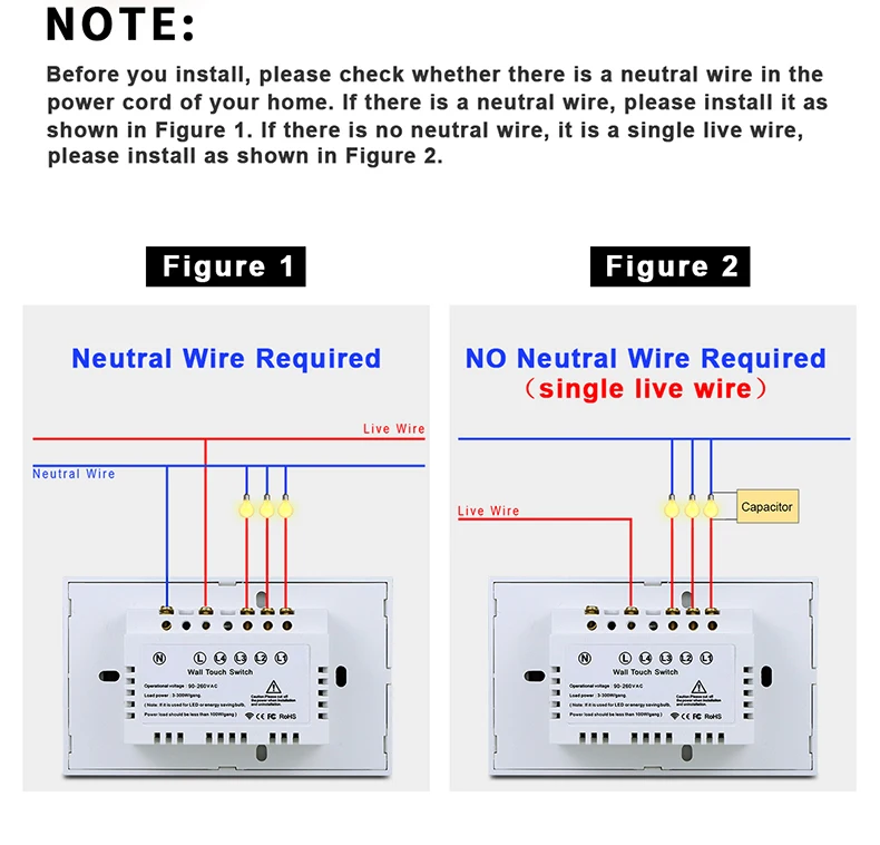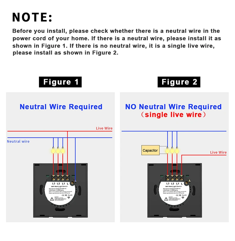 1) هذا التبديل يمكن أن تعمل في كل من دون سلك محايد ومع سلك محايد ، متوافقة تماما مع هذين methods الأسلاك. إذا كانت أسلاك منزلك بدون سلك محايد ، فإن السعة يجب توصيلها ends من مصابيح L1 للعمل العادي.