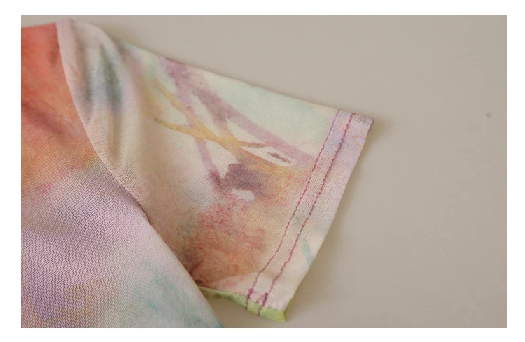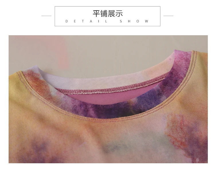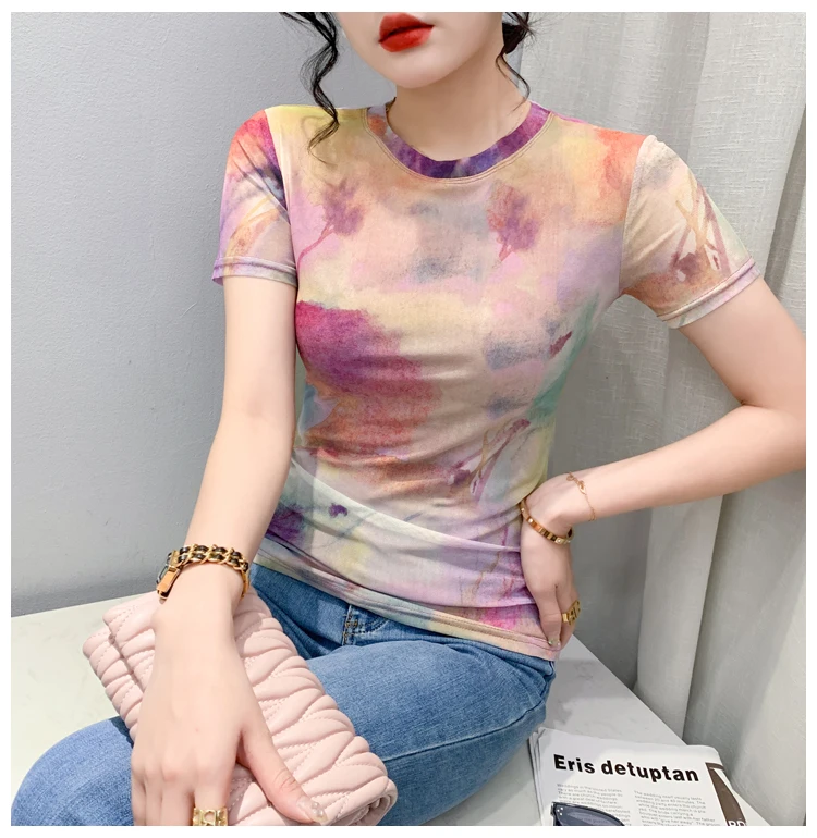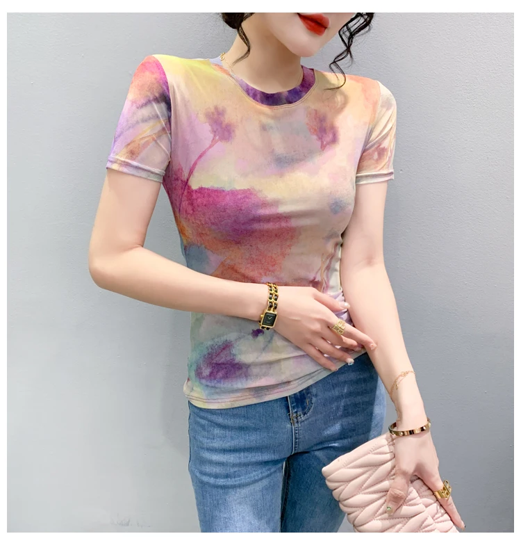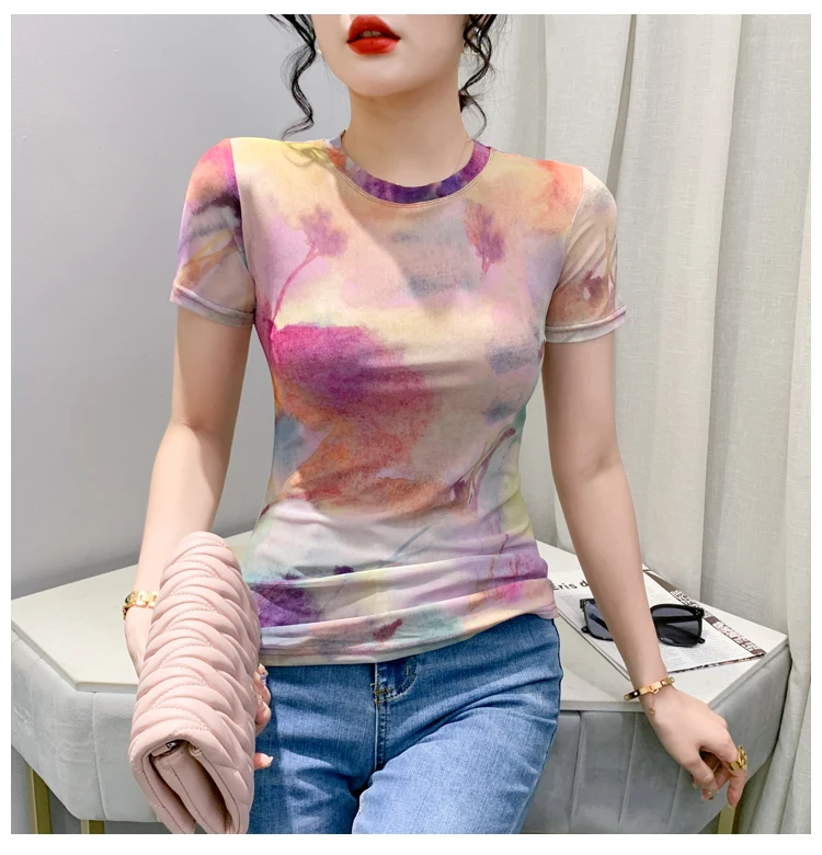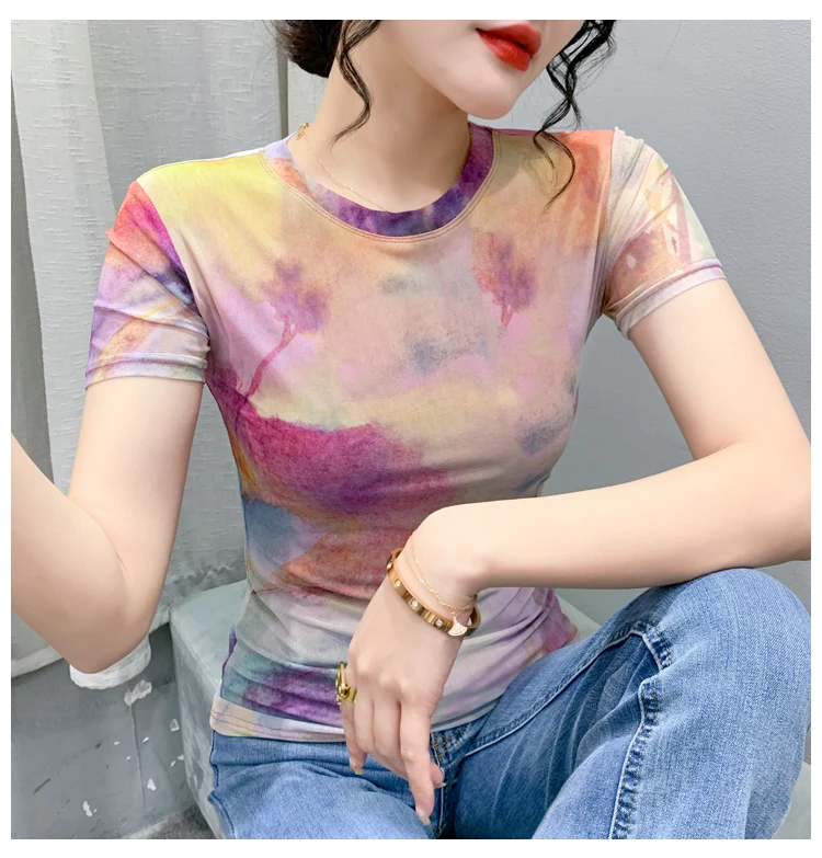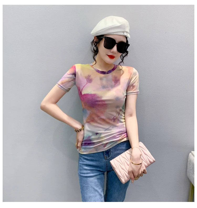 الصيف بسط شبكة تي شيرت المرأة س الرقبة ضئيلة قصيرة الأكمام التعادل مصبوغ مطبوعة تي شيرت الإناث أنيقة