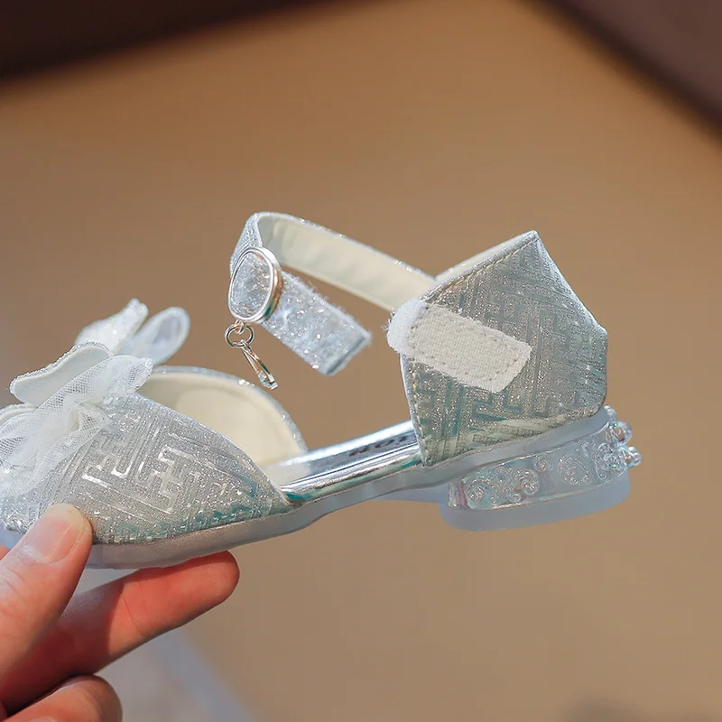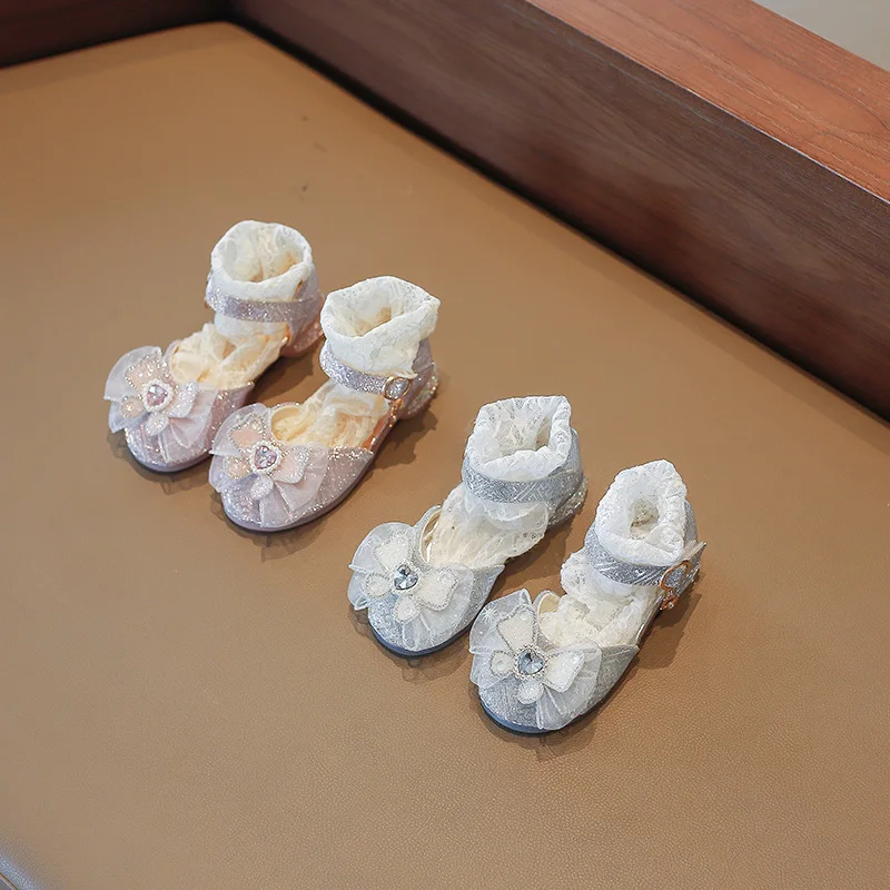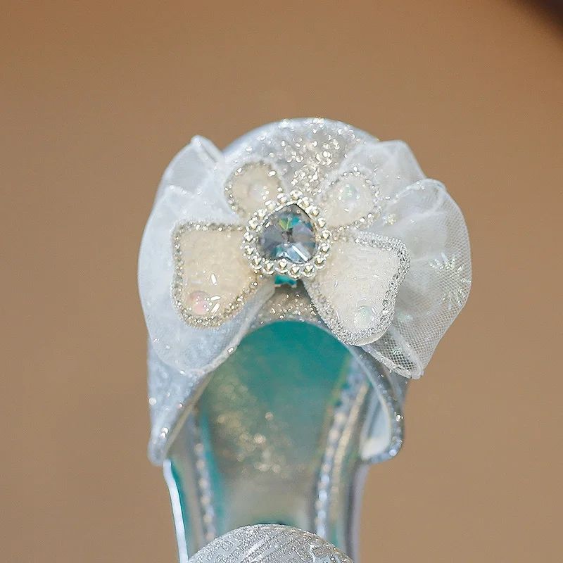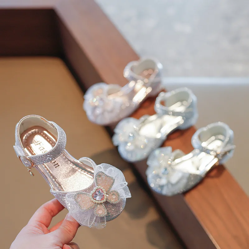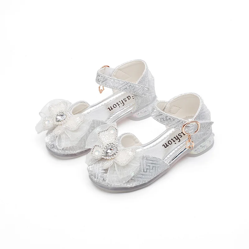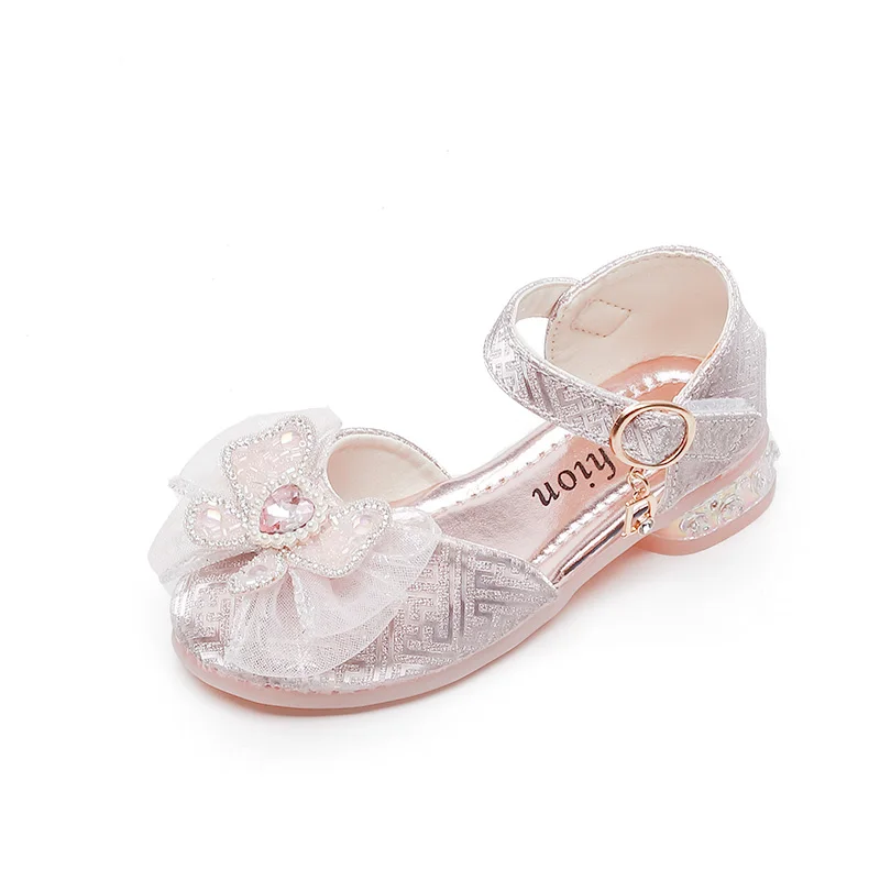 الفتيات الأحذية واحدة 2023 أحذية الأطفال موضة الفضة الشقق الأطفال الأميرة حجر الراين الوردي القوس الطلاب الأحذية