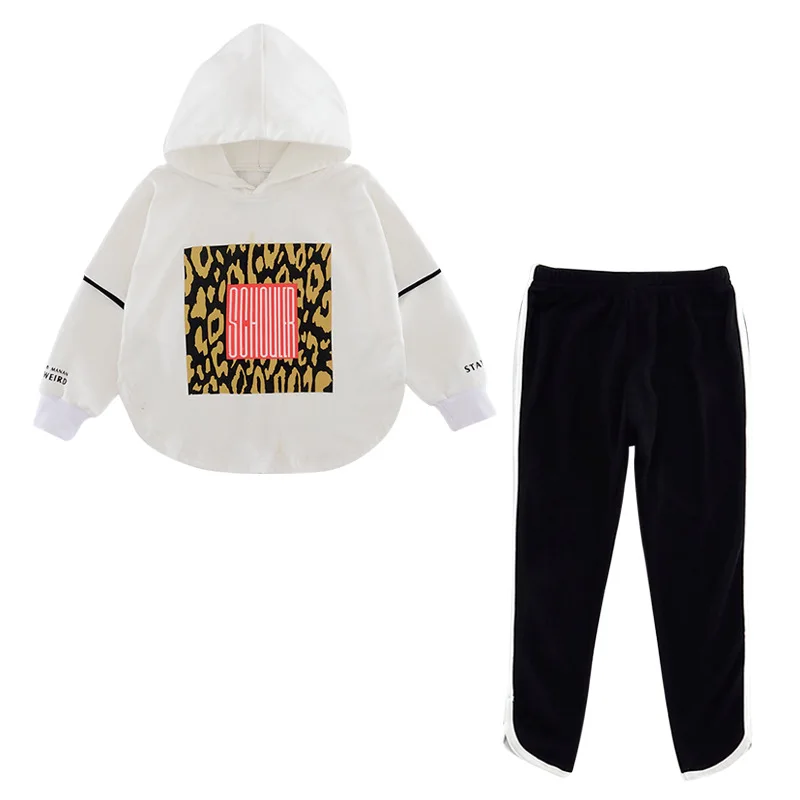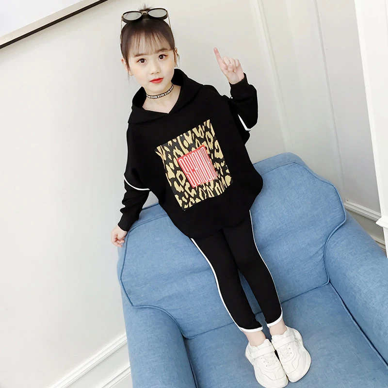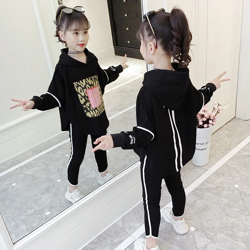الفتيات سترة الدعاوى الأوروبية والأمريكية 2021 الربيع والخريف جديد للأطفال عادية 2 قطعة مجموعة ملابس أطفال كبيرة مقنعين 4-13Y