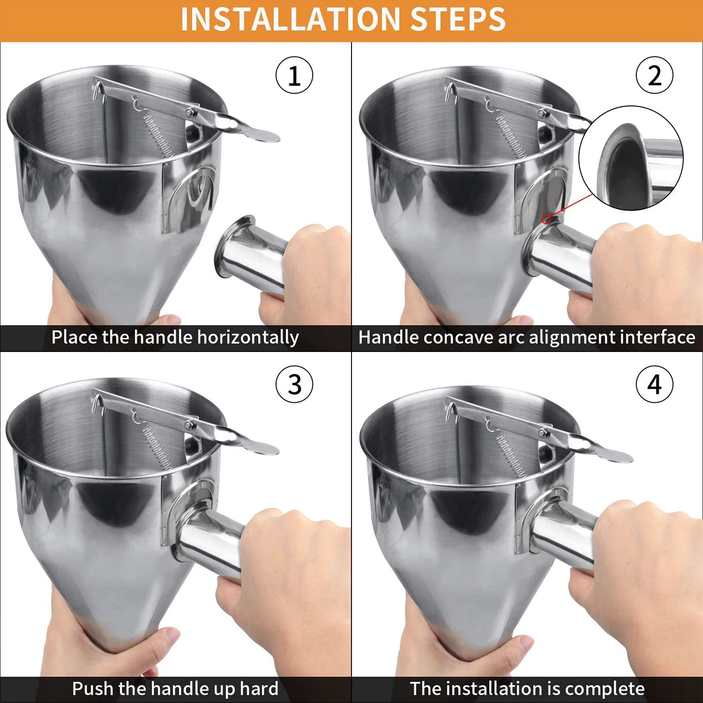 وقد تم تجهيز المهنية الفولاذ المقاوم للصدأ فطيرة المدفق مع قوس مستقر. يمكنك سهلة وسريعة لنقل الخليط إلى قوالب. وسهلة للتحكم في خليط الخبز على مقلاة الخاص بك والحديد الوافل. إذا كان الخليط سميك جدا ، فقط إضافة أكثر قليلا السائل وسوف تعمل تماما