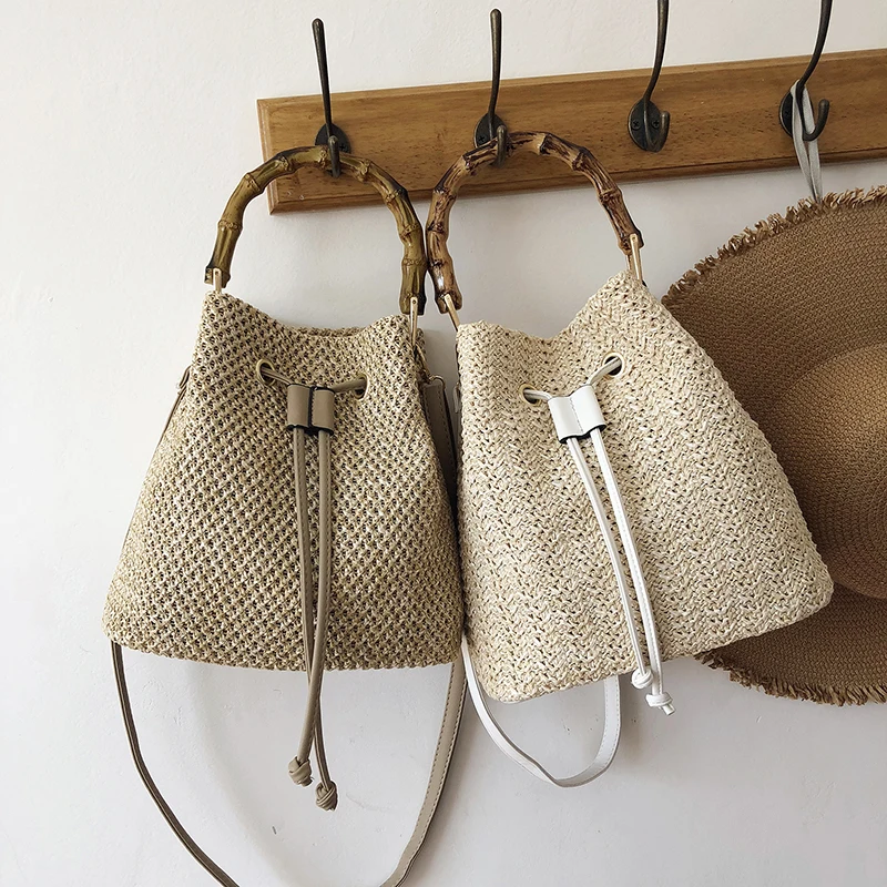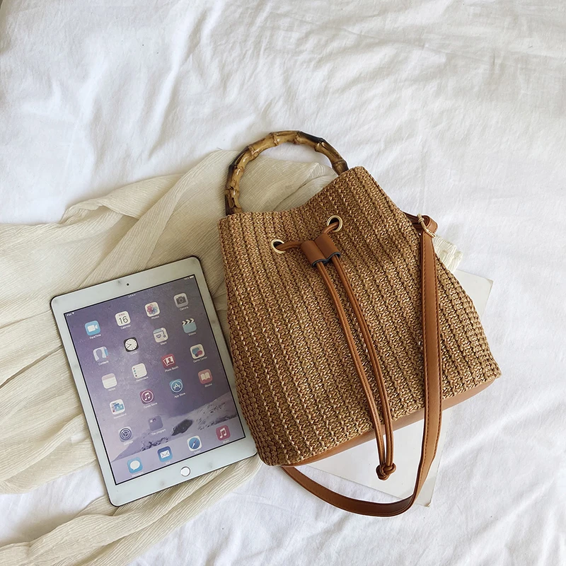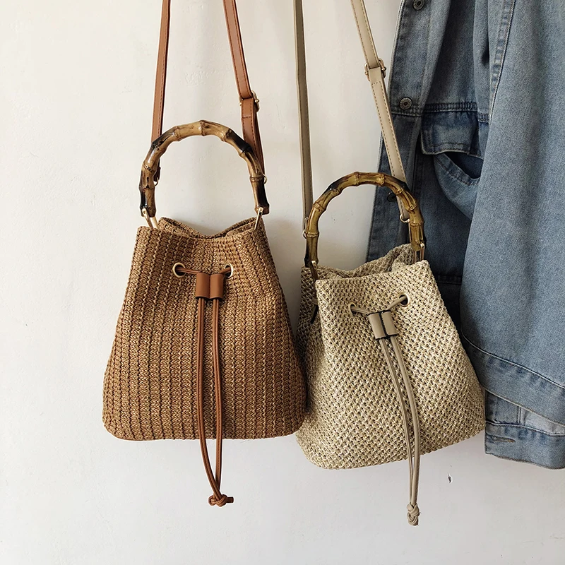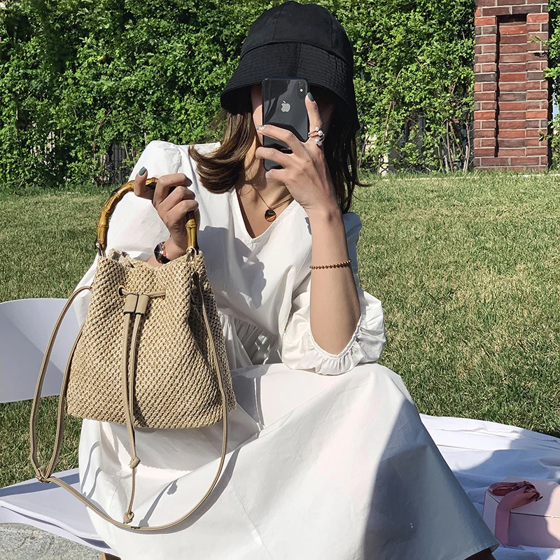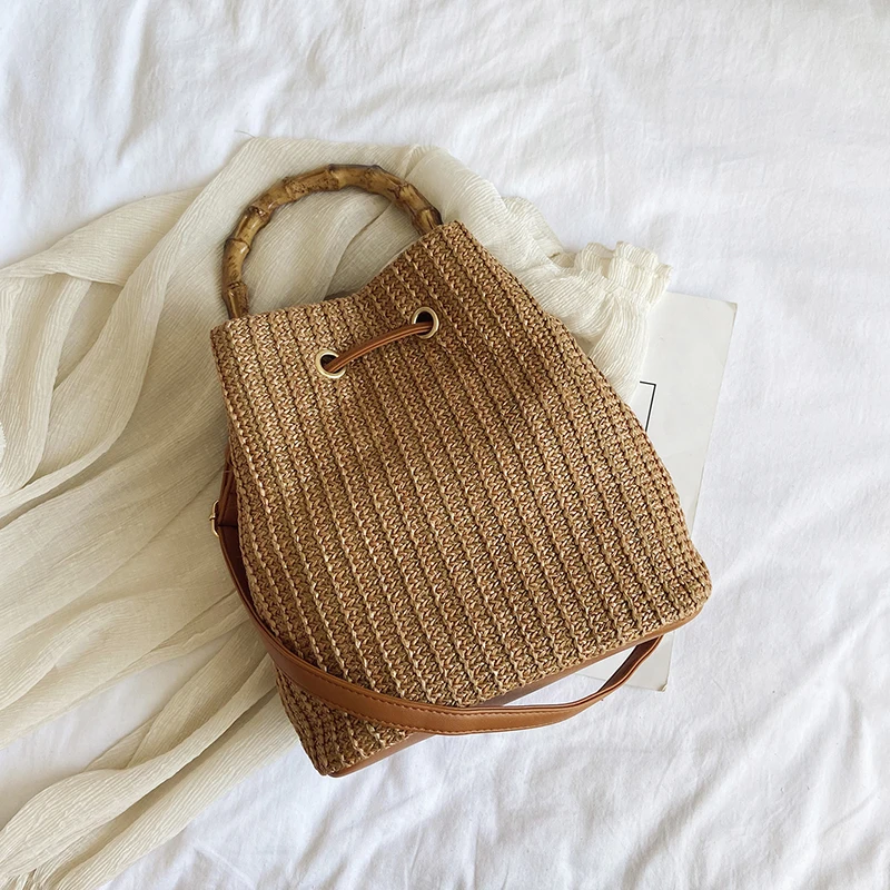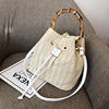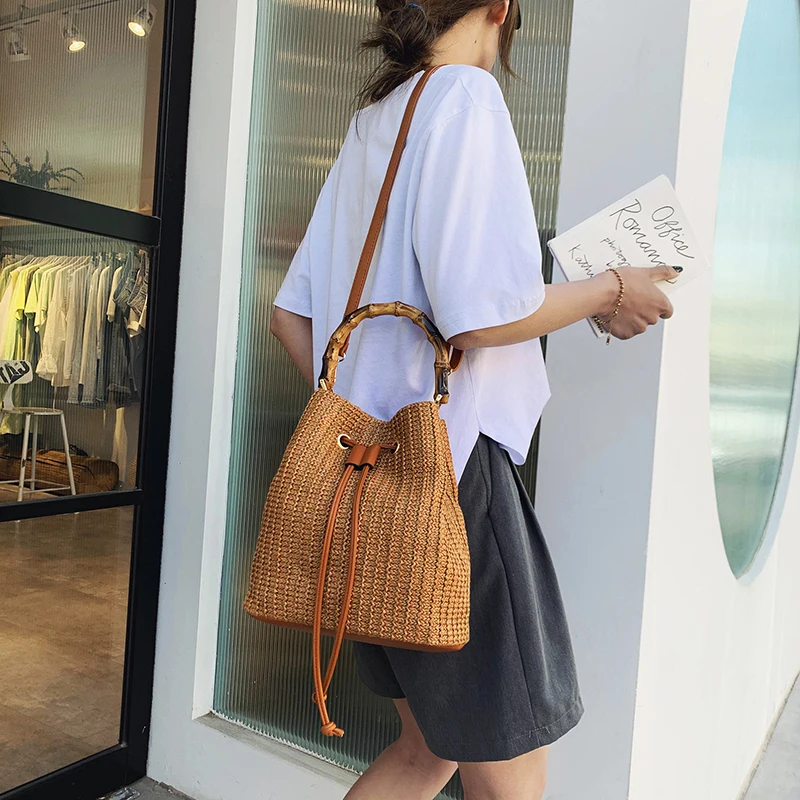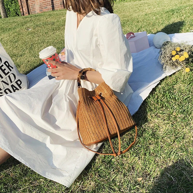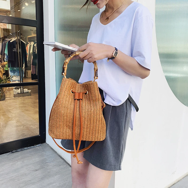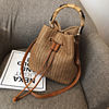 المرأة حقيبة الخيزران مقبض دلو حقيبة موضة المرأة حقيبة القش المنسوجة الكورية موضة حقيبة الكتف عادية الإناث Crossbody رسول