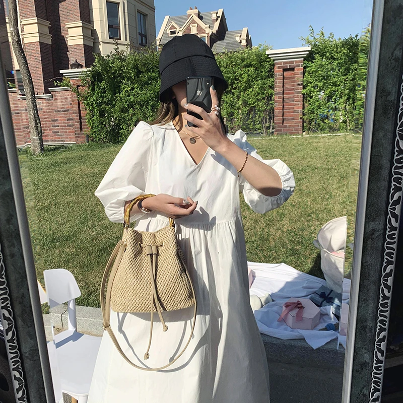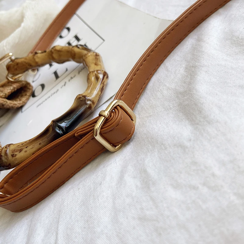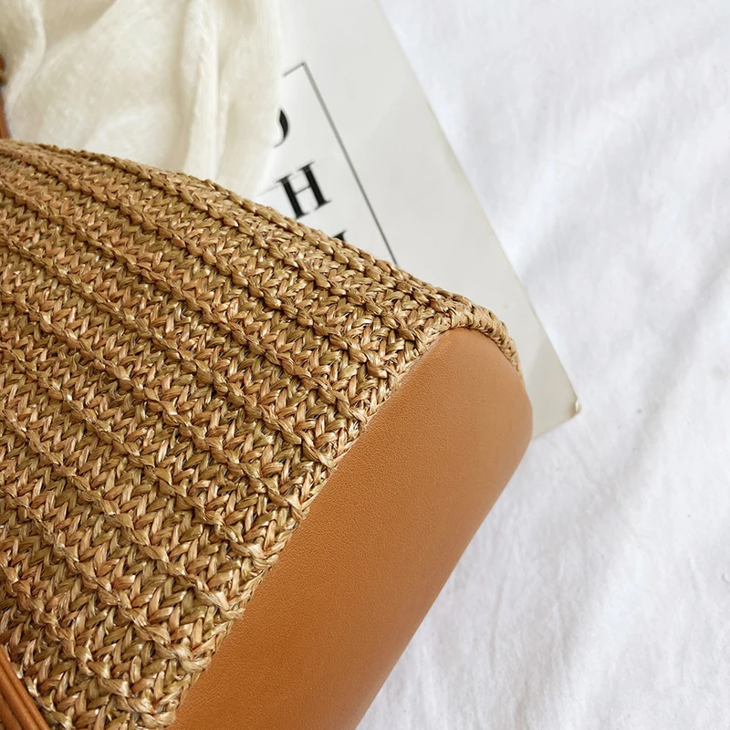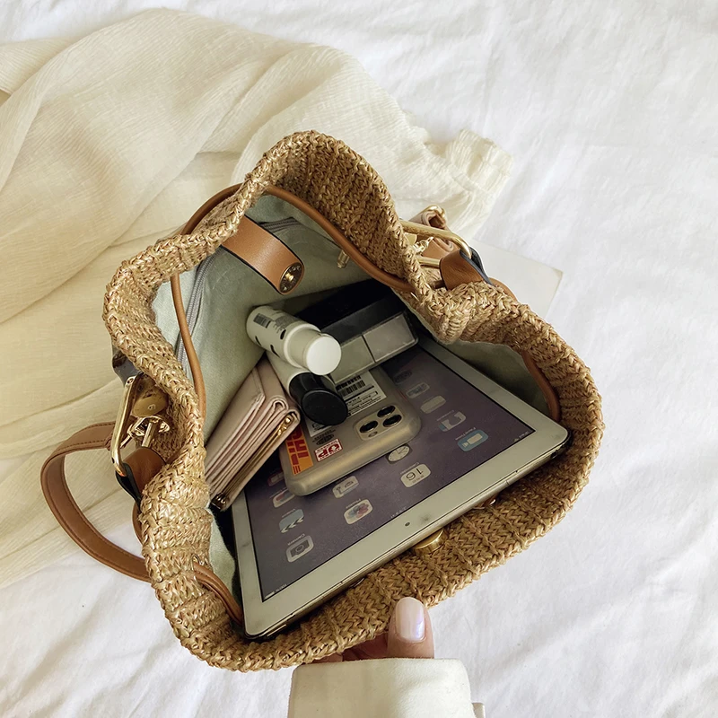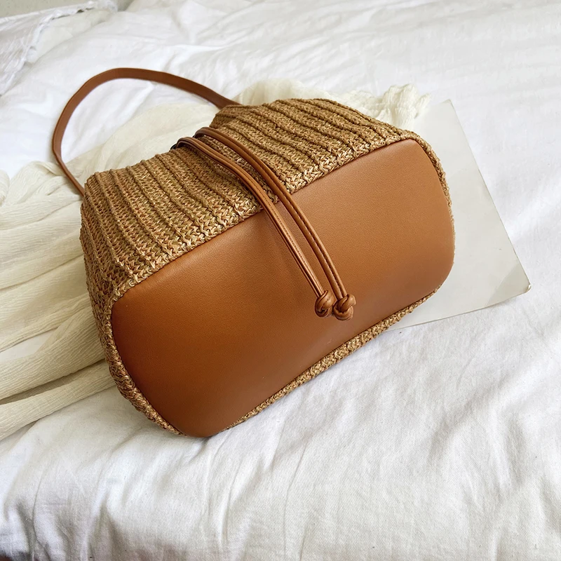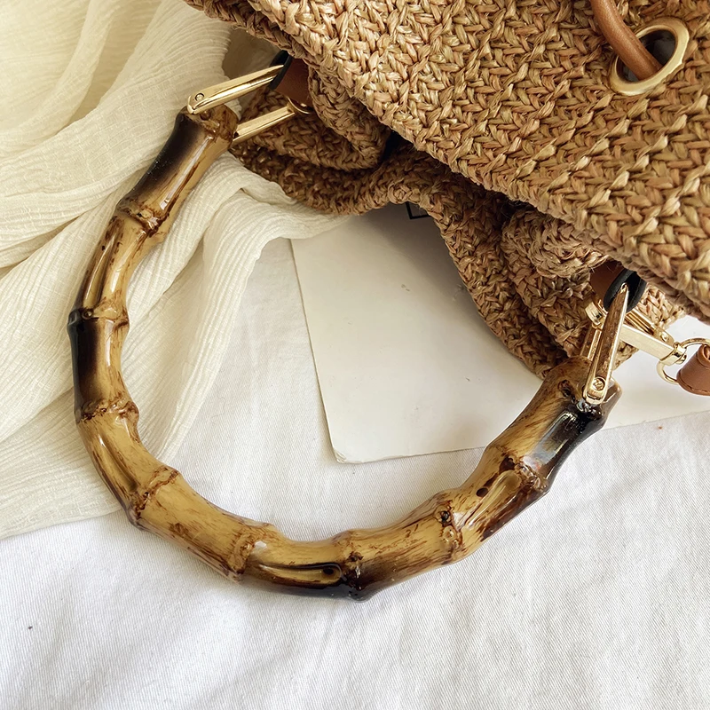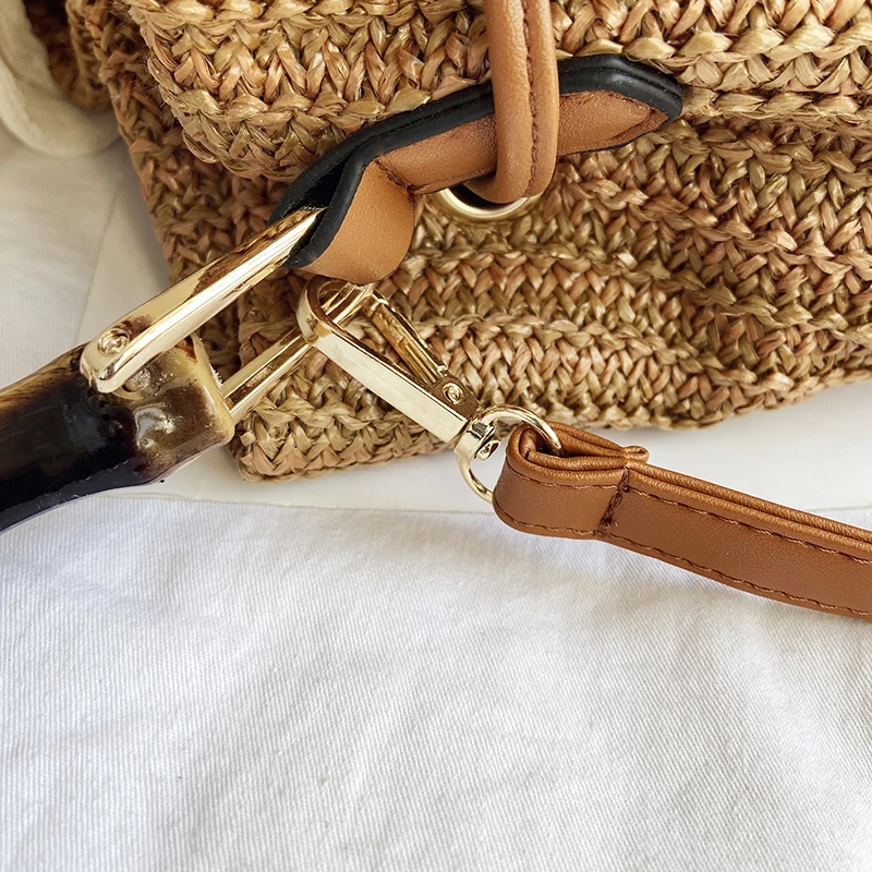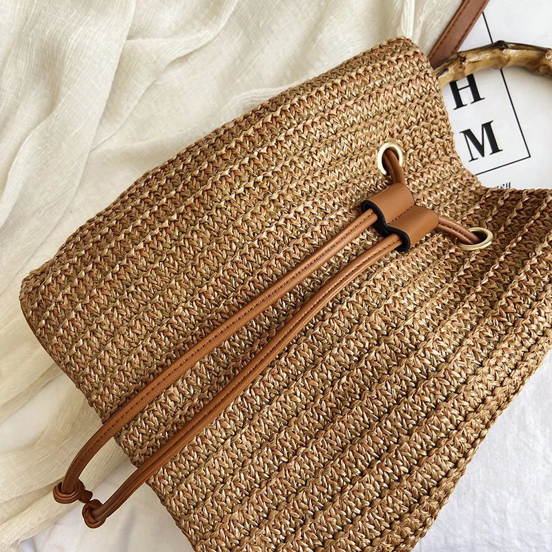 المرأة حقيبة الخيزران مقبض دلو حقيبة موضة المرأة حقيبة القش المنسوجة الكورية موضة حقيبة الكتف عادية الإناث Crossbody رسول