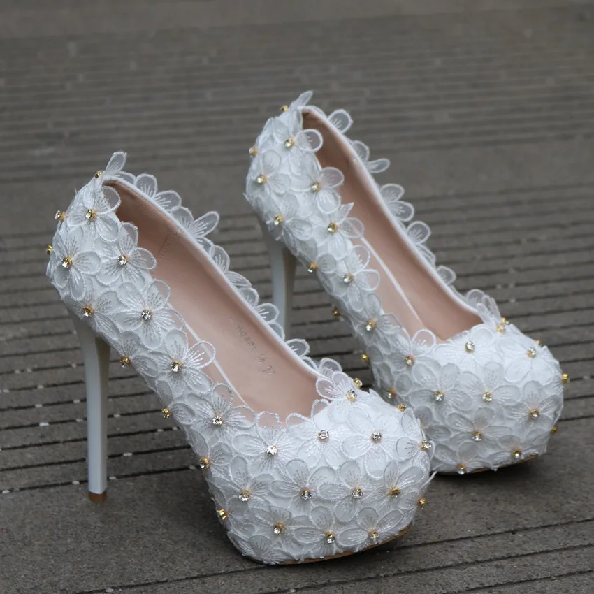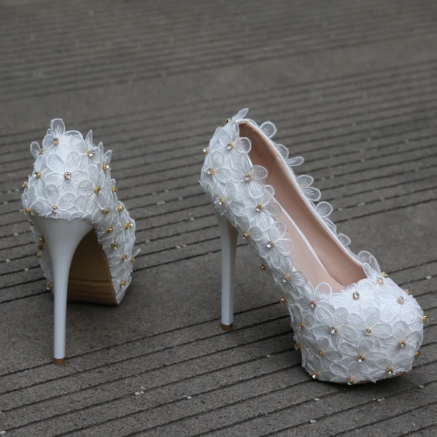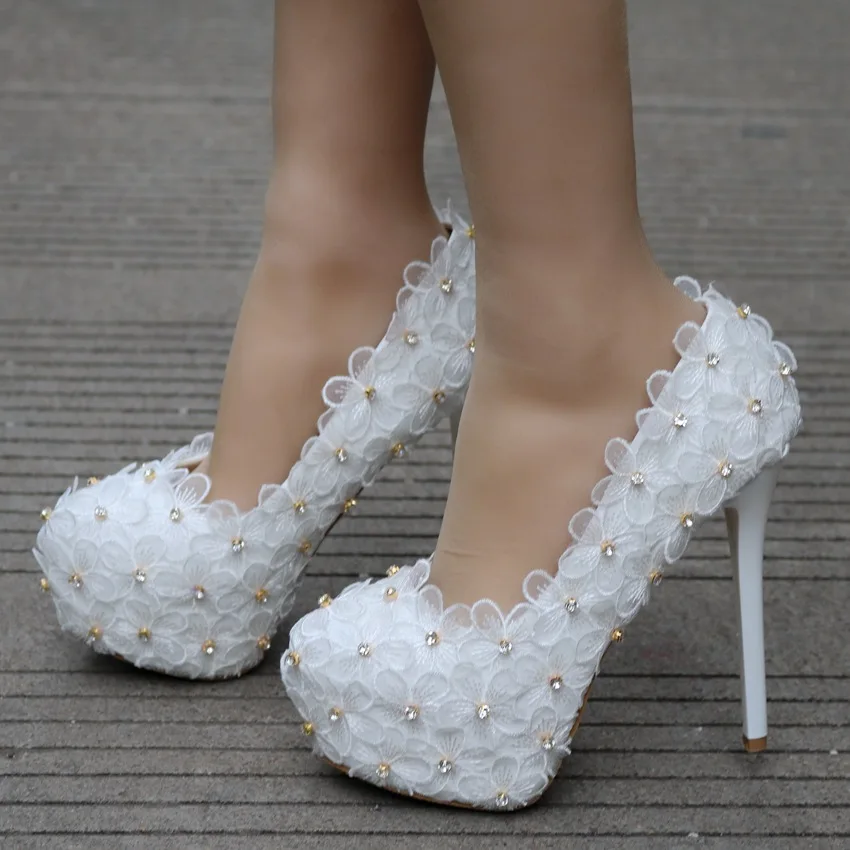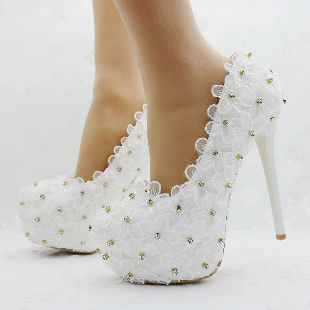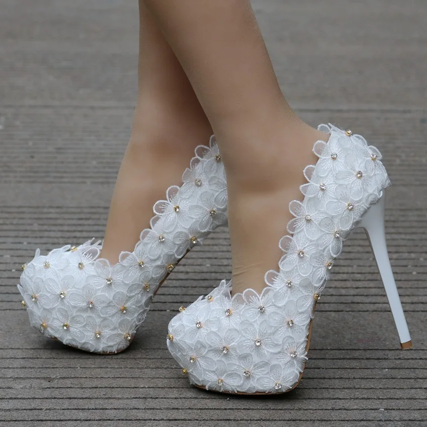 النساء أحذية مضخات فستان الدانتيل منصة مقاوم للماء جولة تو الكعوب رقيقة 14 سنتيمتر عالية الكعب المرأة أحذية الزفاف