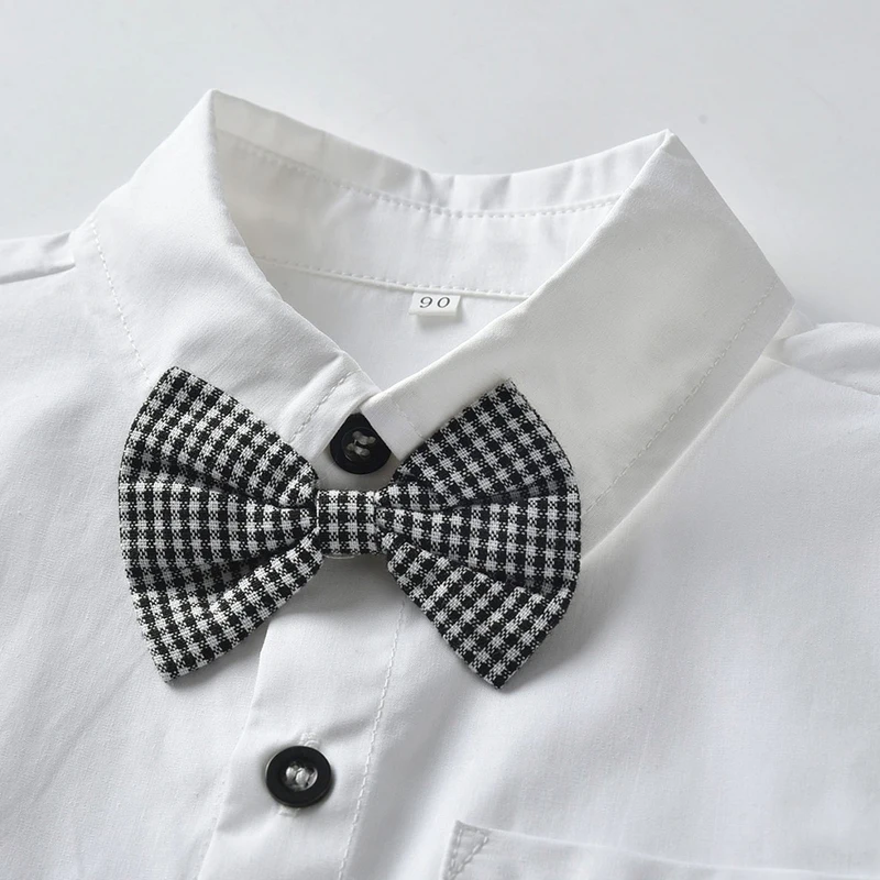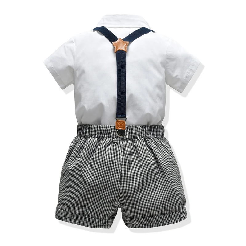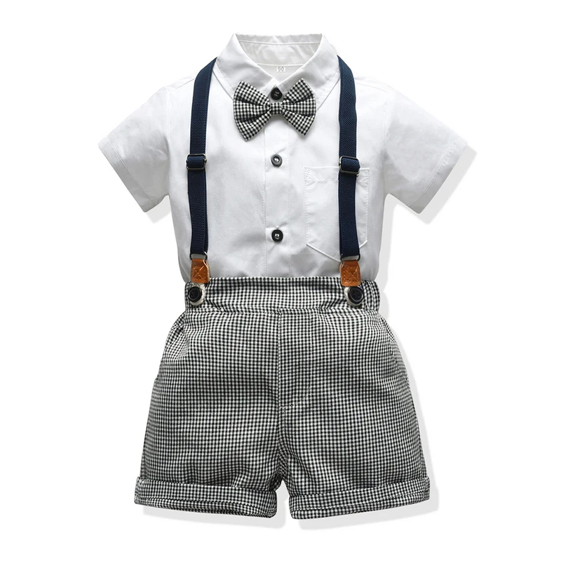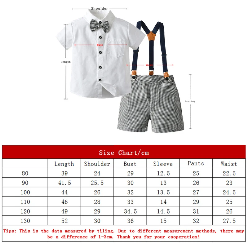 بلوزات علوية للأطفال الصبي ملابس الصيف مجموعة الأطفال Gentleman قصيرة الأكمام قمصان بلايز + السراويل وزرة 2 قطعة الزي ملابس طفل رضيع غير رسمية