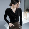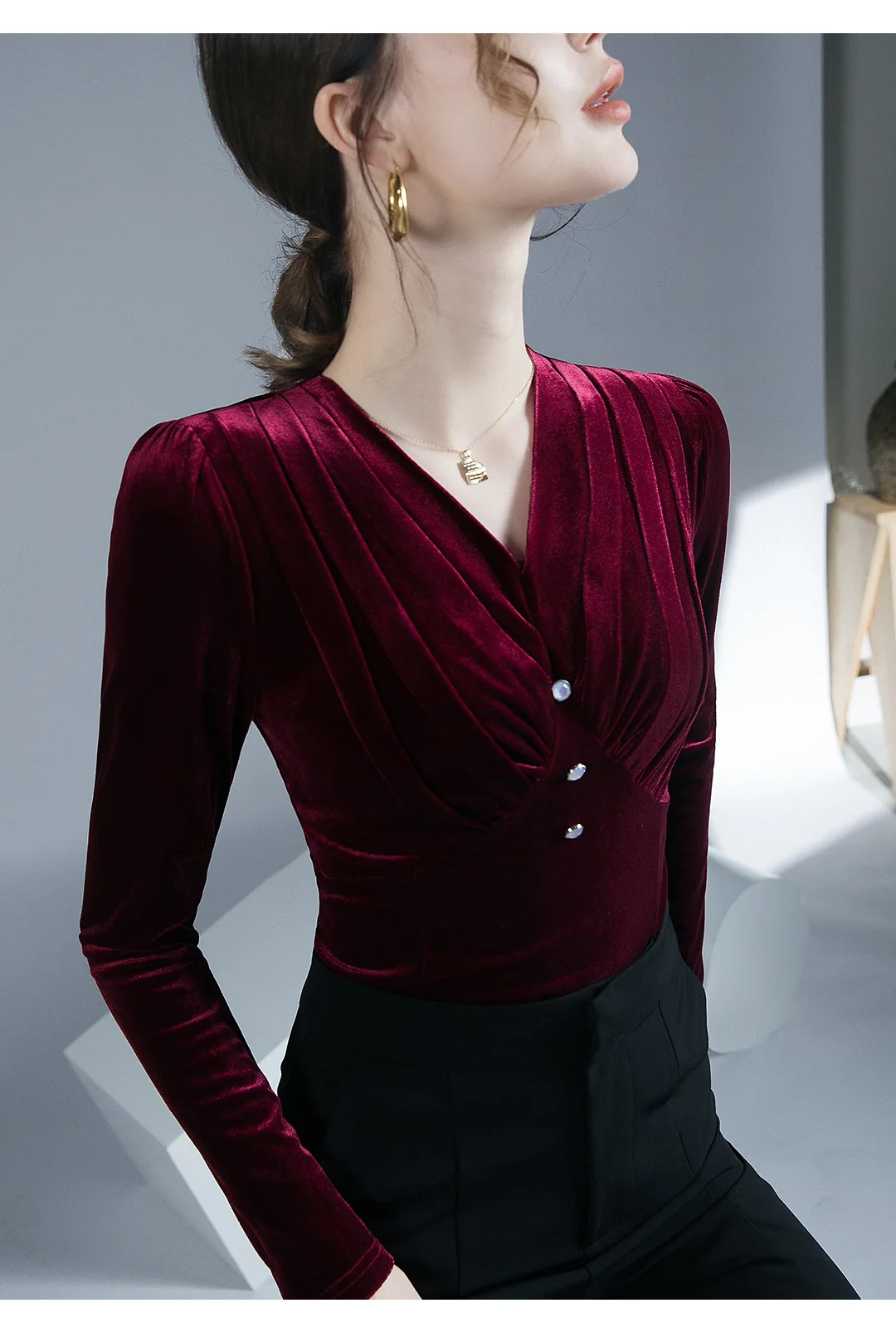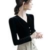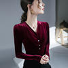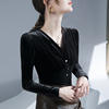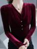 تيشيرتات قطيفة أنيقة كلاسيكية للنساء بأكمام طويلة طيات ناعمة أزرار رقبة على شكل حرف V تي شيرت نسائي تي شيرت نسائي بطيات لربيع الخريف