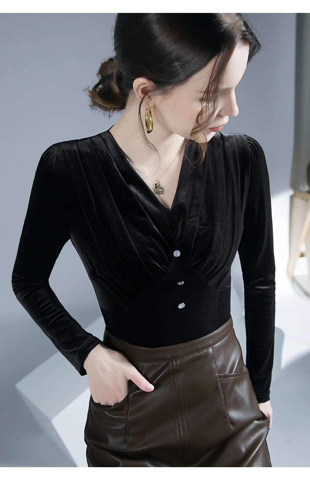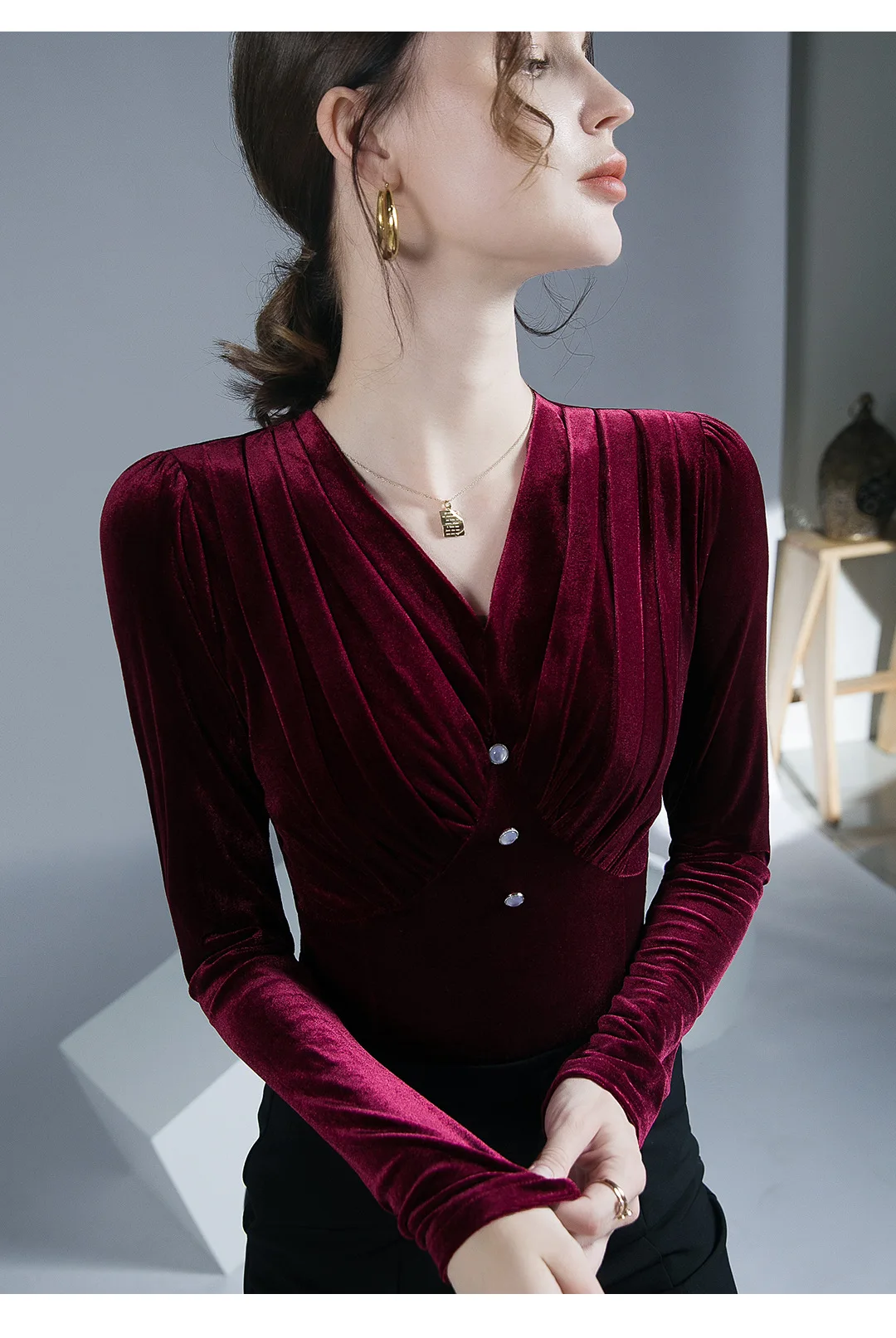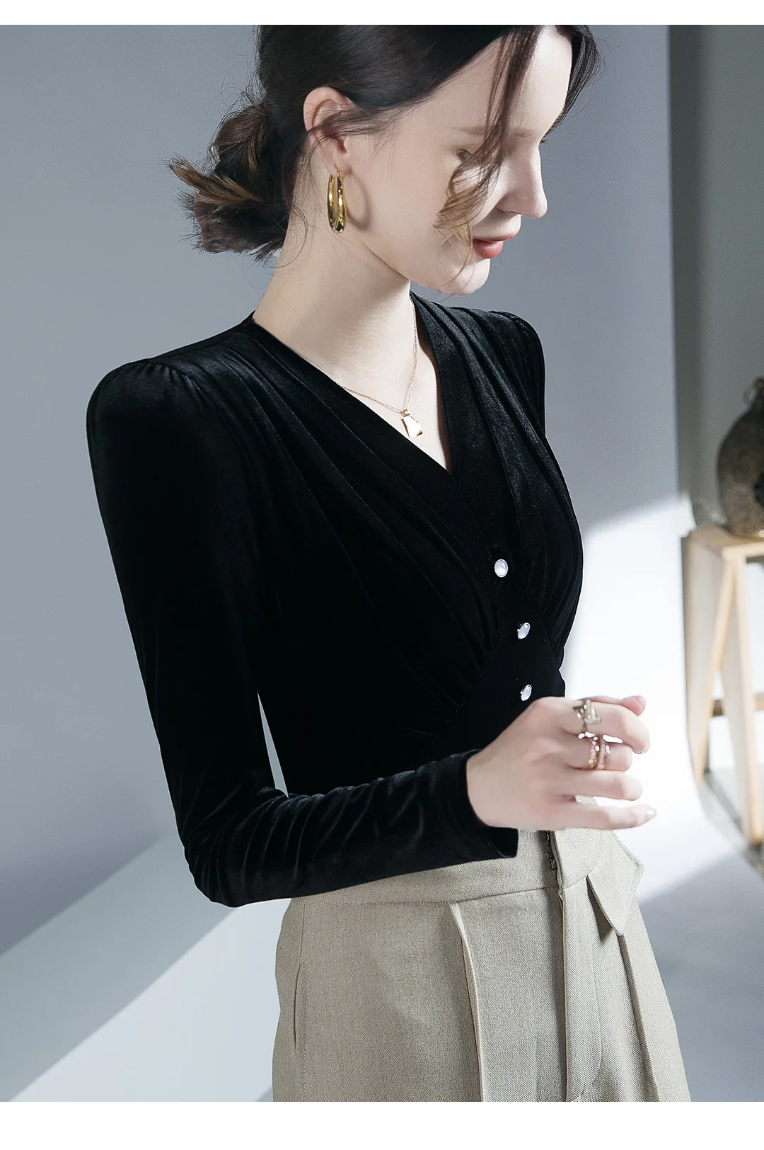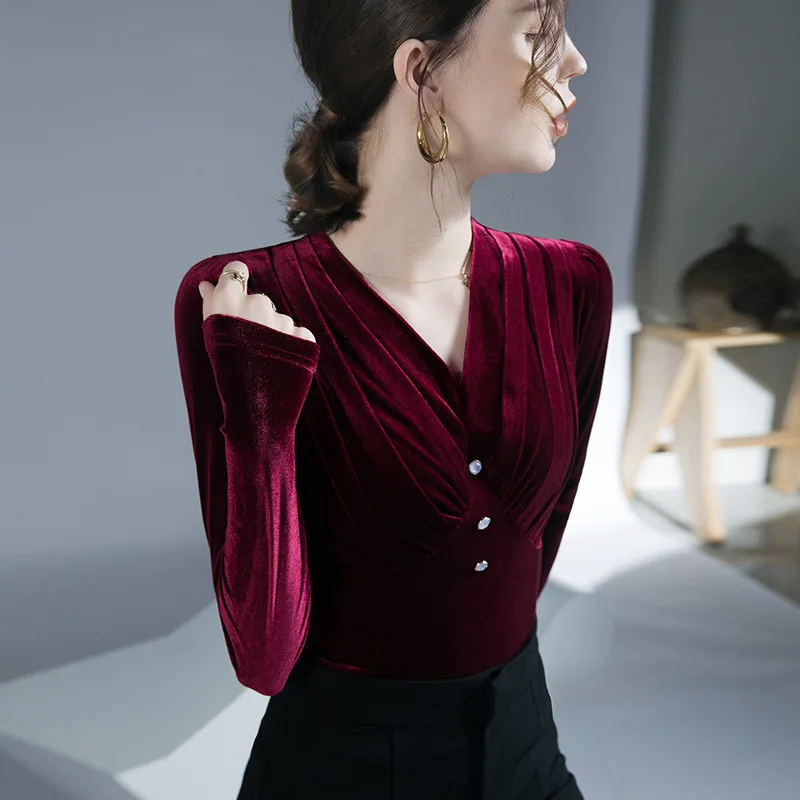 تيشيرتات قطيفة أنيقة كلاسيكية للنساء بأكمام طويلة طيات ناعمة أزرار رقبة على شكل حرف V تي شيرت نسائي تي شيرت نسائي بطيات لربيع الخريف