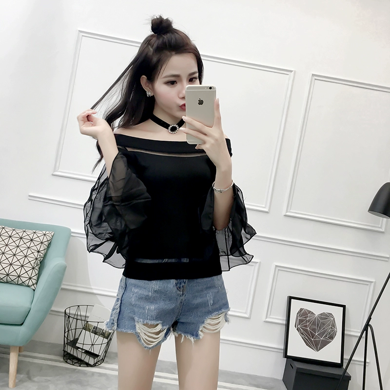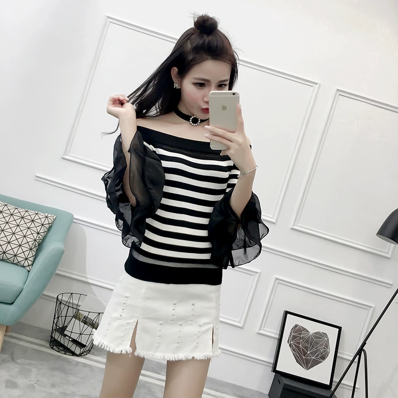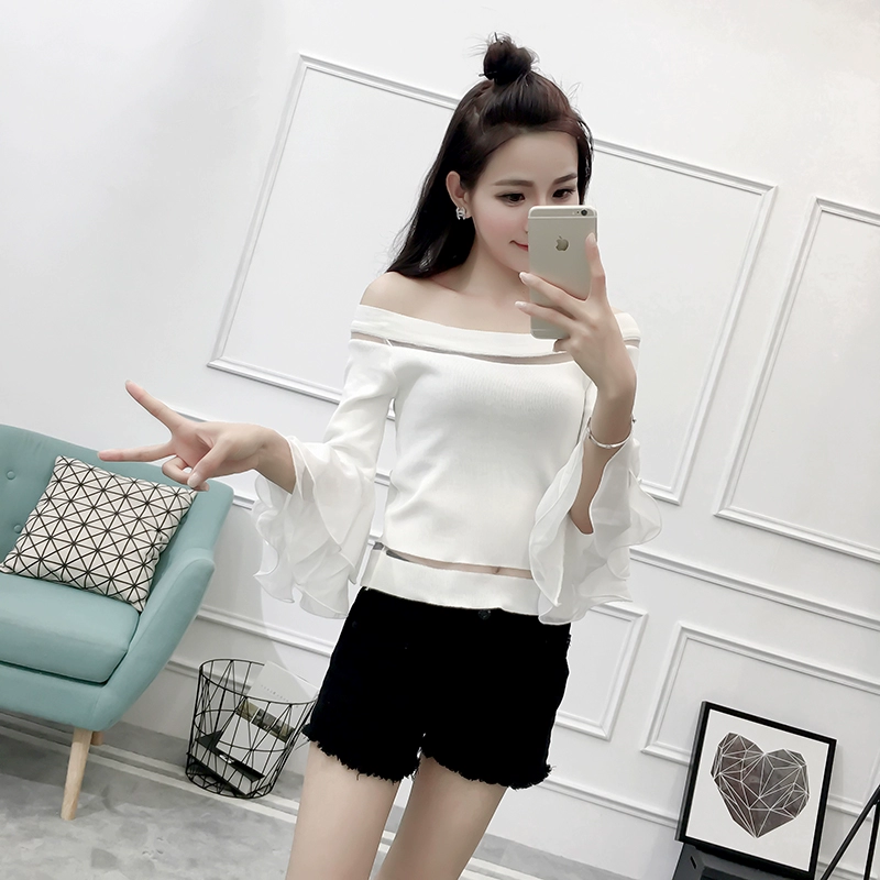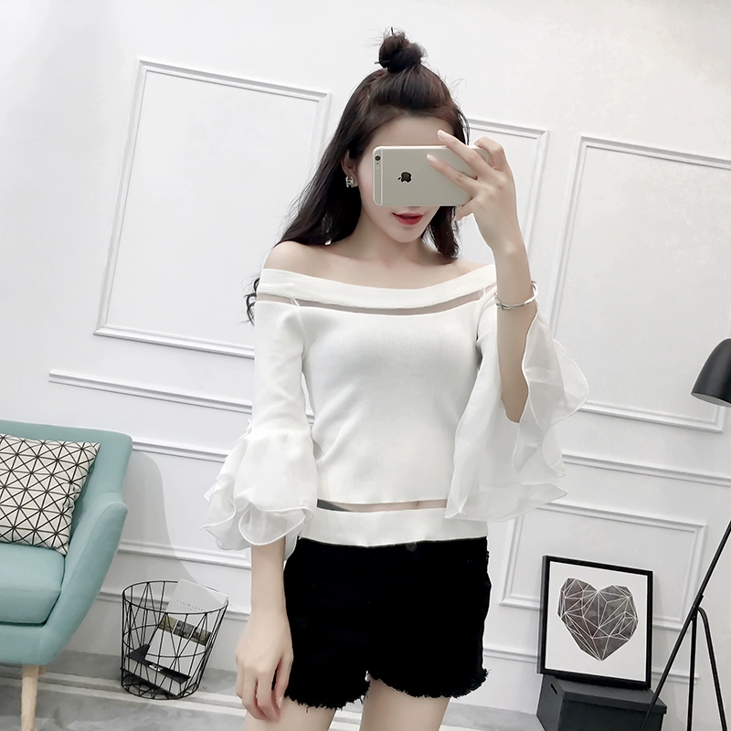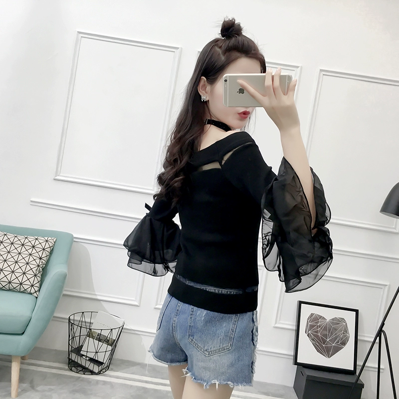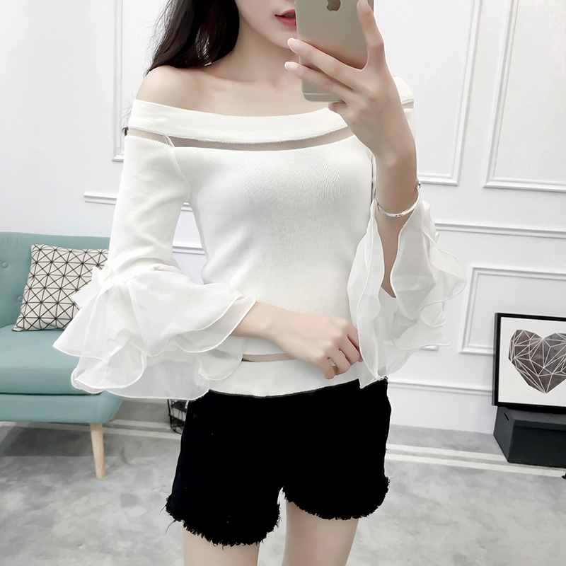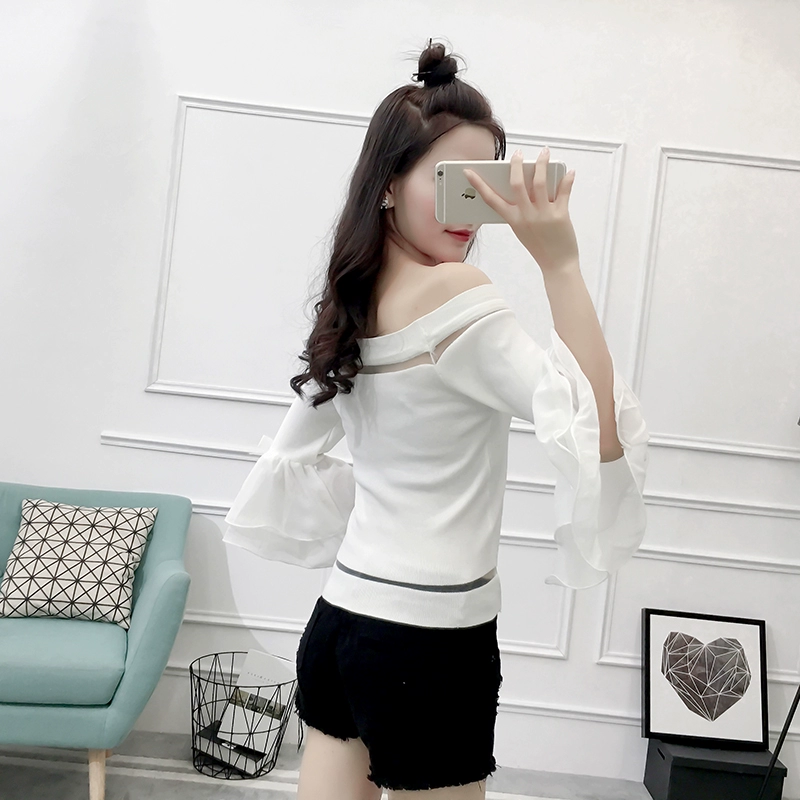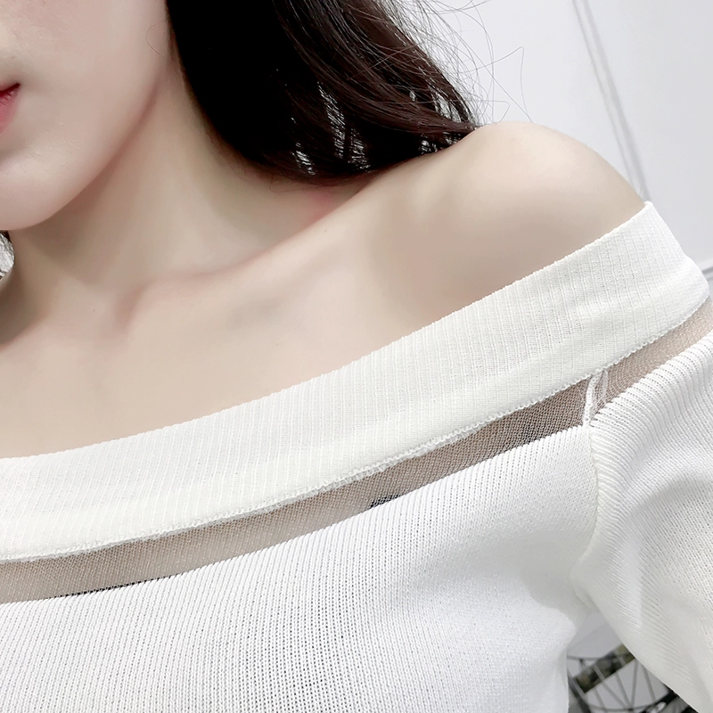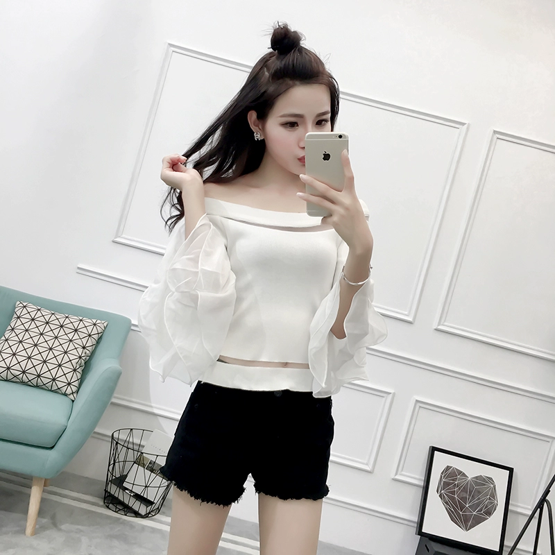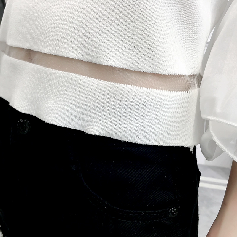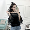 تي شيرت نسائي بأكمام من الشيفون ، منسوج نحيف ، أكتاف عارية ، واسع ، منسوج مرقع ، ياقة مائلة ، FL4730