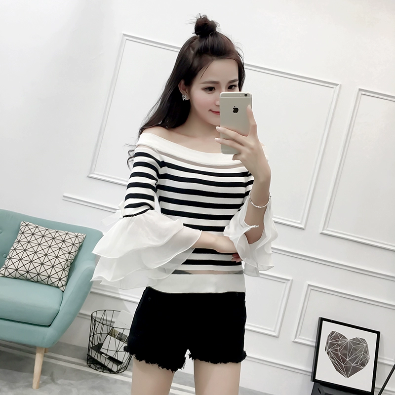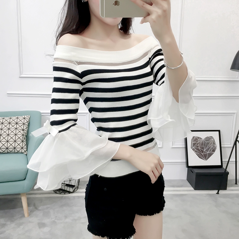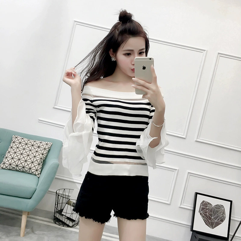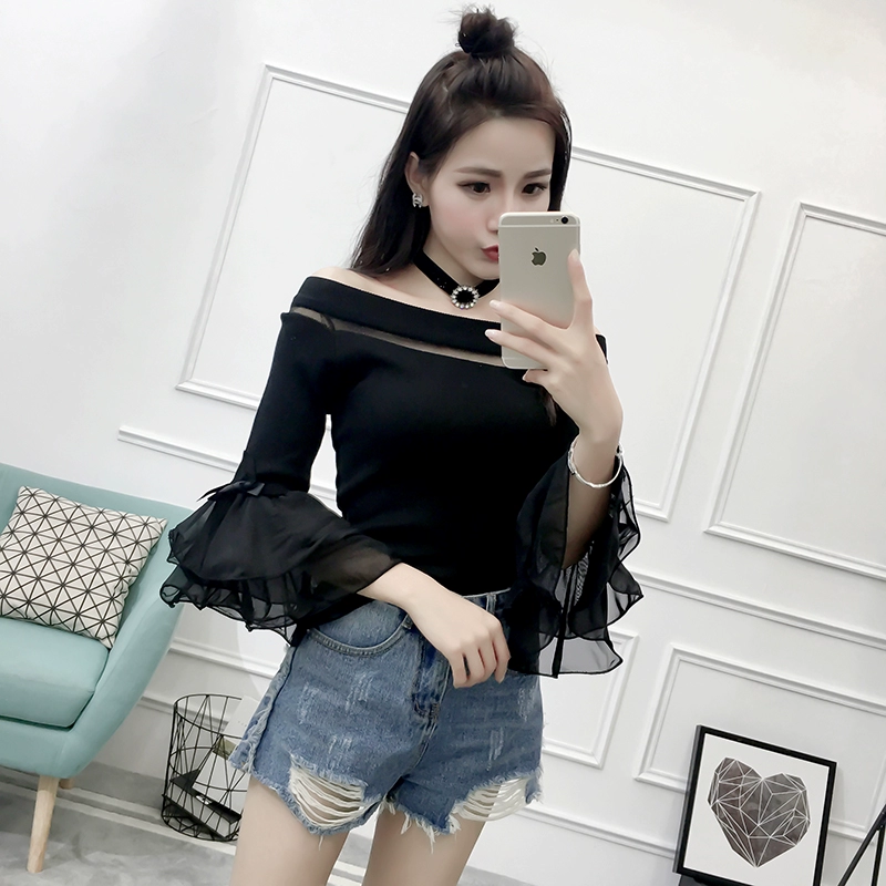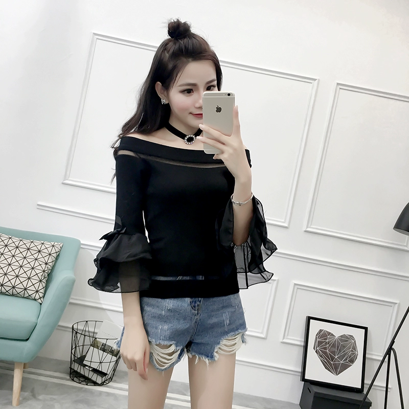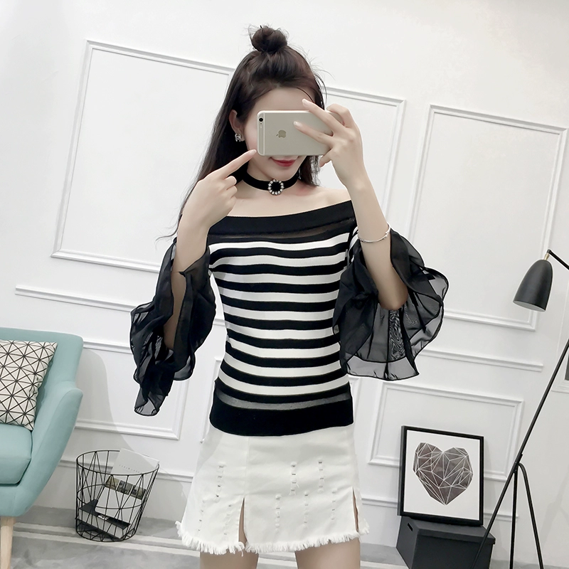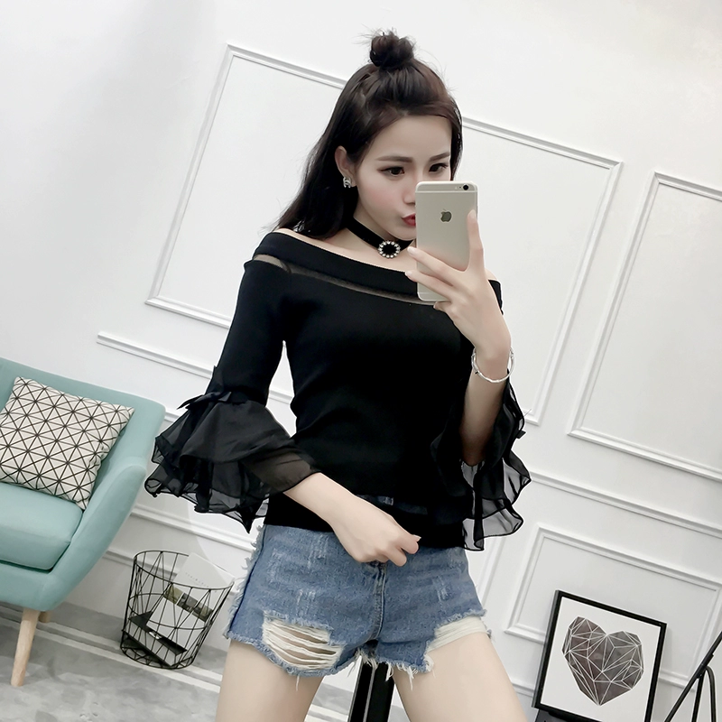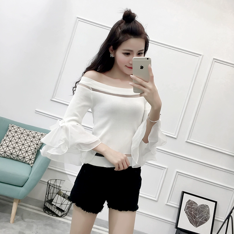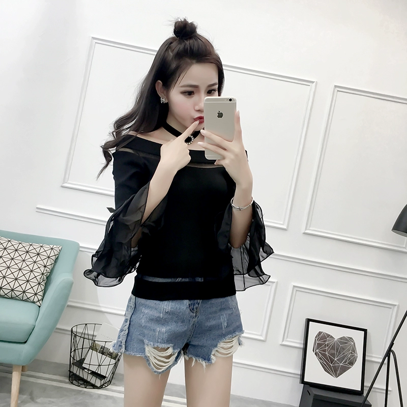 تي شيرت نسائي بأكمام من الشيفون ، منسوج نحيف ، أكتاف عارية ، واسع ، منسوج مرقع ، ياقة مائلة ، FL4730