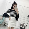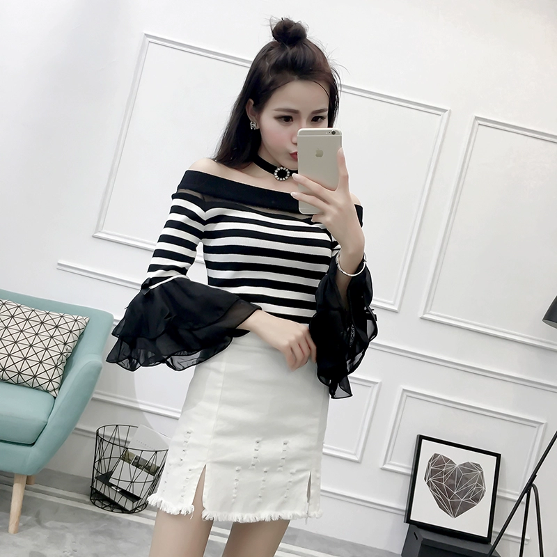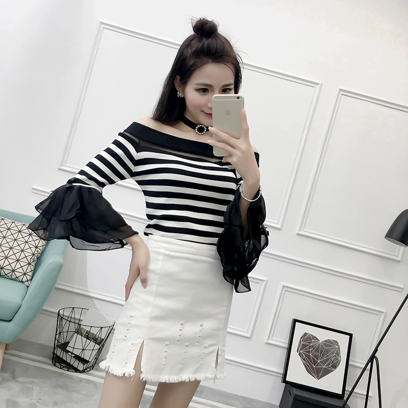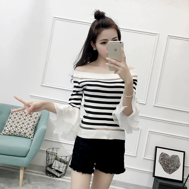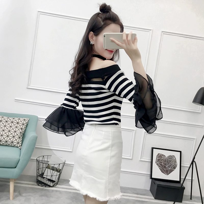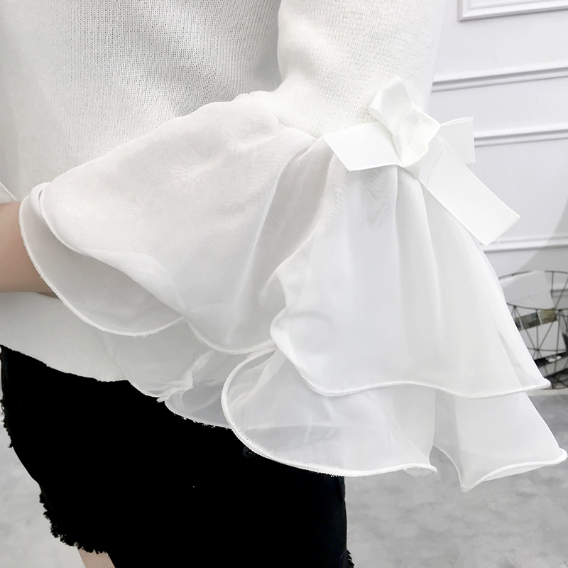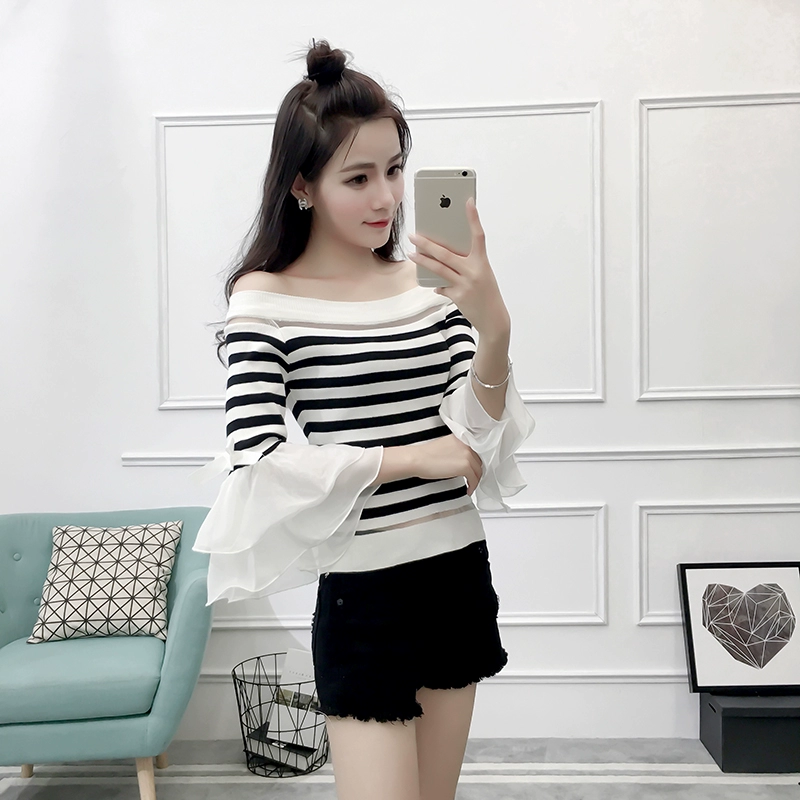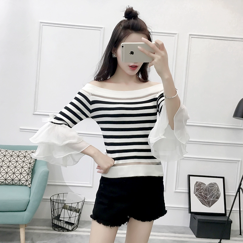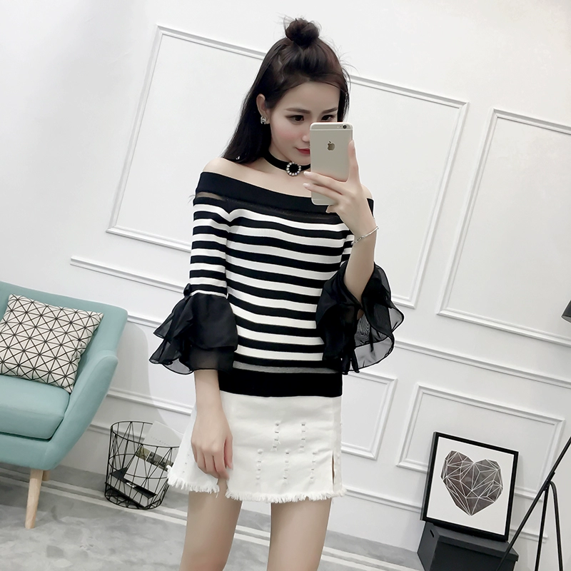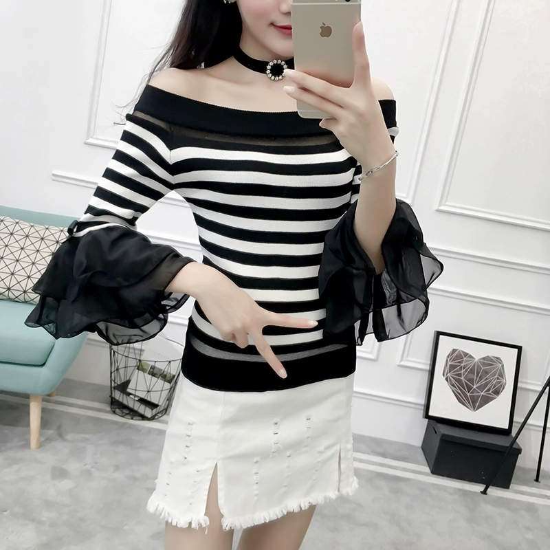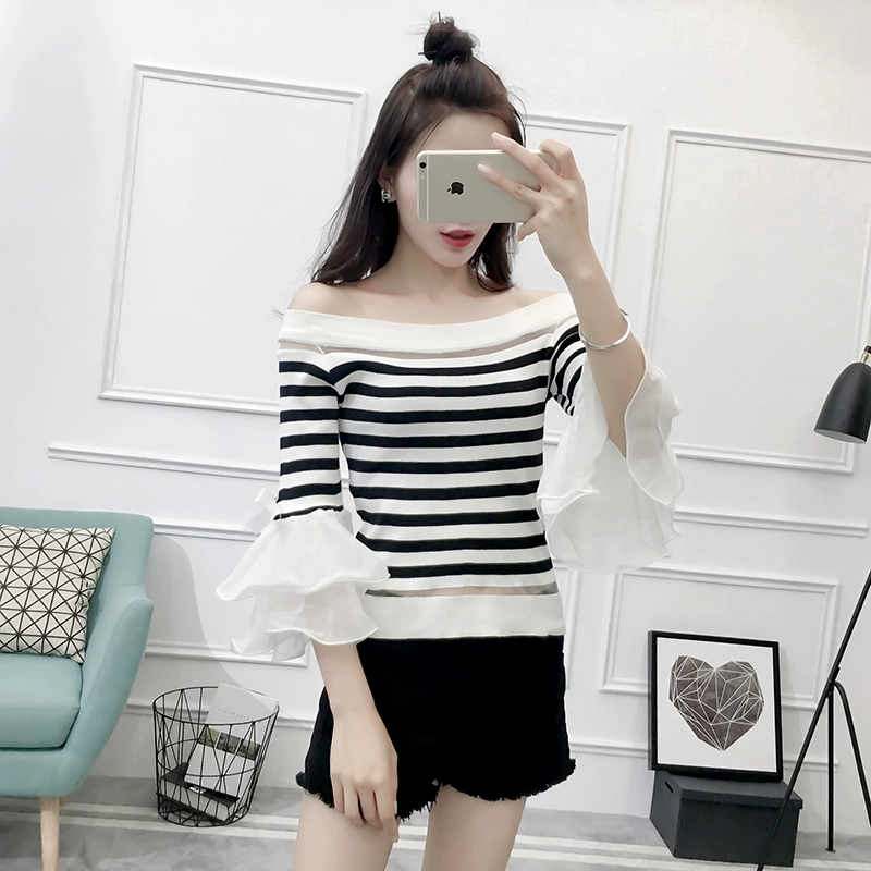 تي شيرت نسائي بأكمام من الشيفون ، منسوج نحيف ، أكتاف عارية ، واسع ، منسوج مرقع ، ياقة مائلة ، FL4730