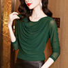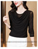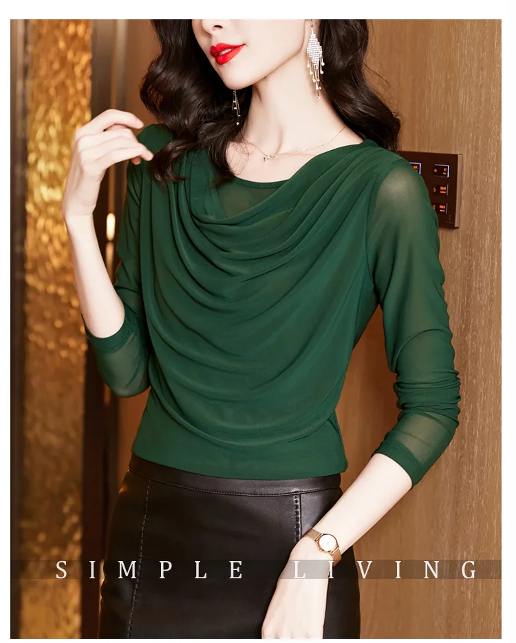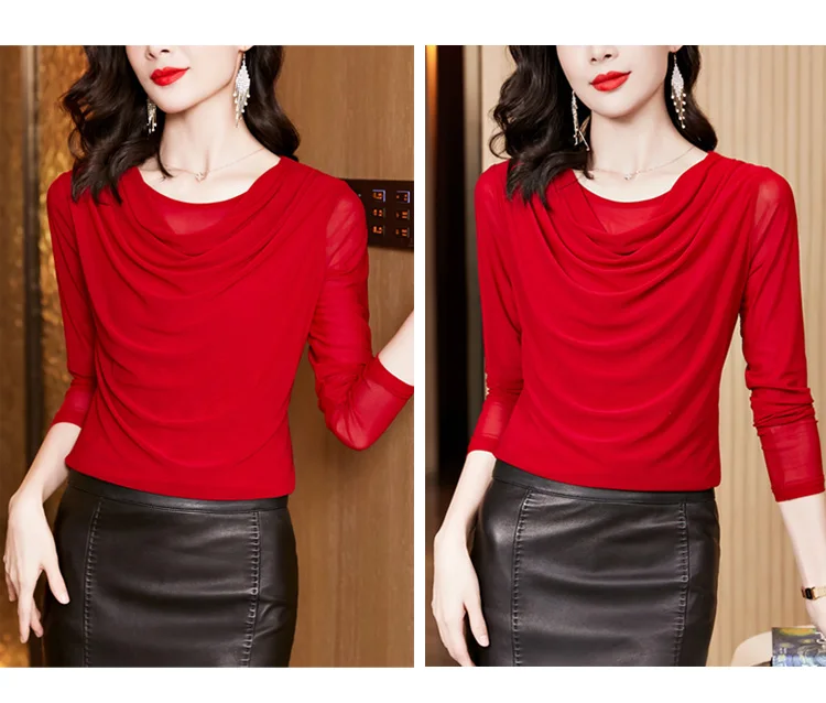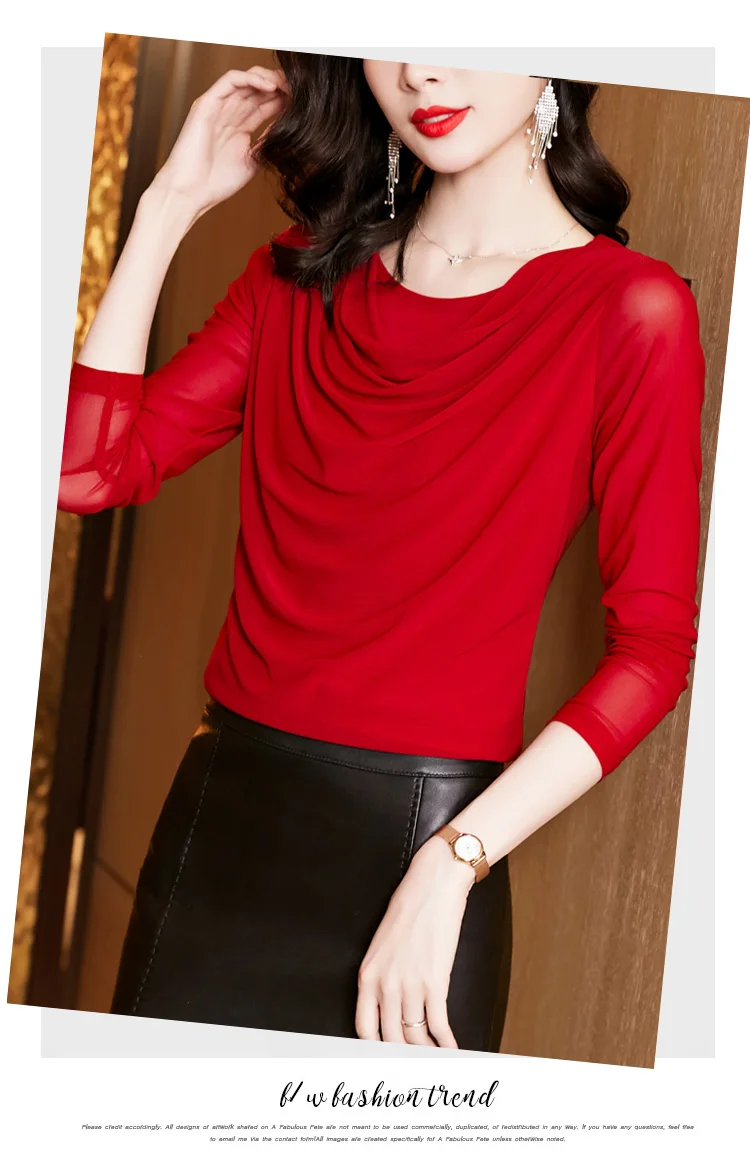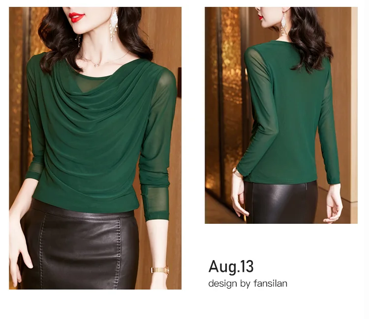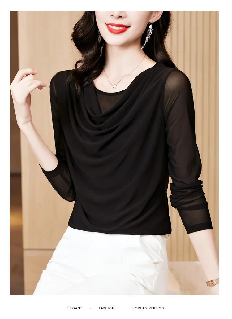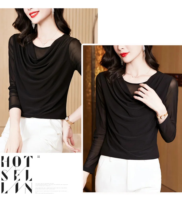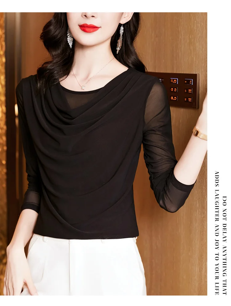 حجم M-3XL النساء لينة كم كامل تي شيرت سيدة أنيقة مطاطا الأسود بلايز تيز أنثى موضة شبكة تي شيرت
