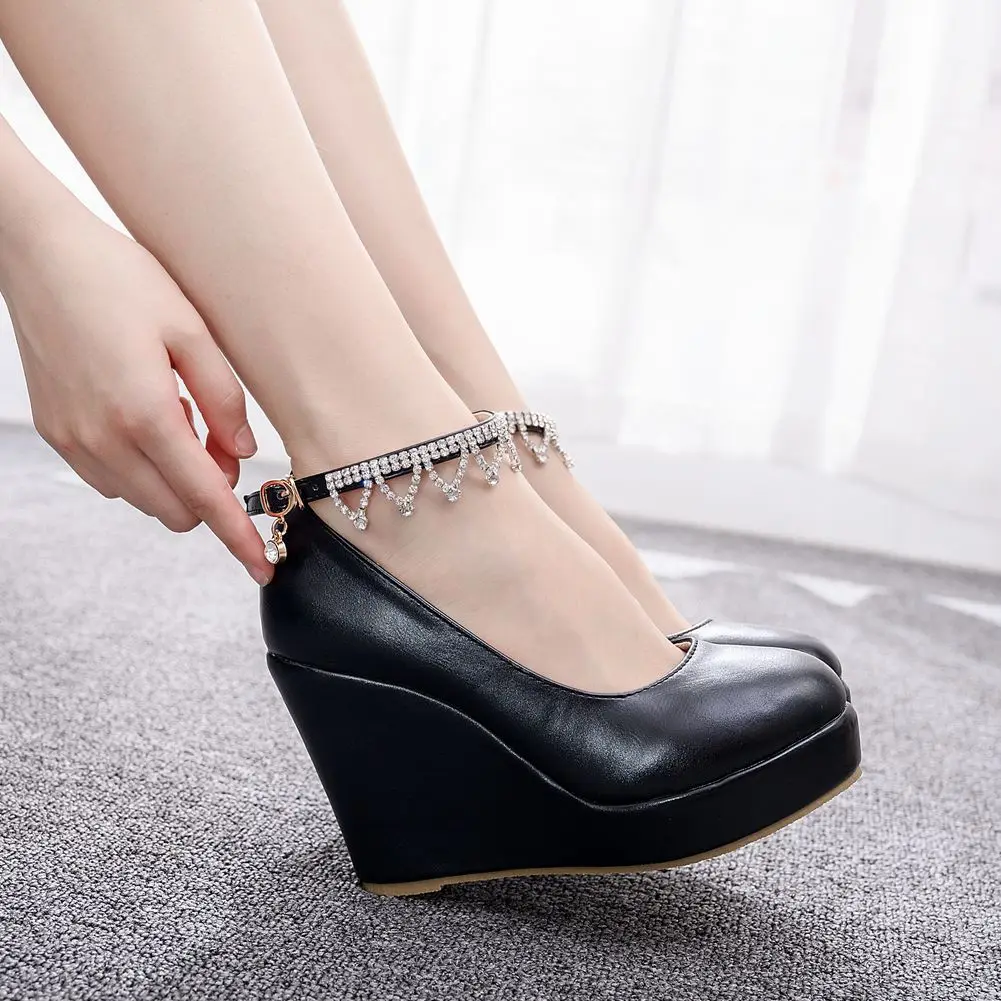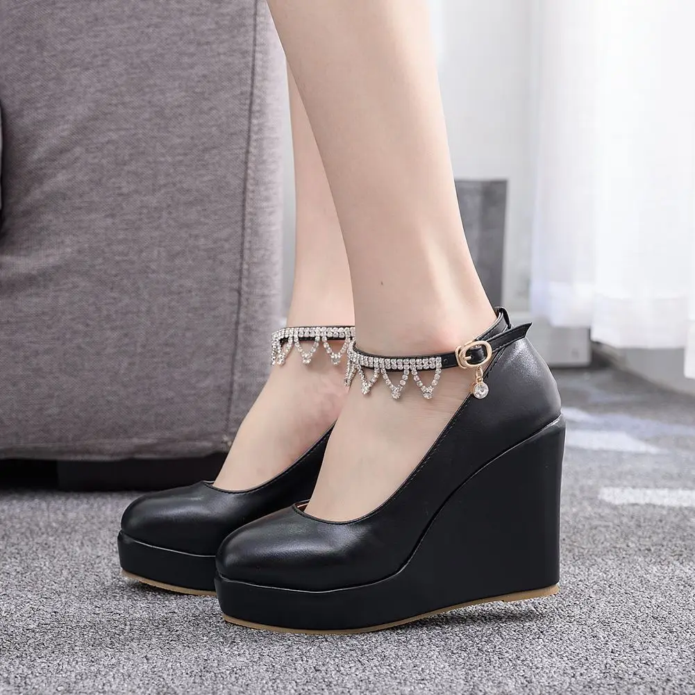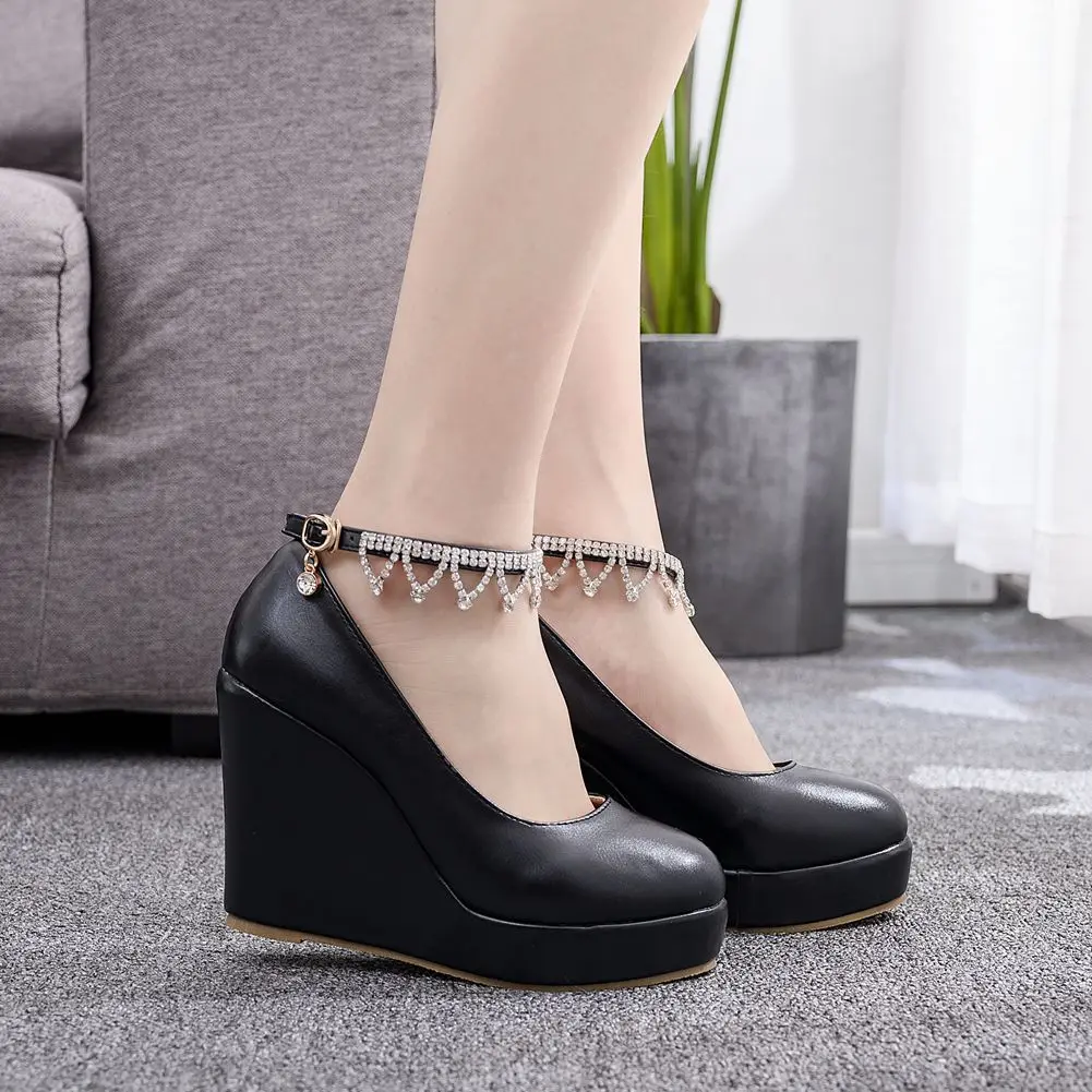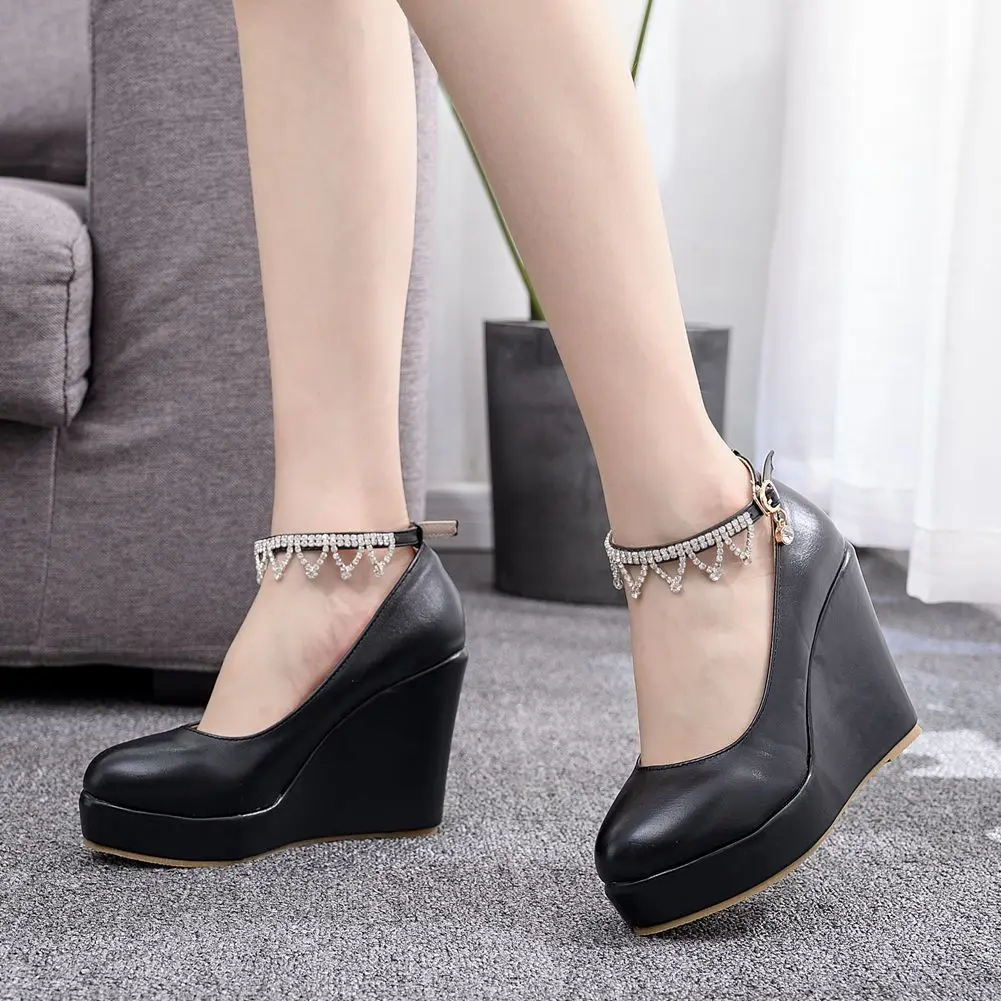 حذاء نسائي بكعب عالٍ بمقدمة دائرية ، حذاء نسائي بكعب ويدج 10.8 سنتيمتر ، حذاء مكتب عصري مثير