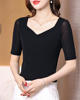 شبكة نصف كم تي شيرت المرأة الربيع الصيف الأسود تي شيرت الخامس الرقبة بلايز فام بسط تي شيرت