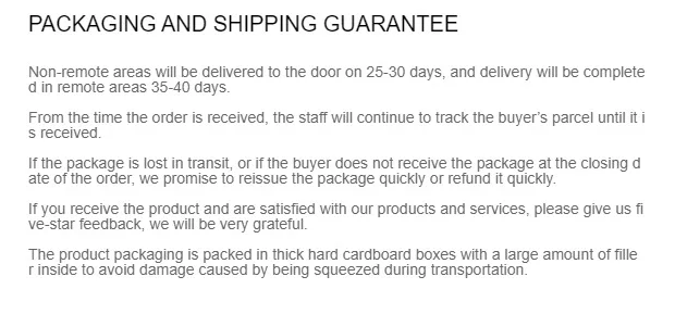• ضمان استرداد الأموال: هل هناك شيء غير صحيح تمامًا؟ إذا لم تكن راضيًا تمامًا عن مشترياتك ، فيمكنك إرجاعها في غضون 15 يومًا لاسترداد الأموال بالكامل
