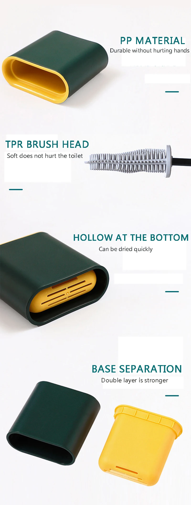 1. [360 درجة رأس فرشاة مطاطية]: شعيرات TPR الناعمة (المطاط الحراري) لن تخدش سطح المرحاض. شعيرات السيليكون لديها قدرة تنظيف جيدة ، يمكن أن تدخل حافة مقعد المرحاض ، وهي مادة جيدة ضد الماء الصلب. فإنه لا التقاط الأوساخ وسهلة التنظيف ، لا ارتداء أو إسقاط شكله ، وذلك للحفاظ على تأثير تنظيف مثالي.