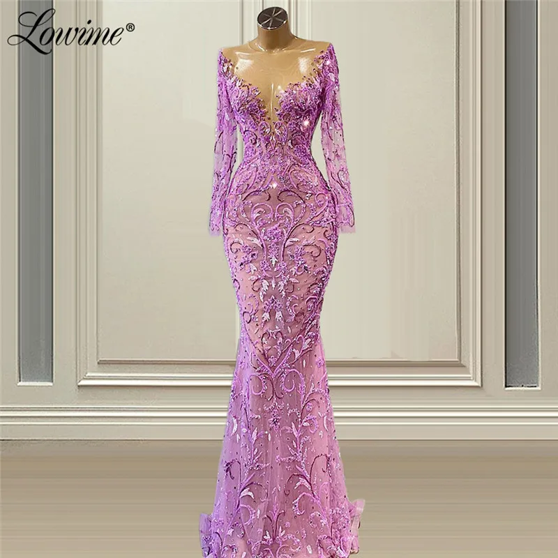 فساتين سهرة Lowime الوهم دانتيل أرجواني حورية البحر العربية بأكمام طويلة دبي مطرز فستان حفلات رسمي نسائي
