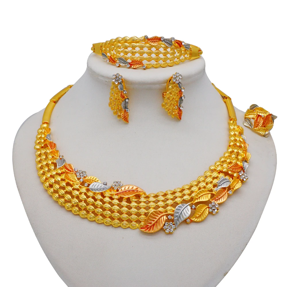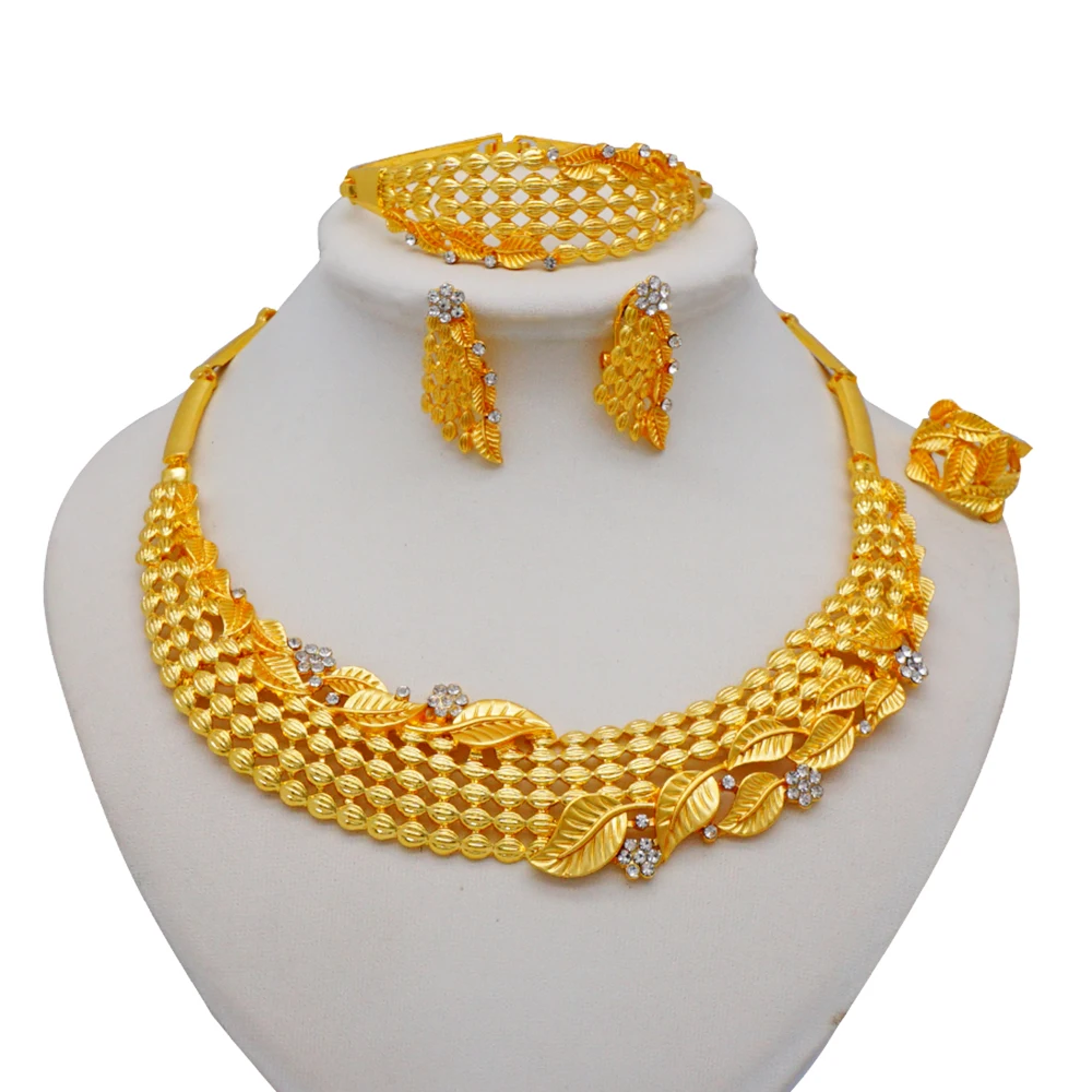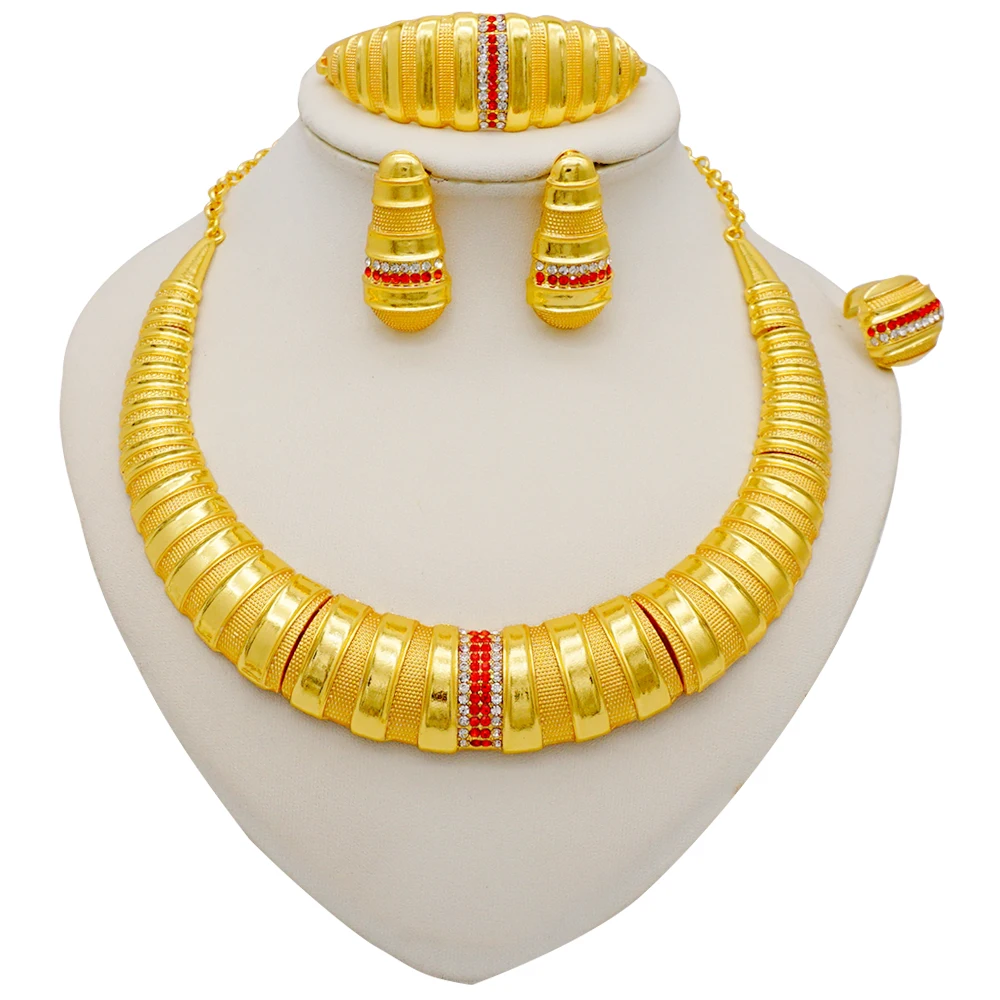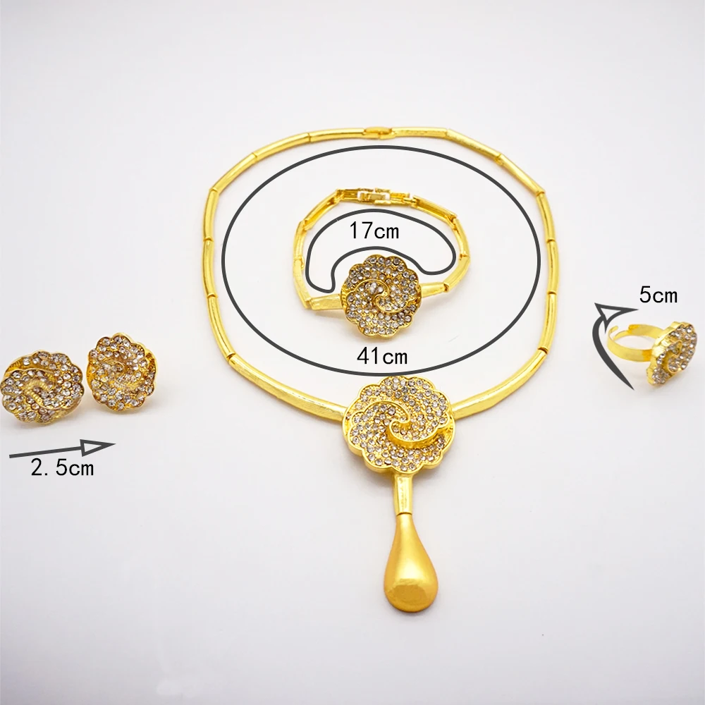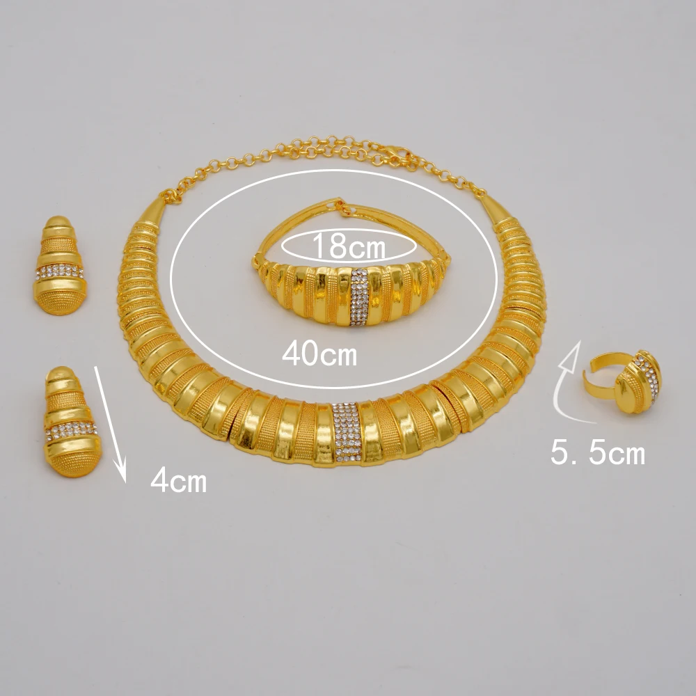 قلادة مجموعات للنساء دبي الذهب الأفريقي اللون طقم مجوهرات العروس أقراط خواتم الهندي النيجيري مجوهرات الزفاف مجموعة هدية