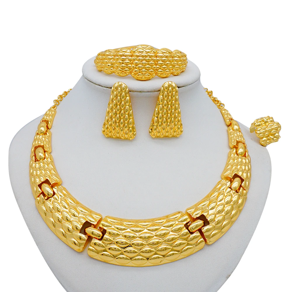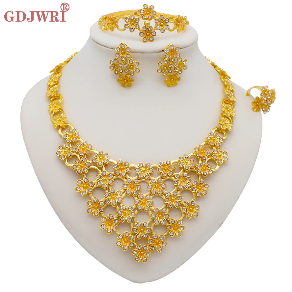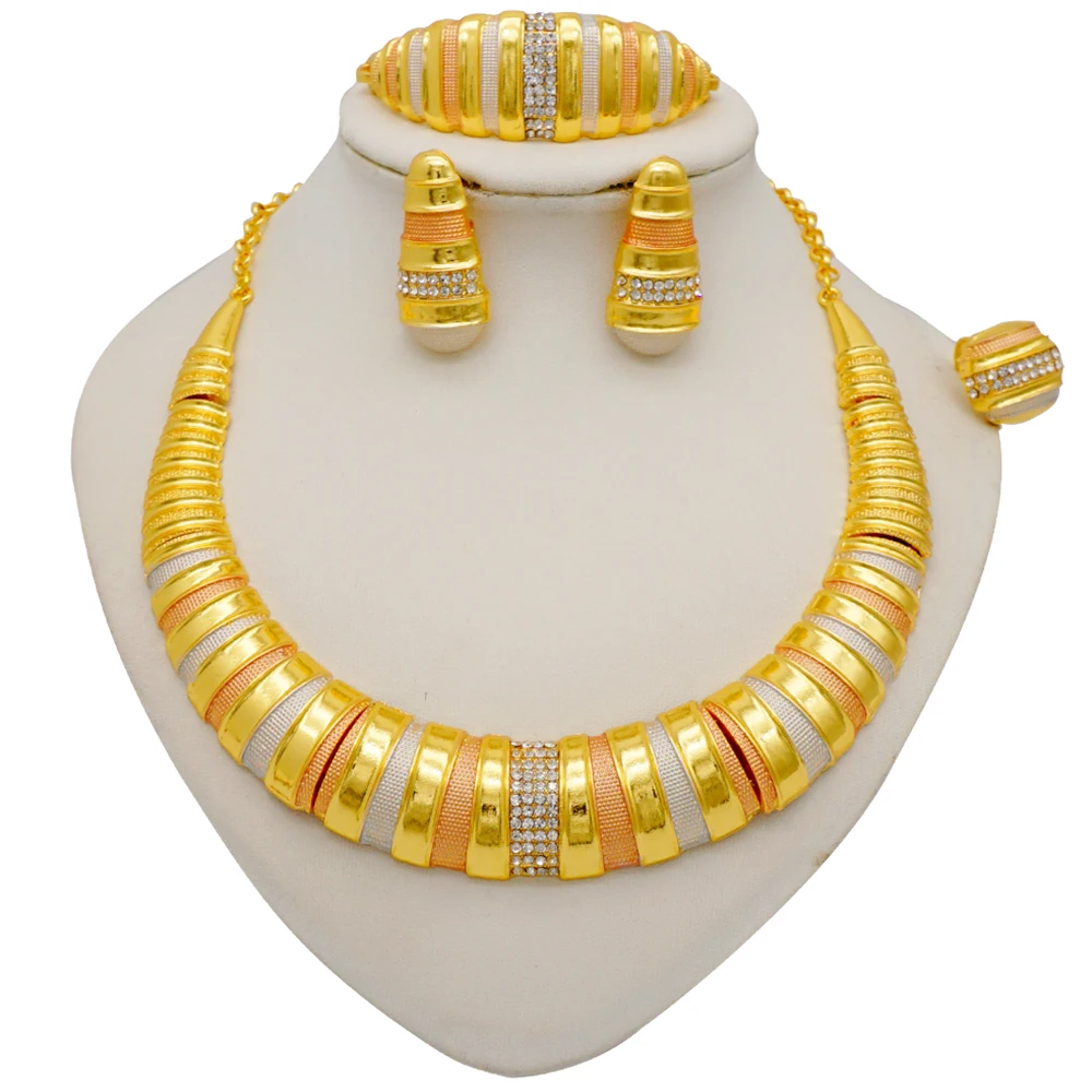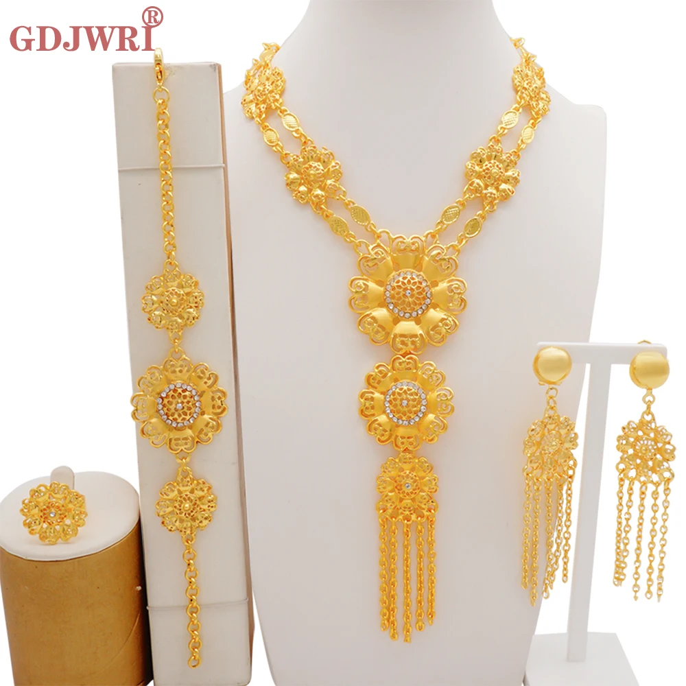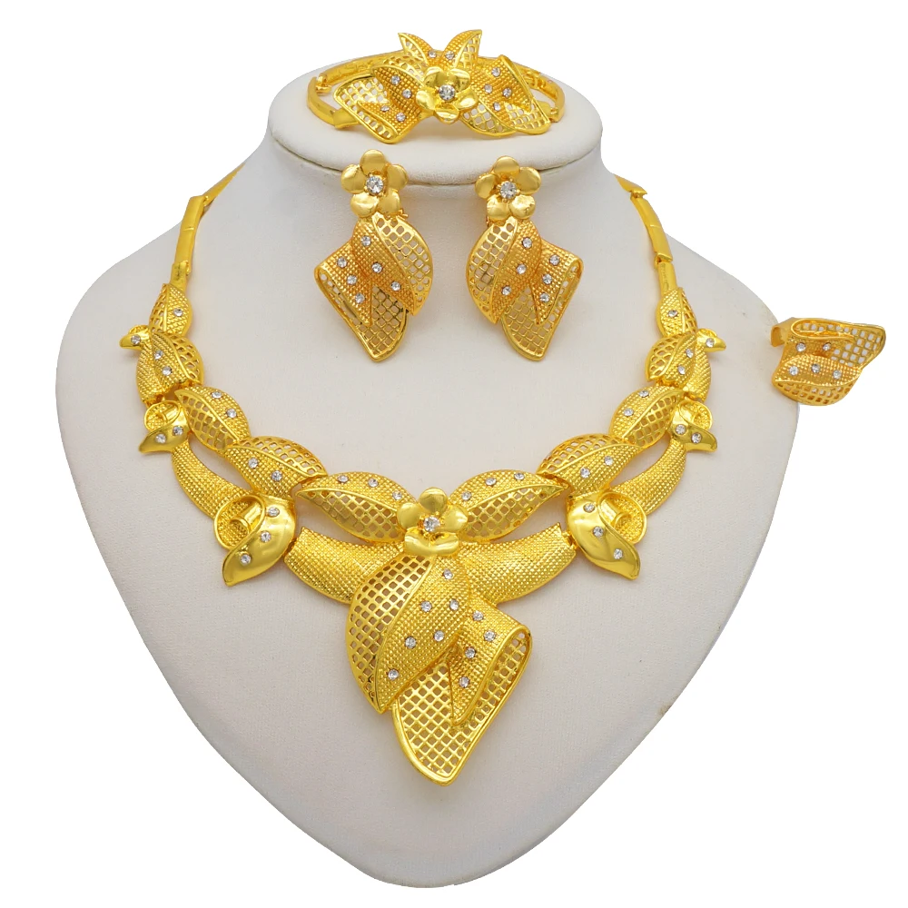 قلادة مجموعات للنساء دبي الذهب الأفريقي اللون طقم مجوهرات العروس أقراط خواتم الهندي النيجيري مجوهرات الزفاف مجموعة هدية