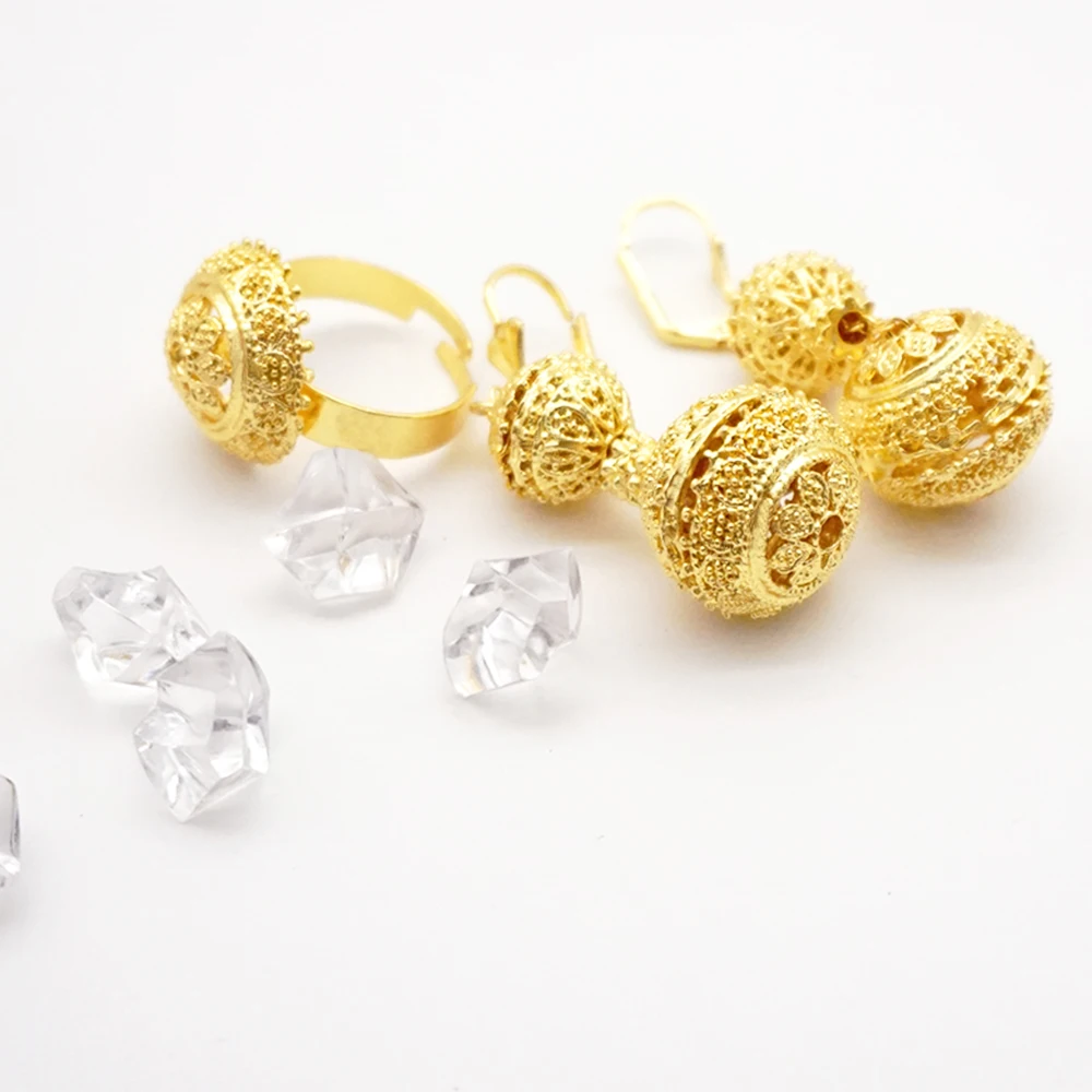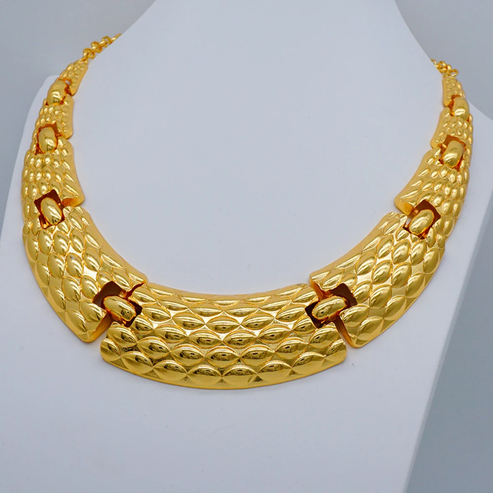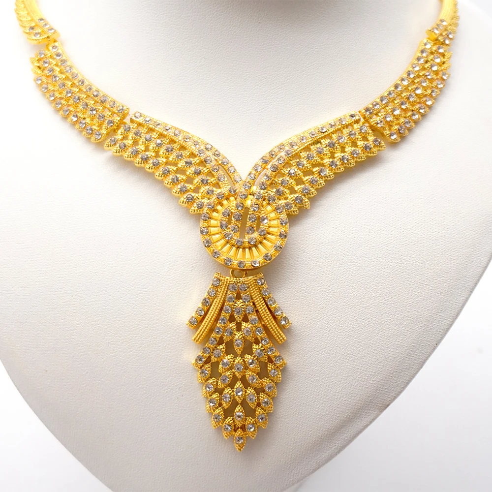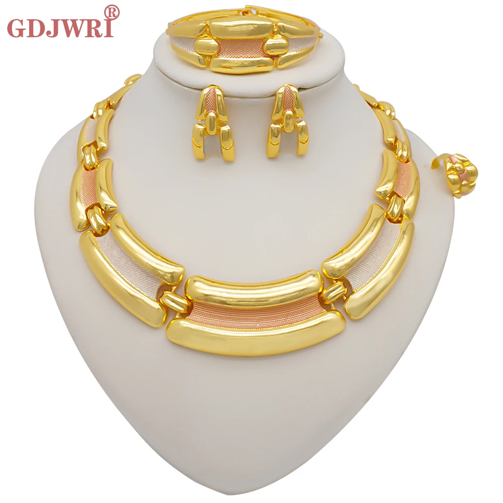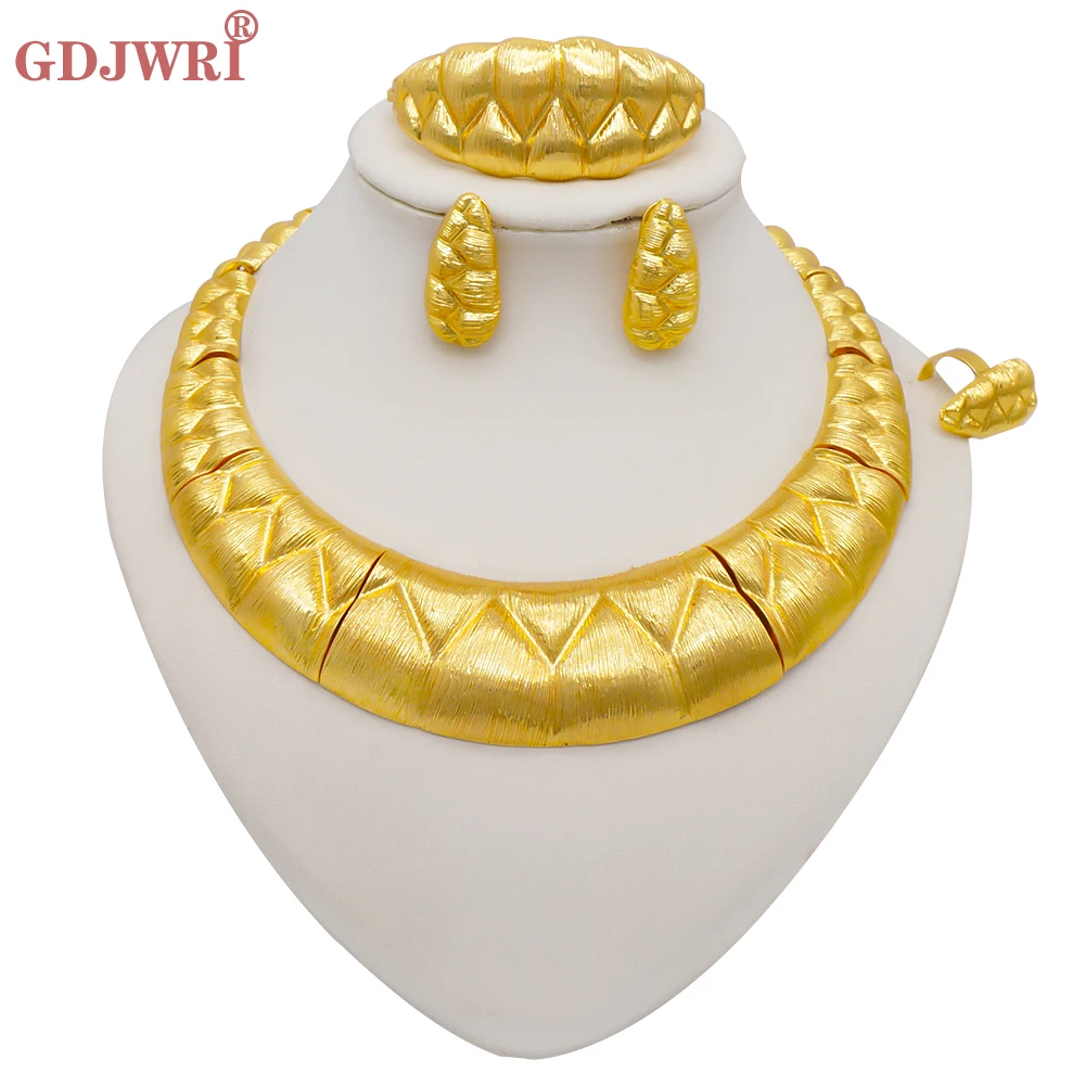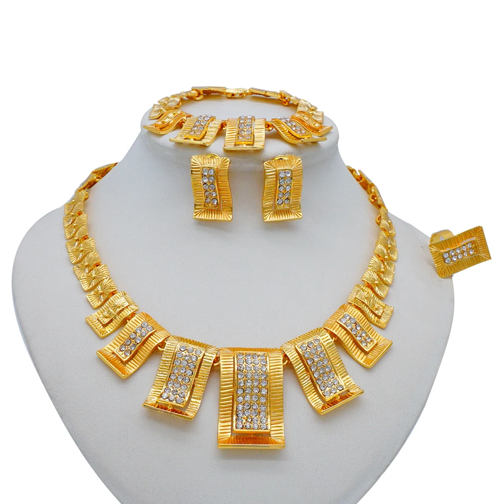 قلادة مجموعات للنساء دبي الذهب الأفريقي اللون طقم مجوهرات العروس أقراط خواتم الهندي النيجيري مجوهرات الزفاف مجموعة هدية