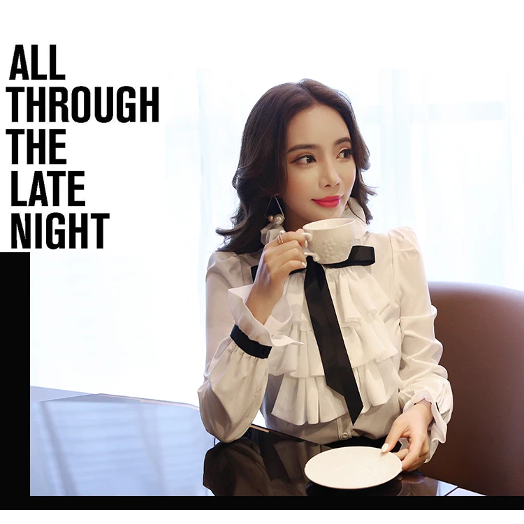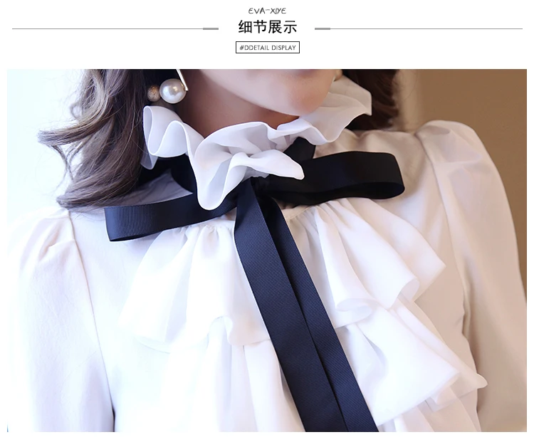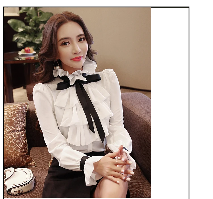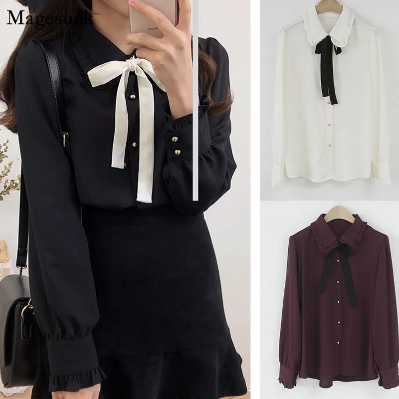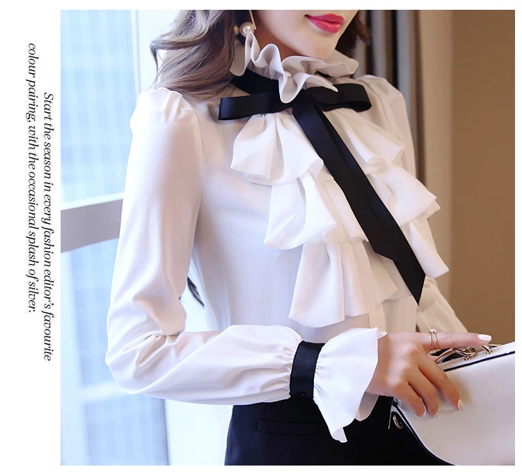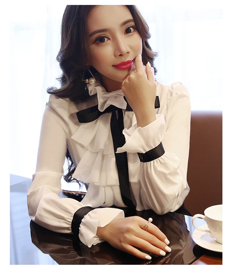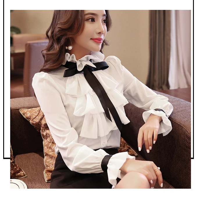 كارديجان نسائي بأكمام طويلة مع فيونكة واسعة ، بلوزة مكتب بيضاء مع كشكش ، قميص شيفون سادة ، ملابس نسائية 2020 ، خريف 11101