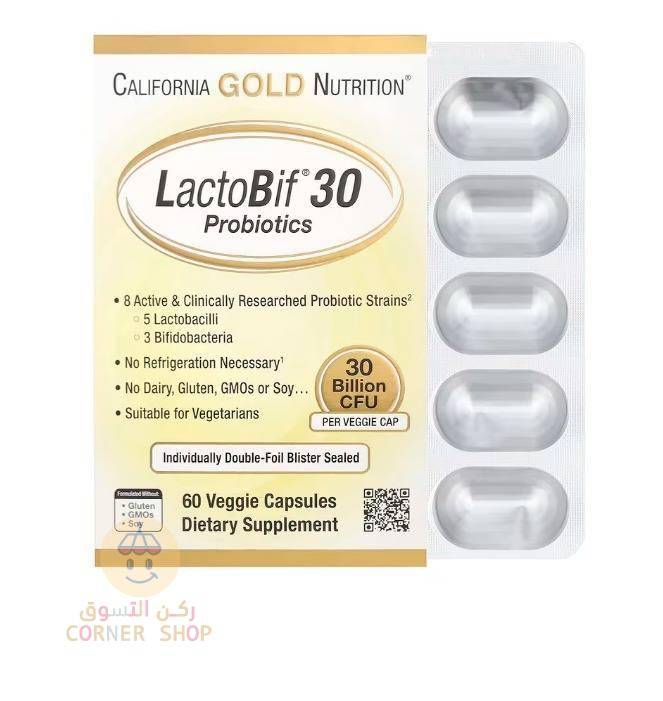 بروبيوتيك California Gold Nutrition LactoBif 30 مليار CFU لتعزيز صحة الجهاز الهضمي والمناعة، متوفر الآن في متجر ركن التسوق مع خدمة التوصيل السريع داخل اليمن.