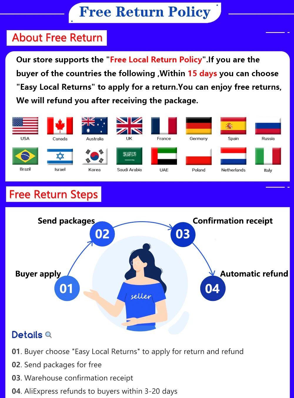 • ضمان استرداد الأموال: هل هناك شيء غير صحيح تمامًا؟ إذا لم تكن راضيًا تمامًا عن مشترياتك ، فيمكنك إرجاعها في غضون 15 يومًا لاسترداد الأموال بالكامل