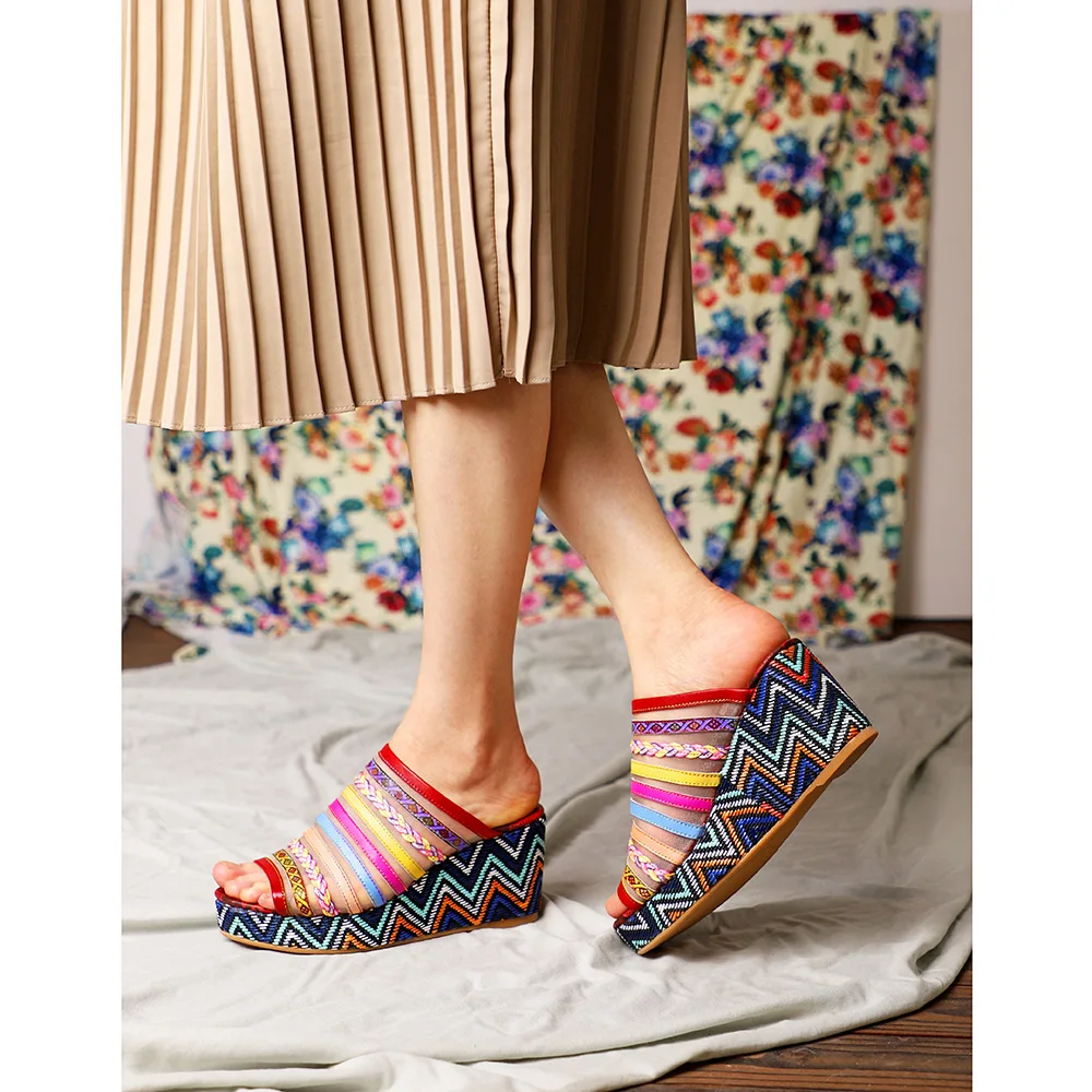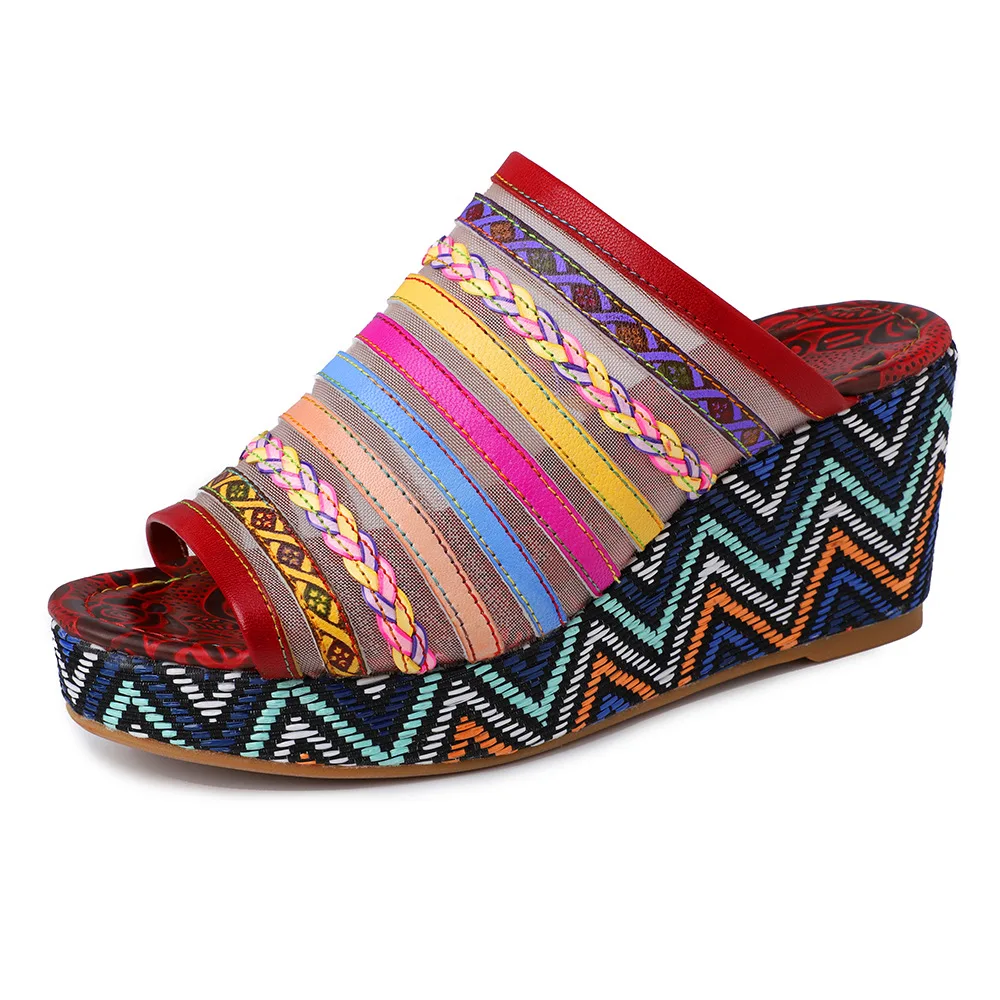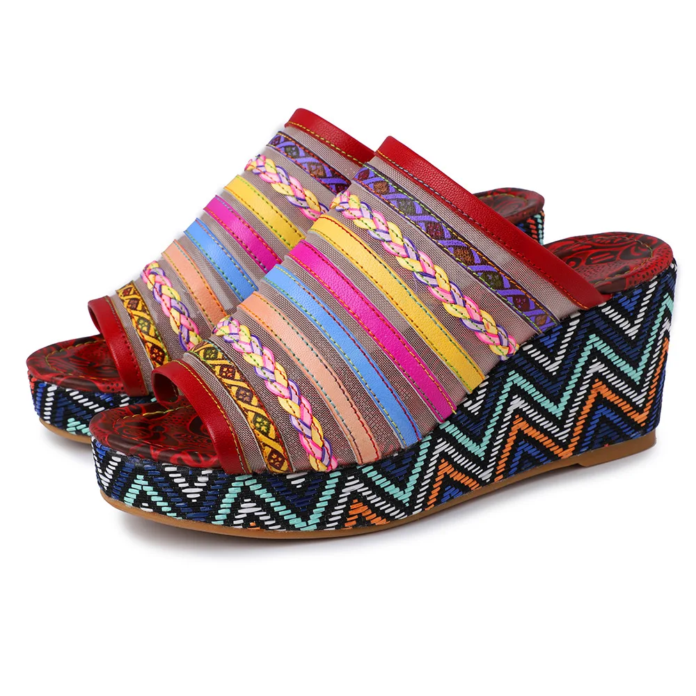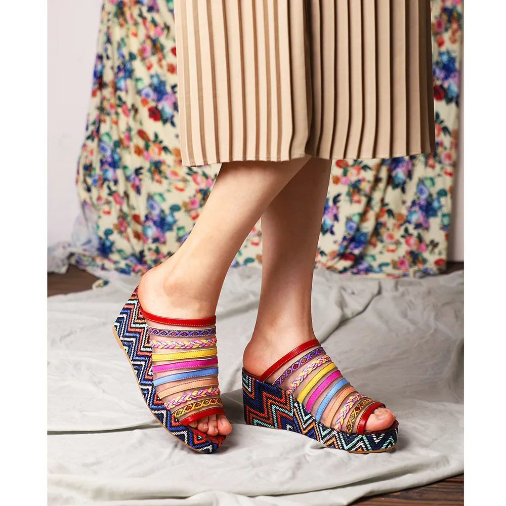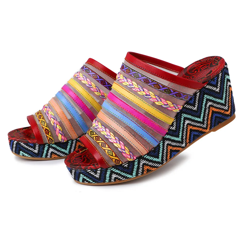 لينة حقيقية الأحذية الجلدية الربط رسمت باليد الزهور نمط إسفين كعب الصنادل اليومية أحذية أنيقة مريحة