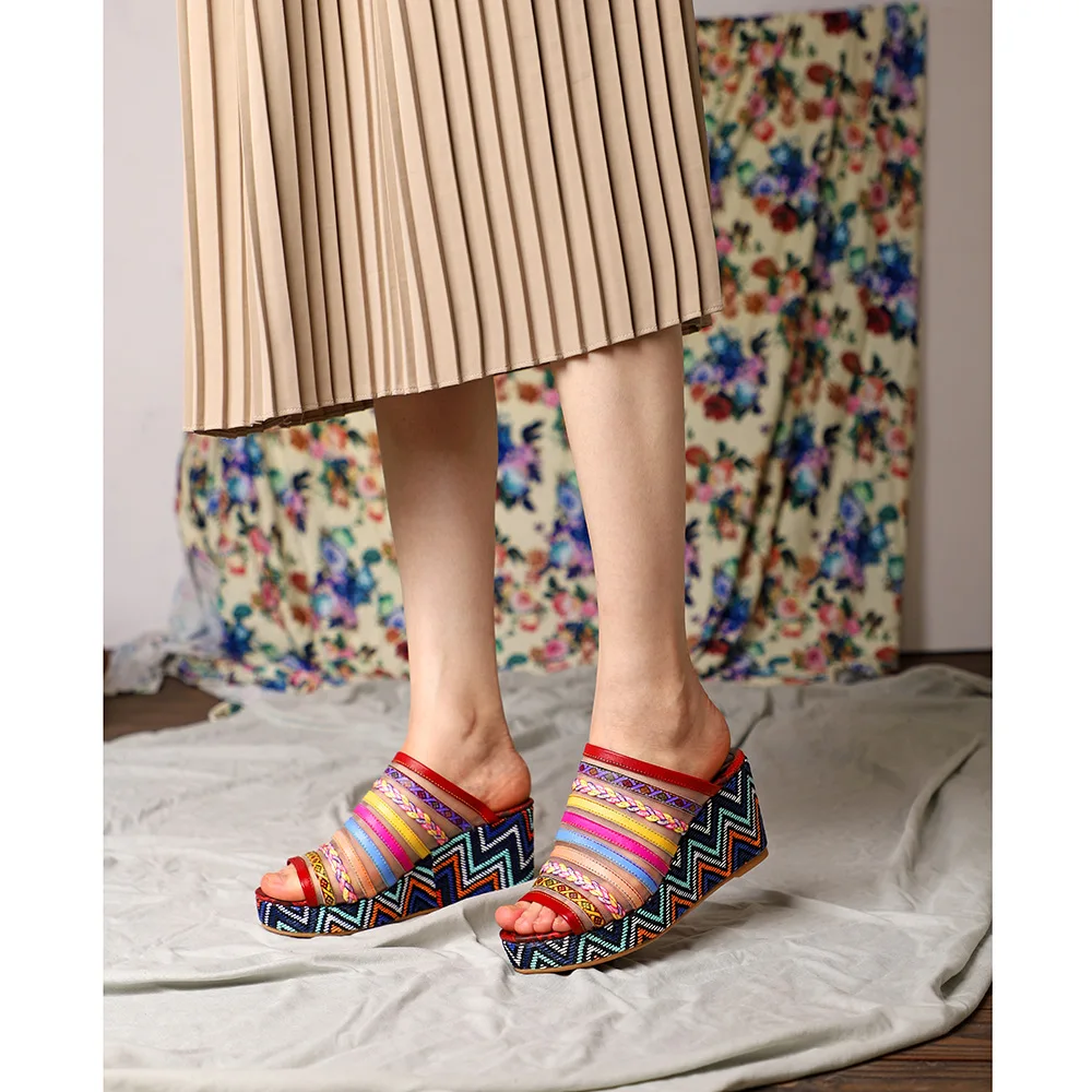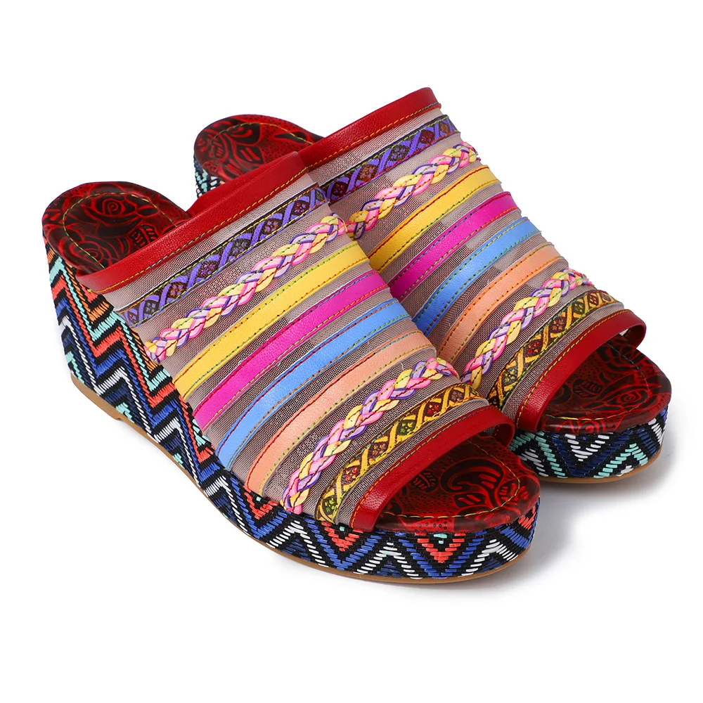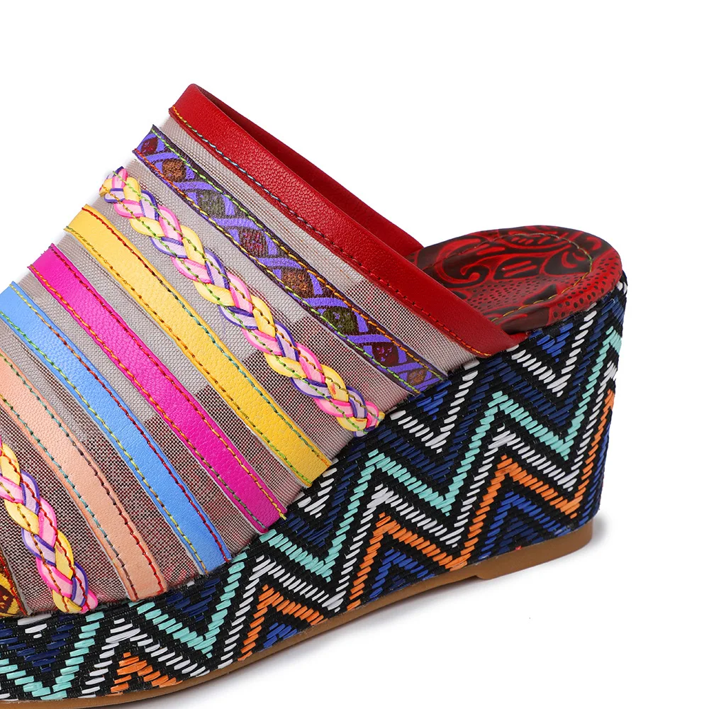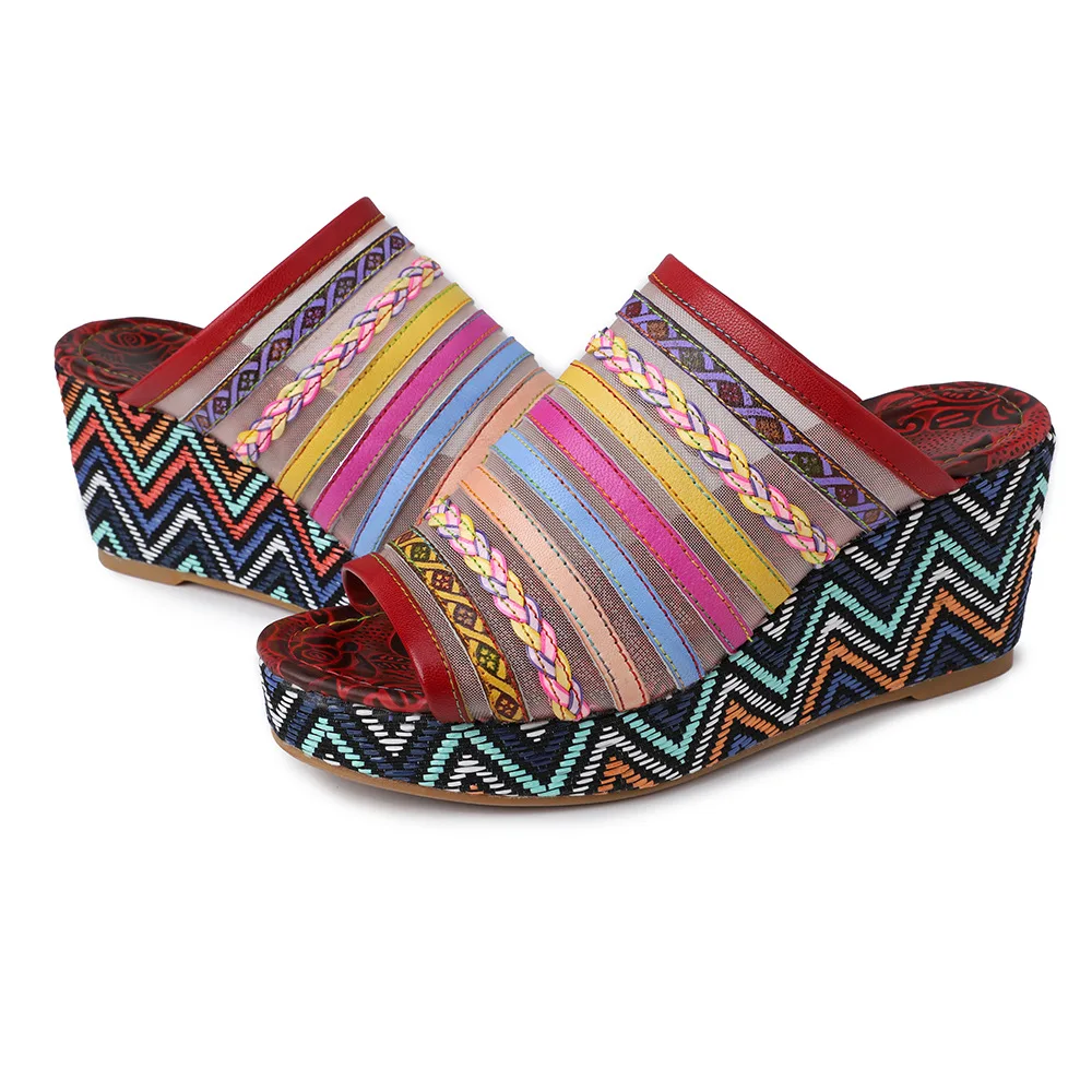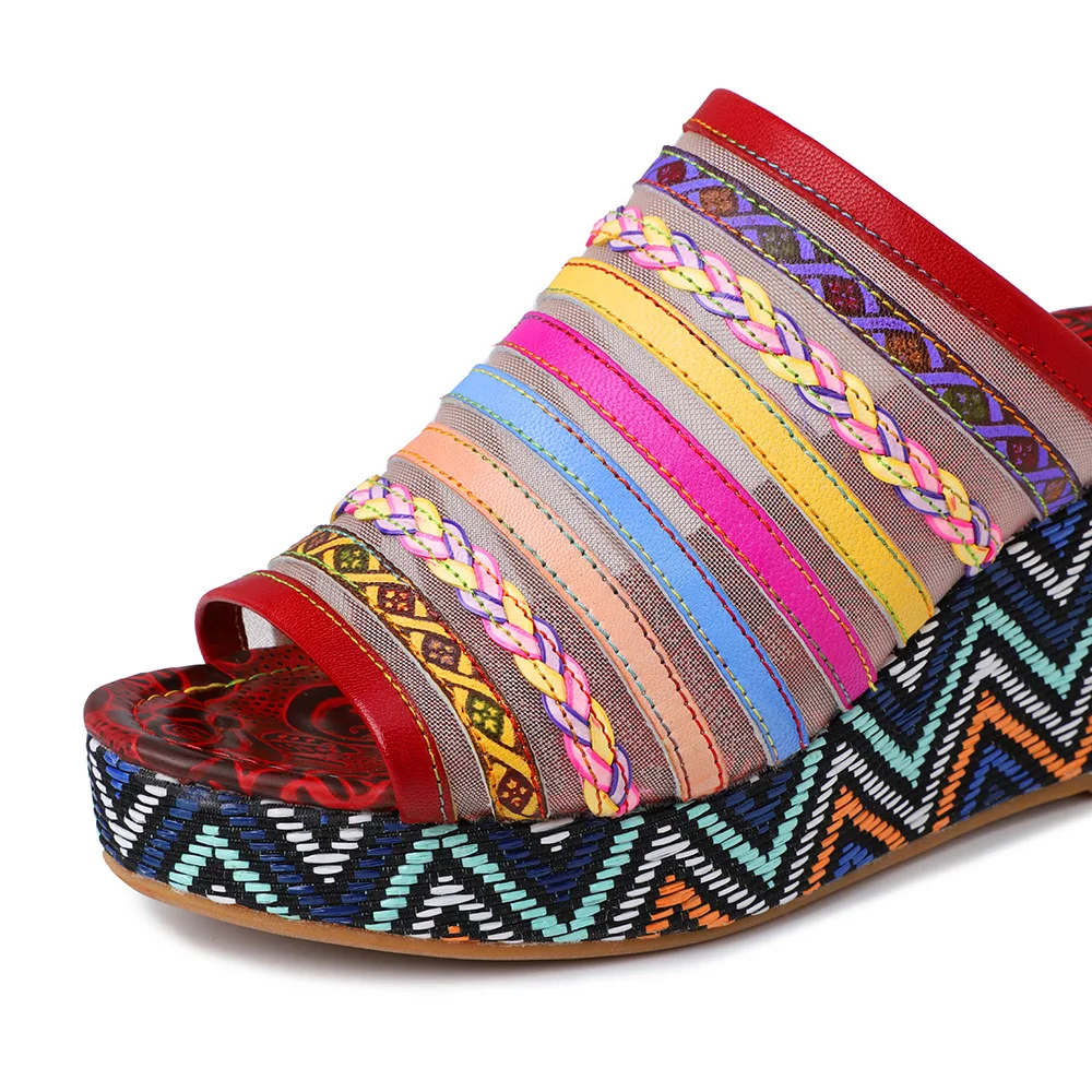 لينة حقيقية الأحذية الجلدية الربط رسمت باليد الزهور نمط إسفين كعب الصنادل اليومية أحذية أنيقة مريحة