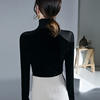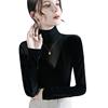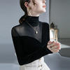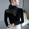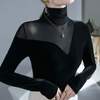 مرقع شاش شفاف الياقة المدورة تي شيرت بلايز خريف شتاء قاع أسود القطيفة التي شيرت لمط قاعدة تيز للإناث