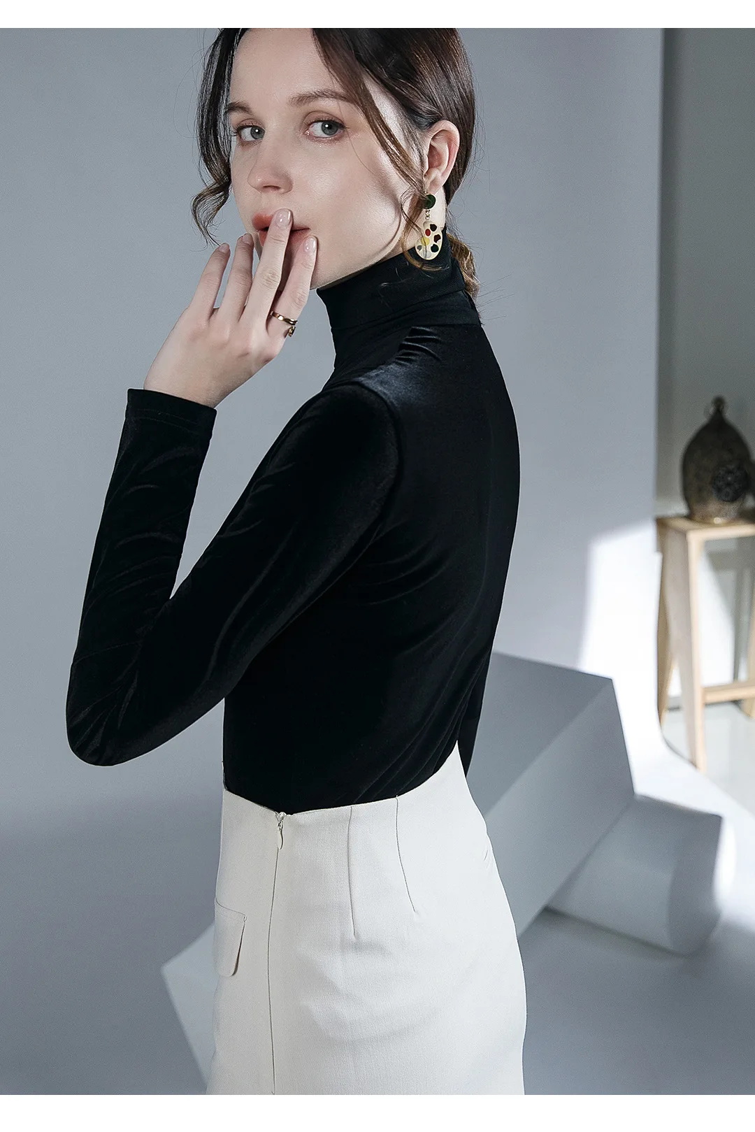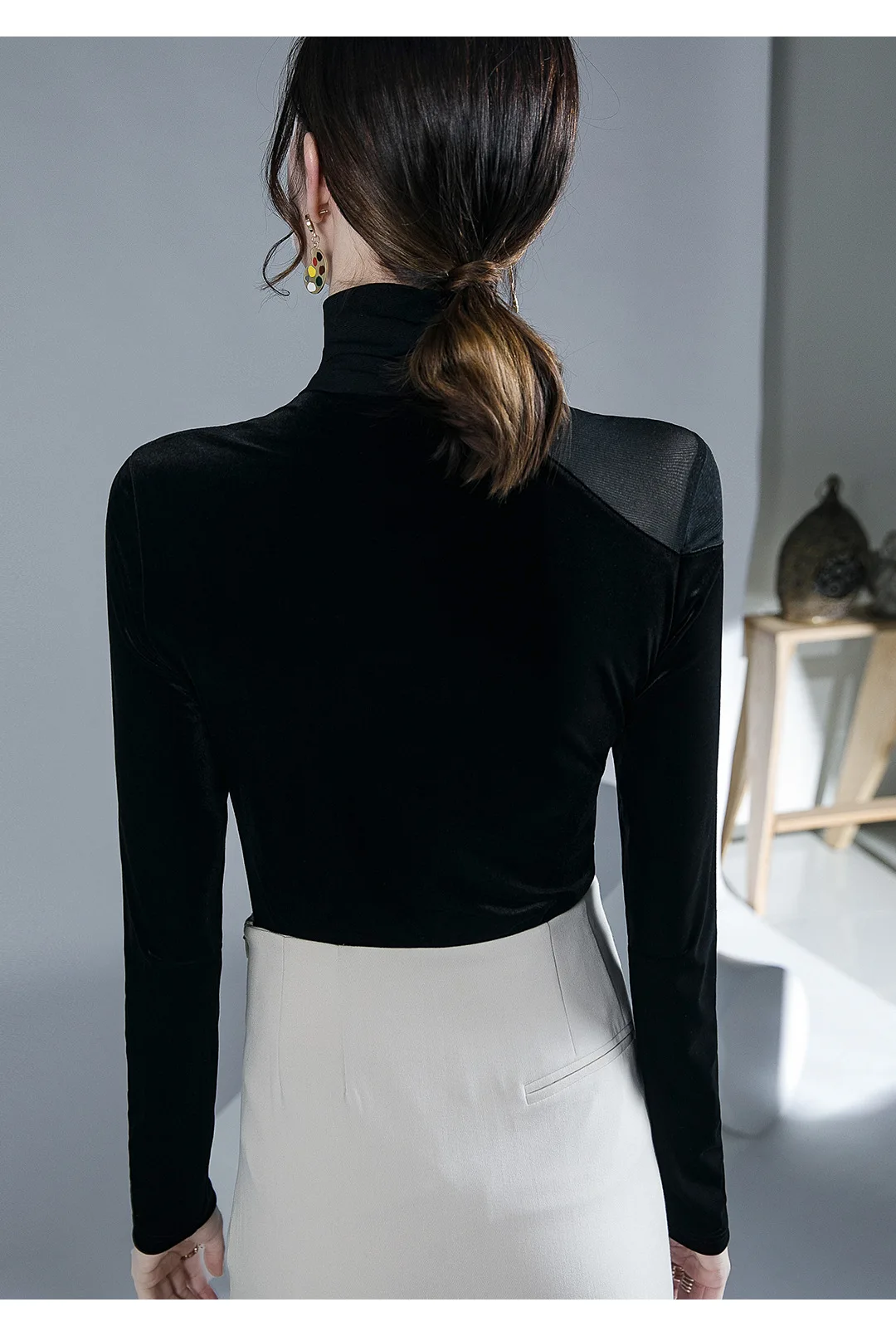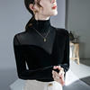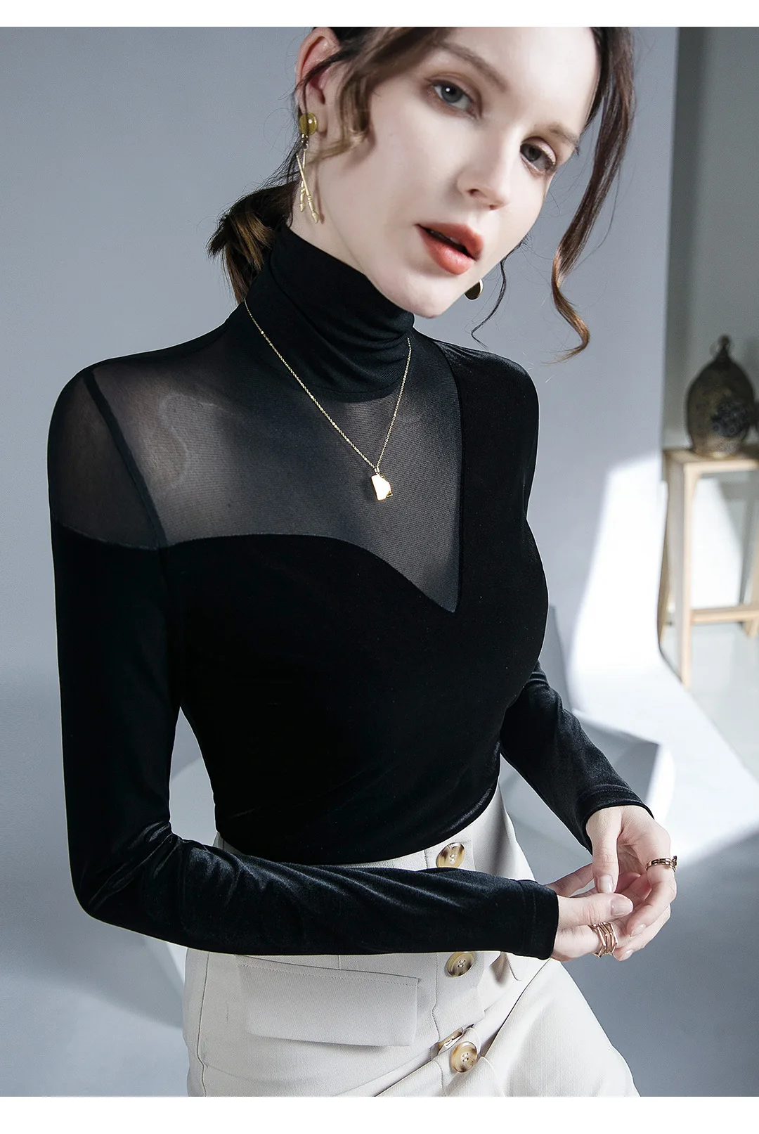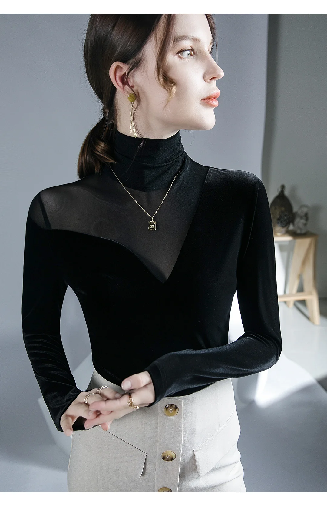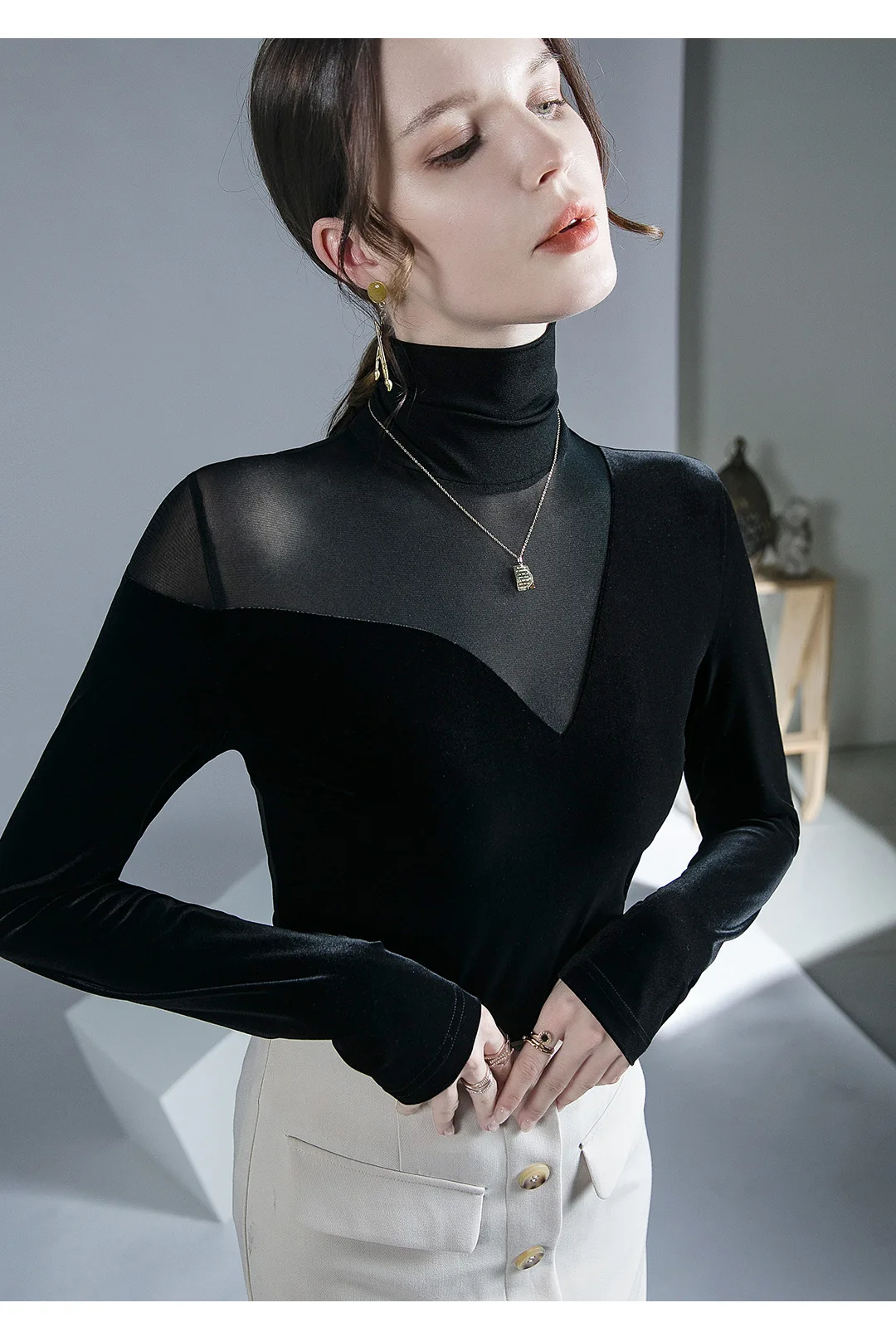 مرقع شاش شفاف الياقة المدورة تي شيرت بلايز خريف شتاء قاع أسود القطيفة التي شيرت لمط قاعدة تيز للإناث