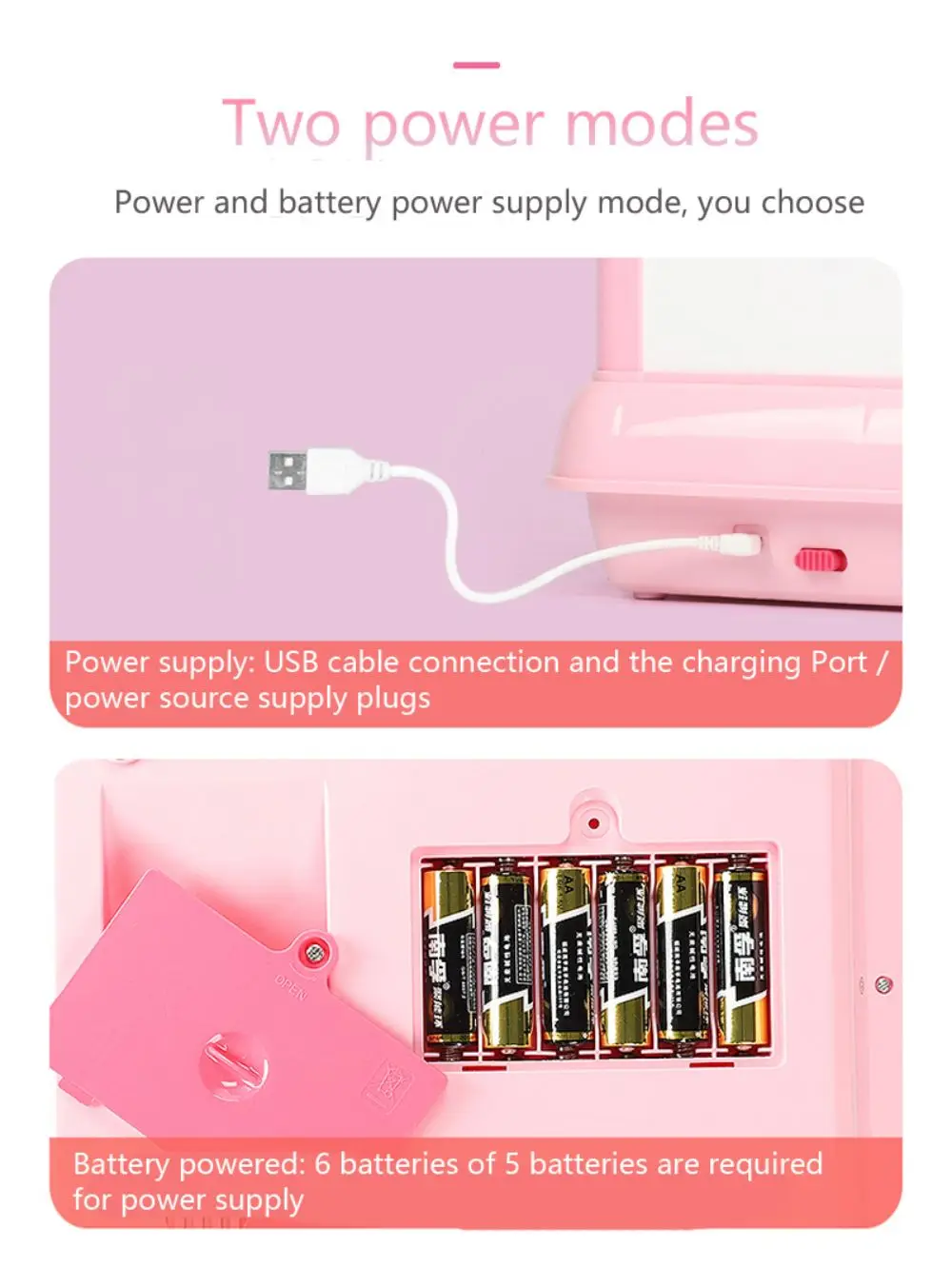 Product power supply. USB cable connection or 6*AA batteries (not included).