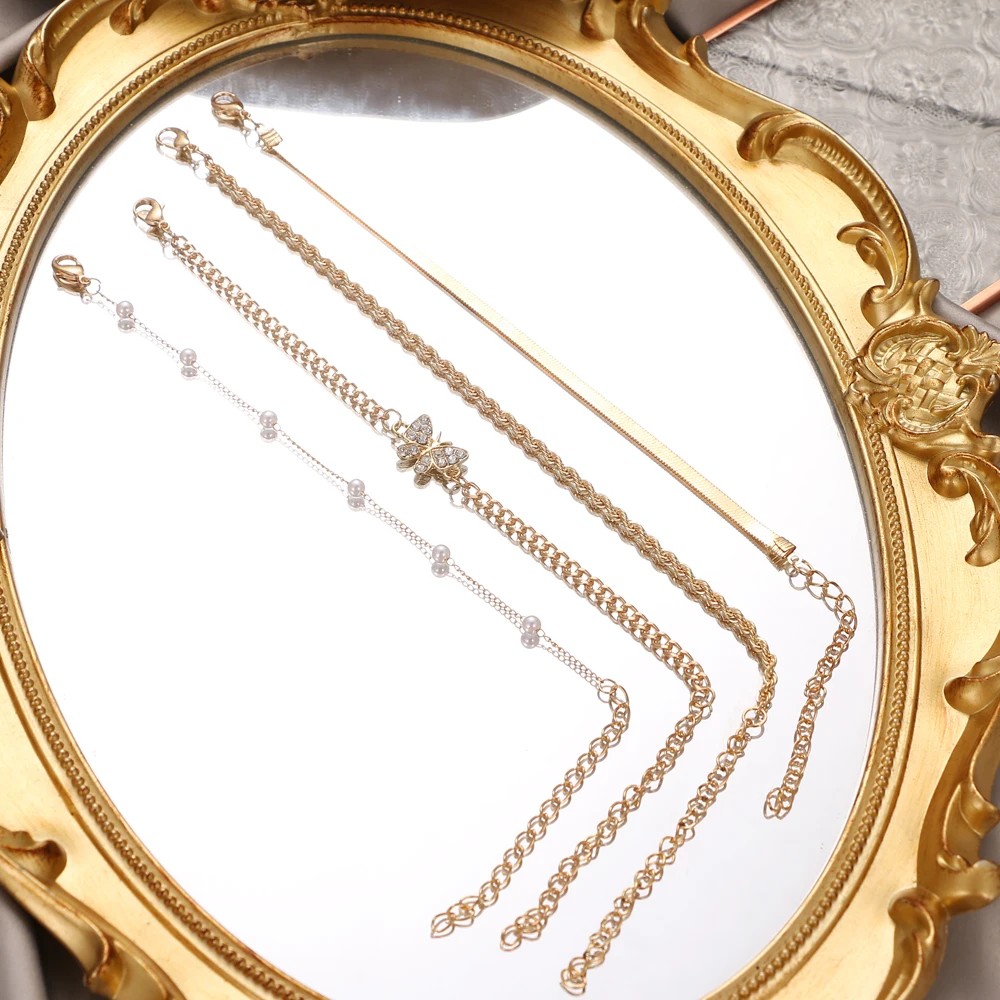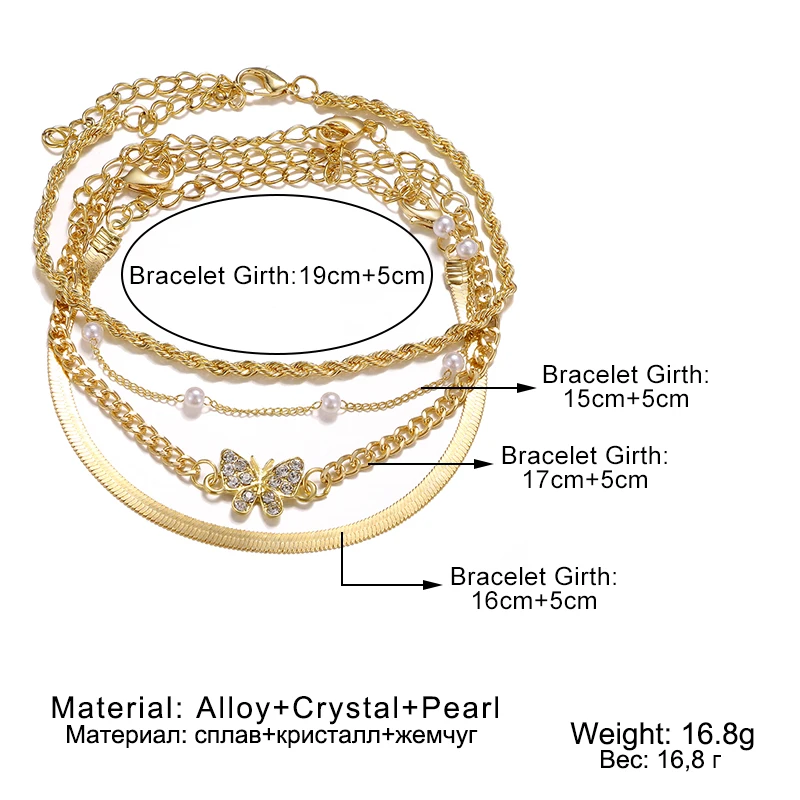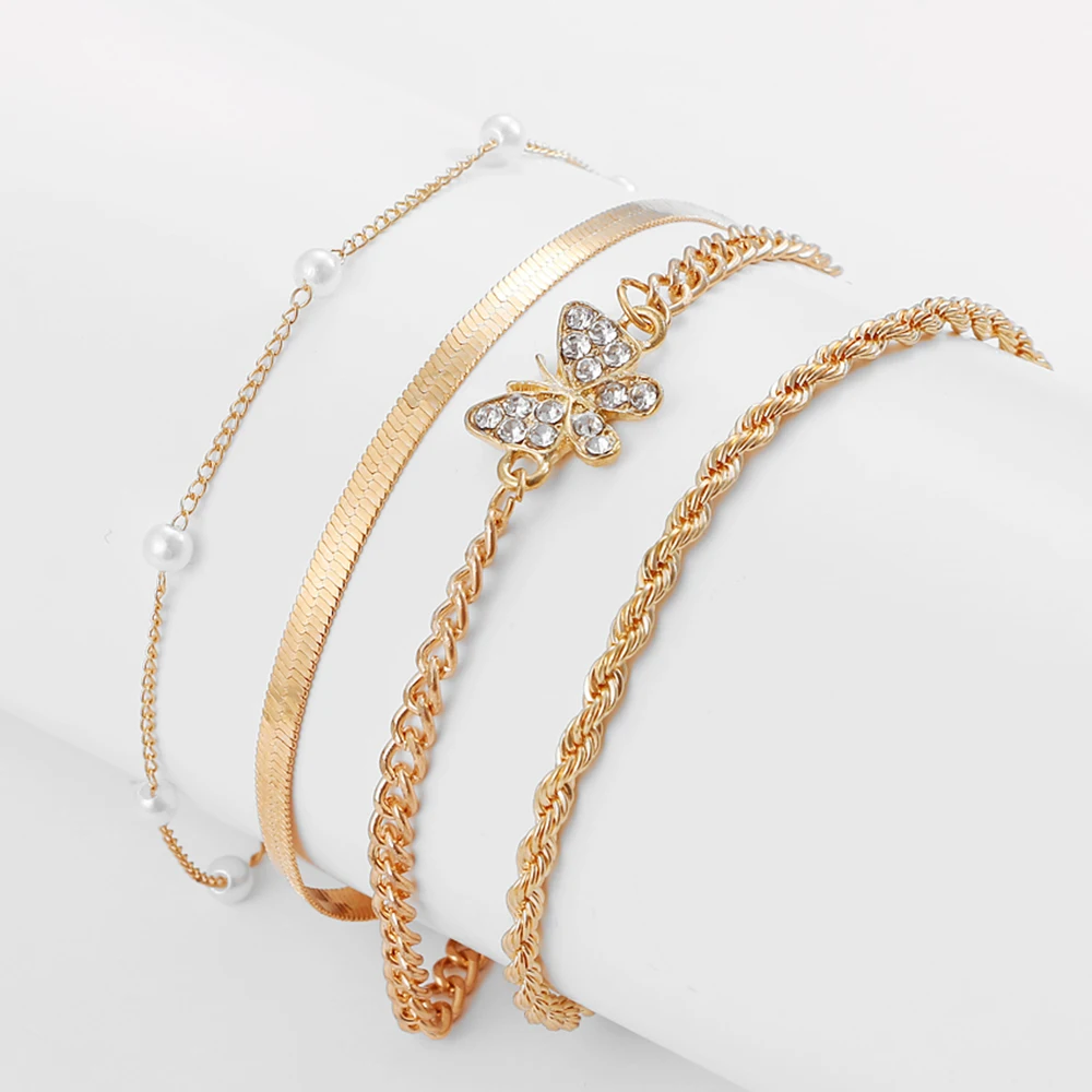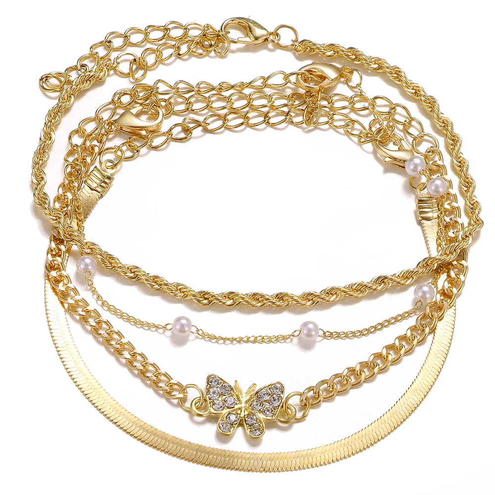 2021 خمر كريستال فراشة اللؤلؤ متعدد الطبقات شاطئ خلخال للنساء الصيف المعادن كريستال فراشة خلخال الساق مجوهرات هدية