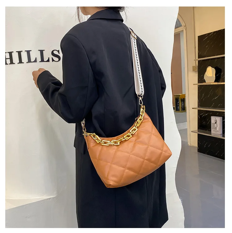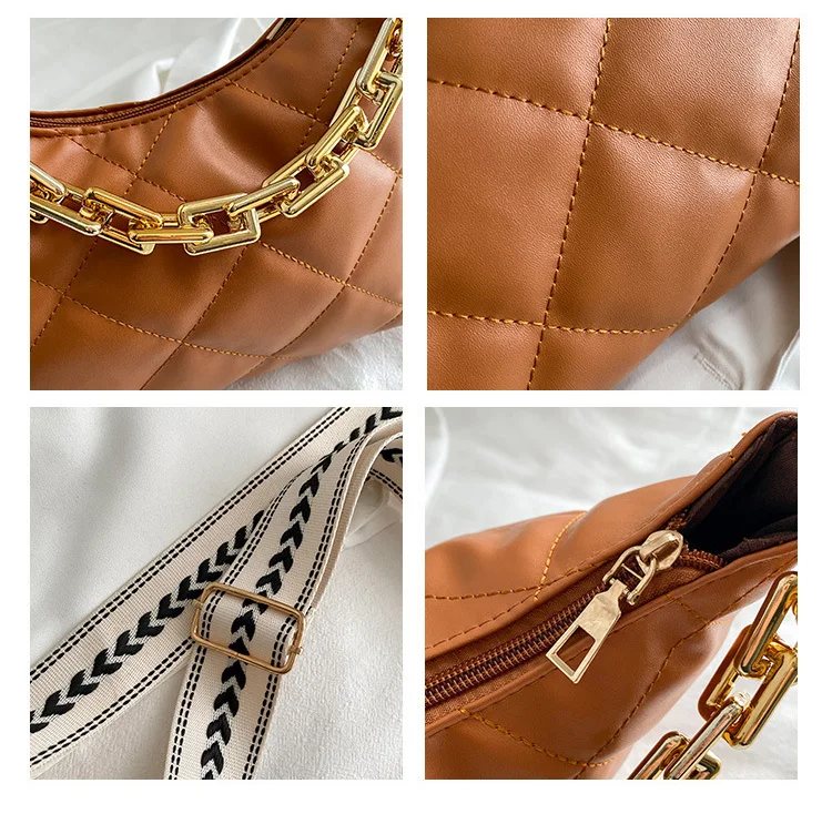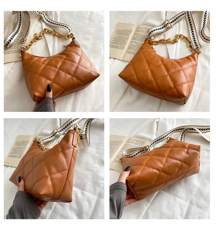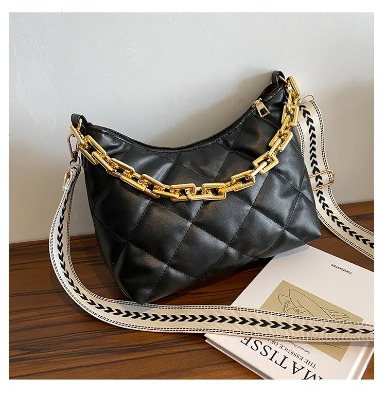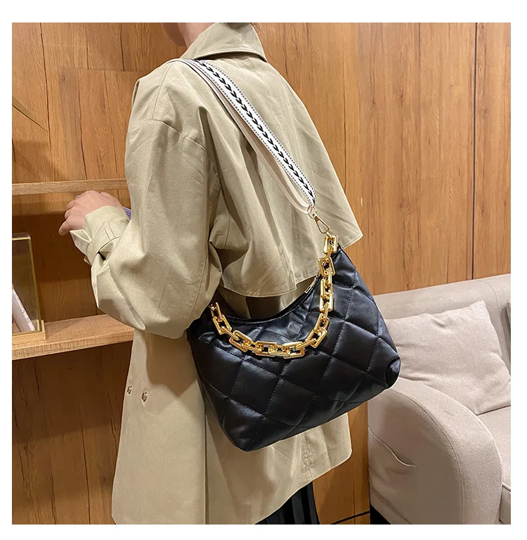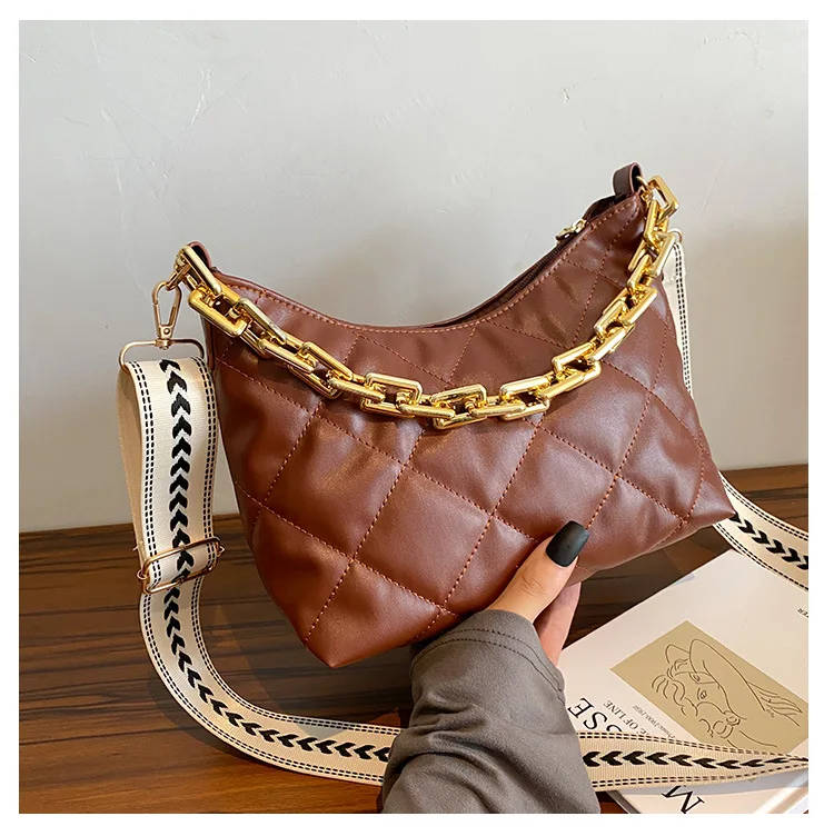 2021 موضة سلسلة سميكة حقائب كروسبودي للنساء واسعة حزام حقيبة كتف منقوشة بولي Pu حقائب يد جلدية المرأة حقيبة ساع