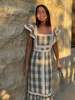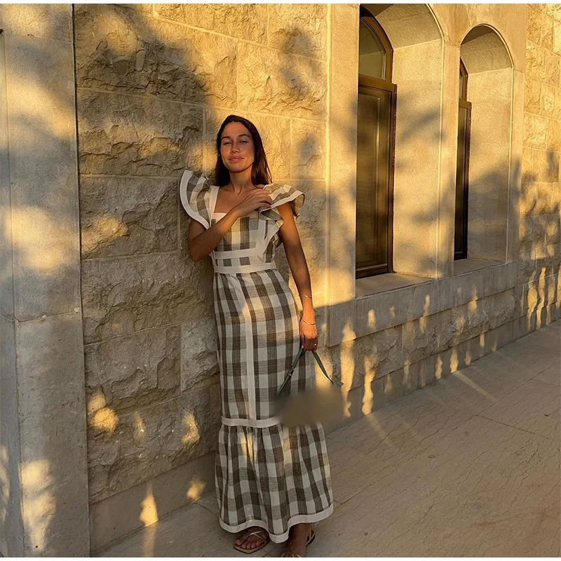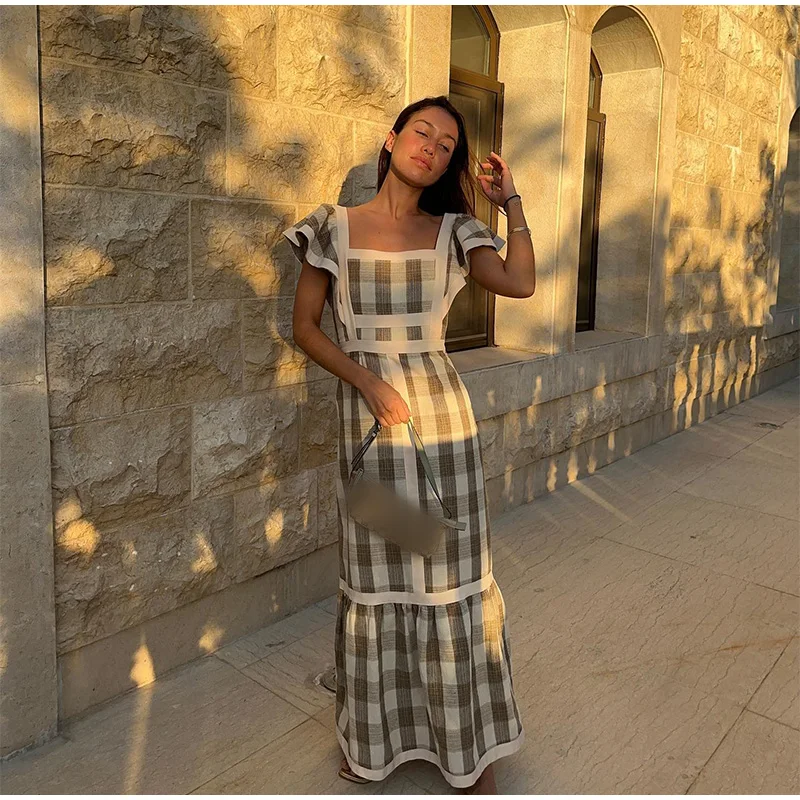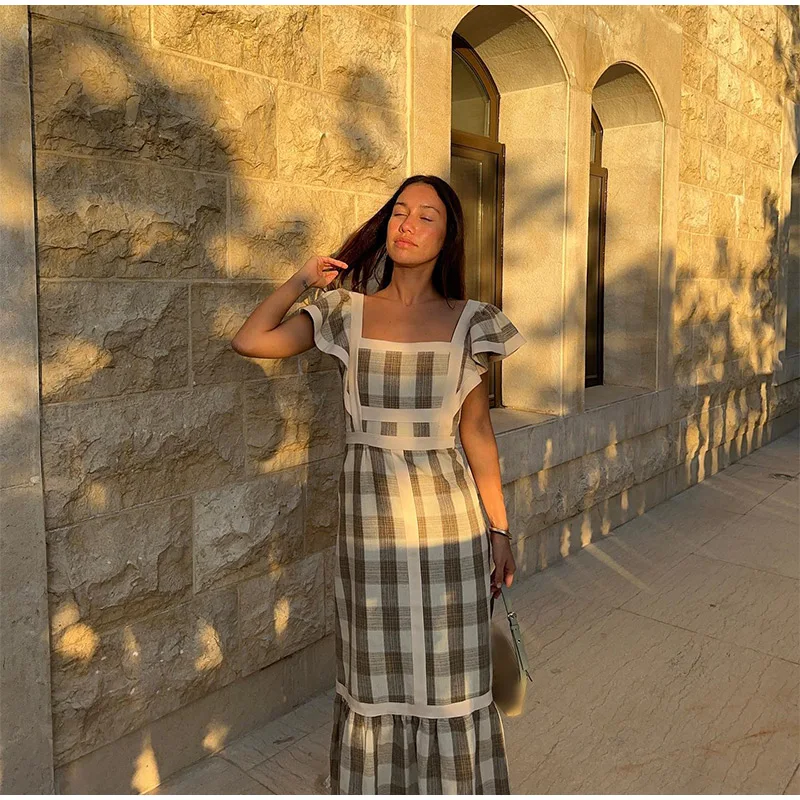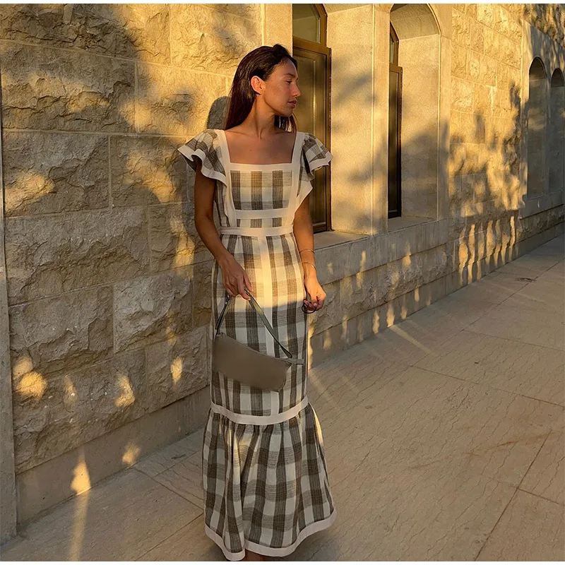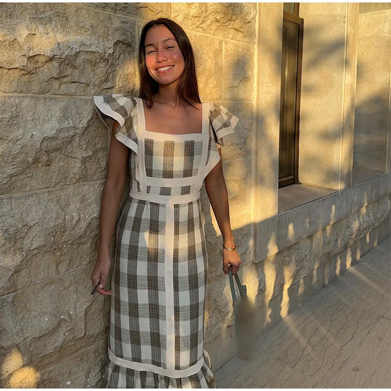 2024 Fashion Plaid Flying Sleeve Dress For Ladies Elegant Square Neck Sleeveless High-waisted Dresses Women Vintage Street Robes