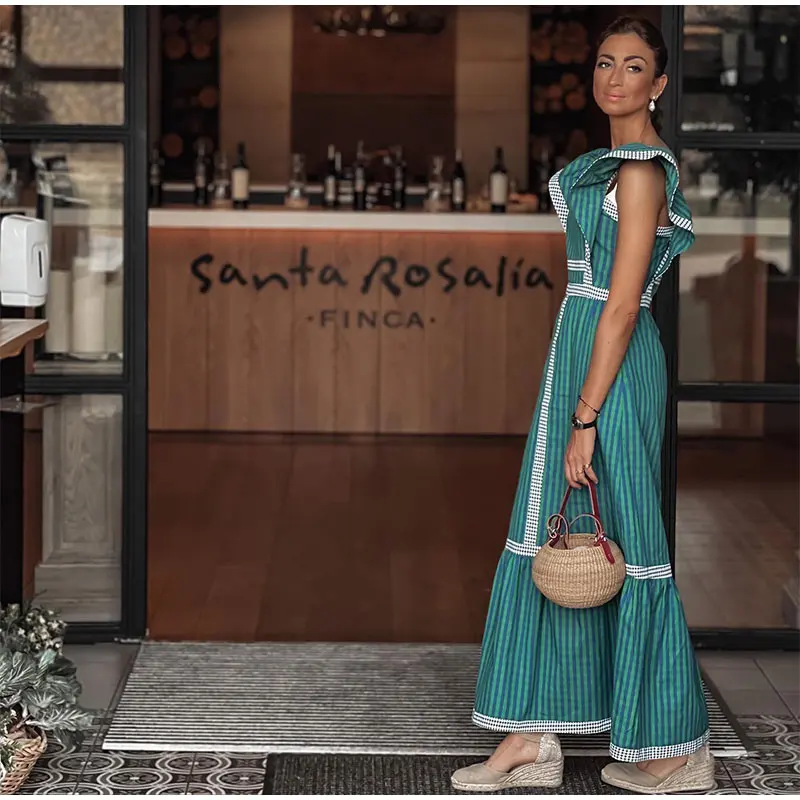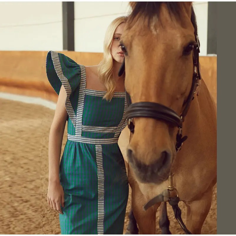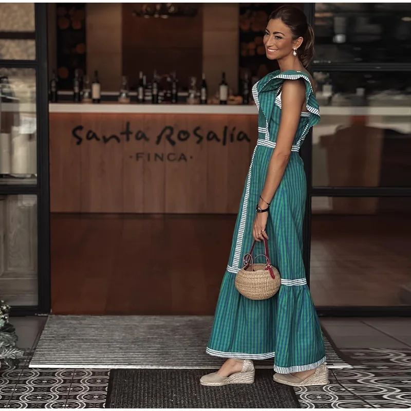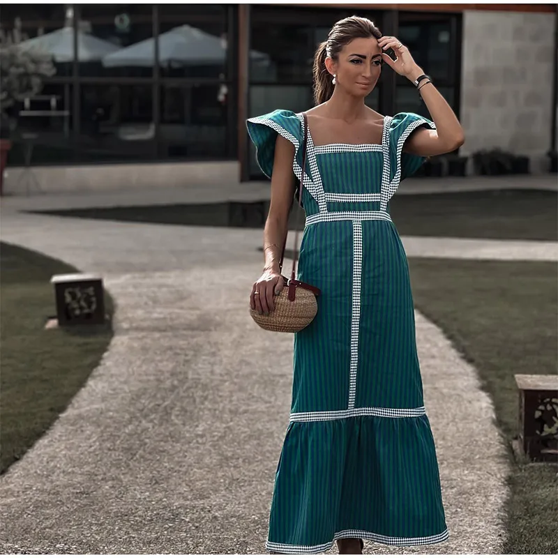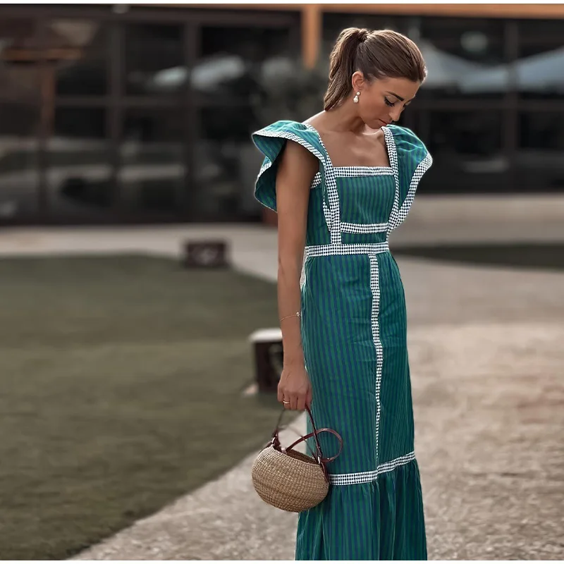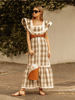 2024 Fashion Plaid Flying Sleeve Dress For Ladies Elegant Square Neck Sleeveless High-waisted Dresses Women Vintage Street Robes
