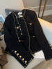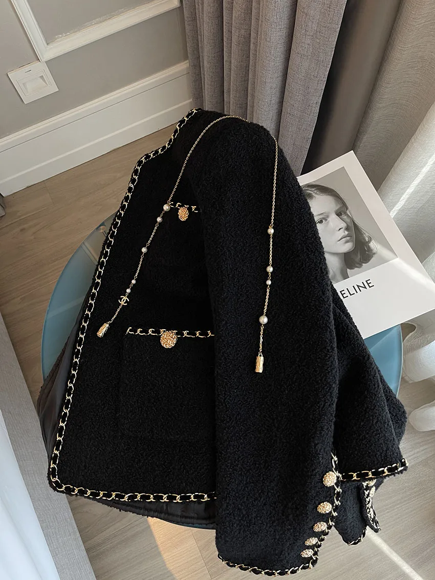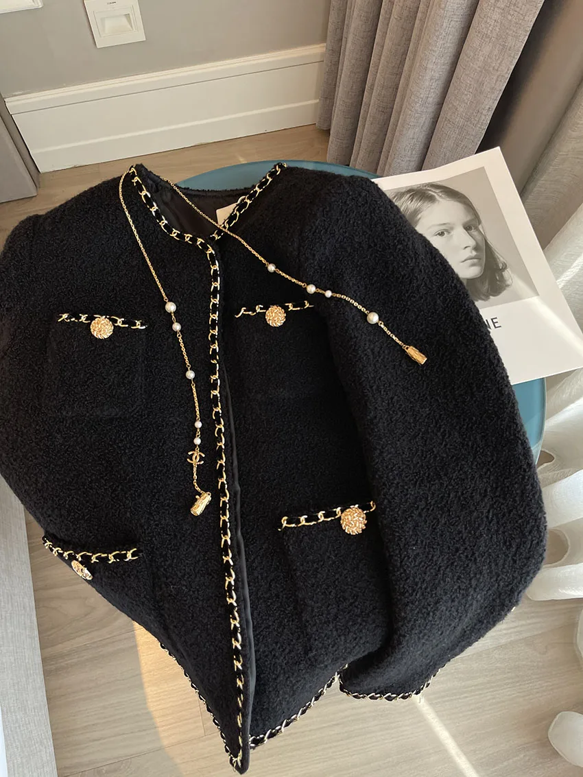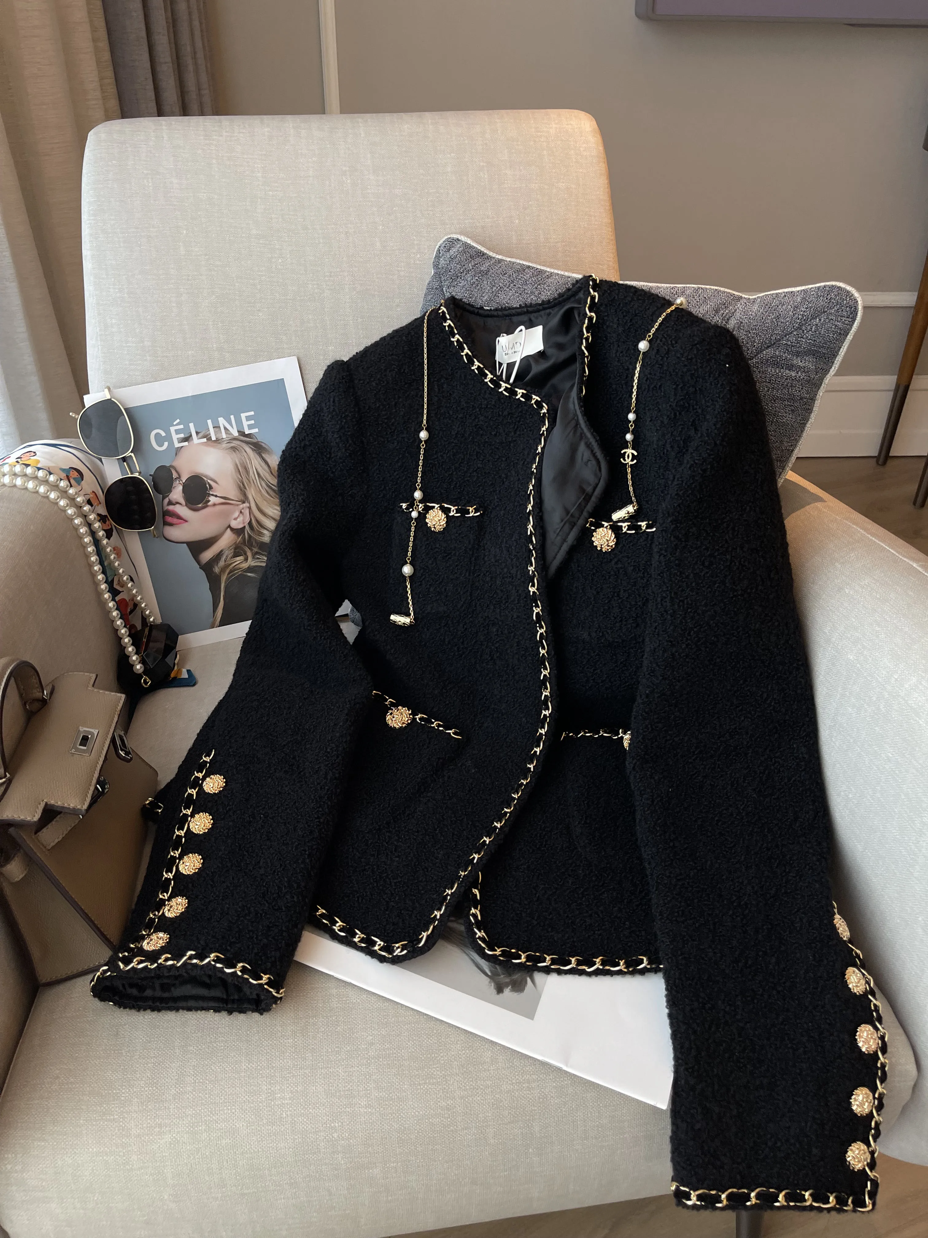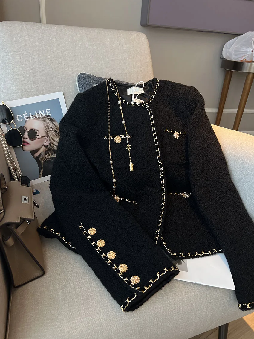 2024 Popular Beautiful Chic Short Fragrance Black Woven Gold-Rimmed Round Neck Suit Jacket Women’s Winter Autumn Blazers