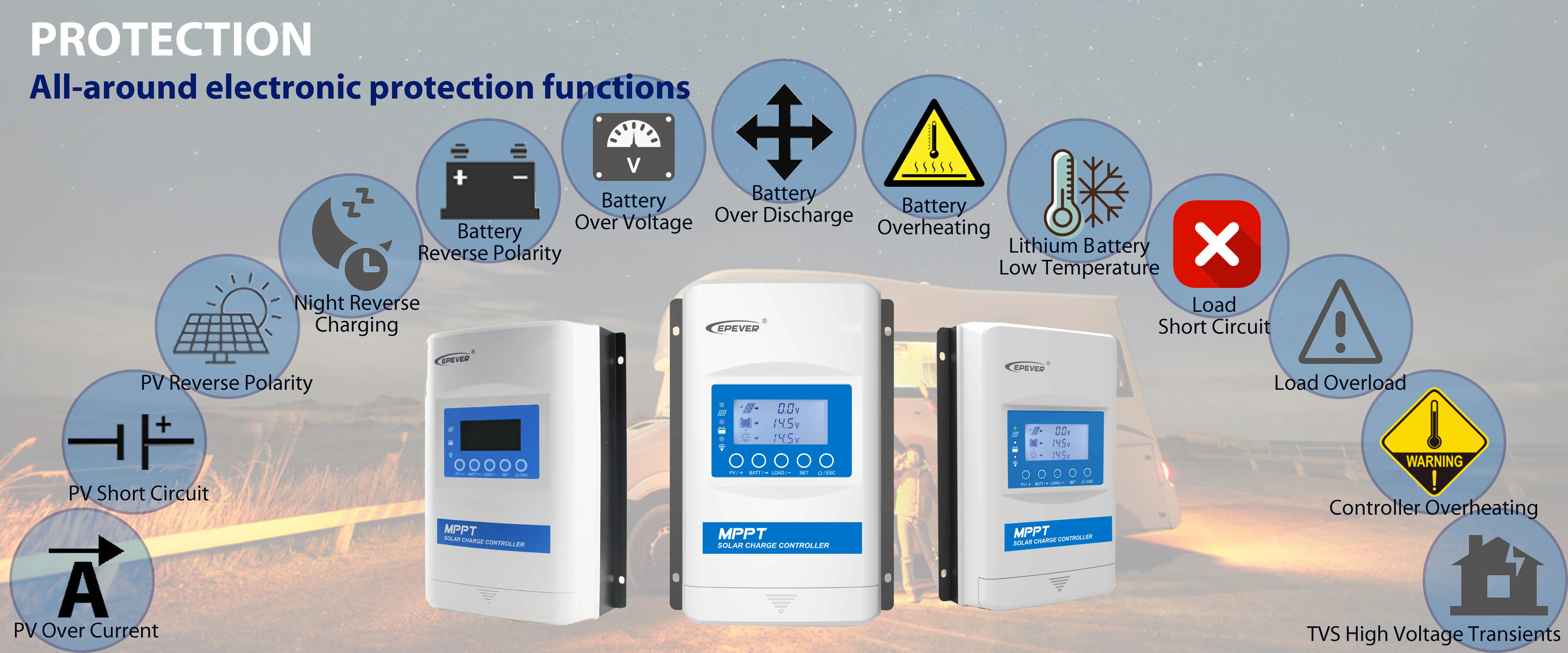 Comprehensive electronic protection of overcharge, over-discharge, PV & battery reverse polarity, etc., ensures the solar system is more reliable and durable. This controller can be widely used for RV, household systems, field monitoring, and many other applications.