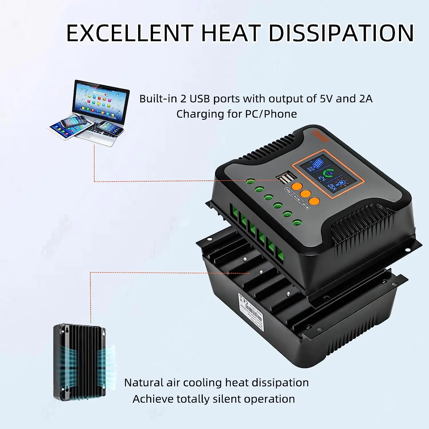 30A 60A 80A PWM Solar Charger Controller 12V 24V 36V 48V Auto Max PV 100Vdc with Dual USB Port Backlight LCD Display Regulator