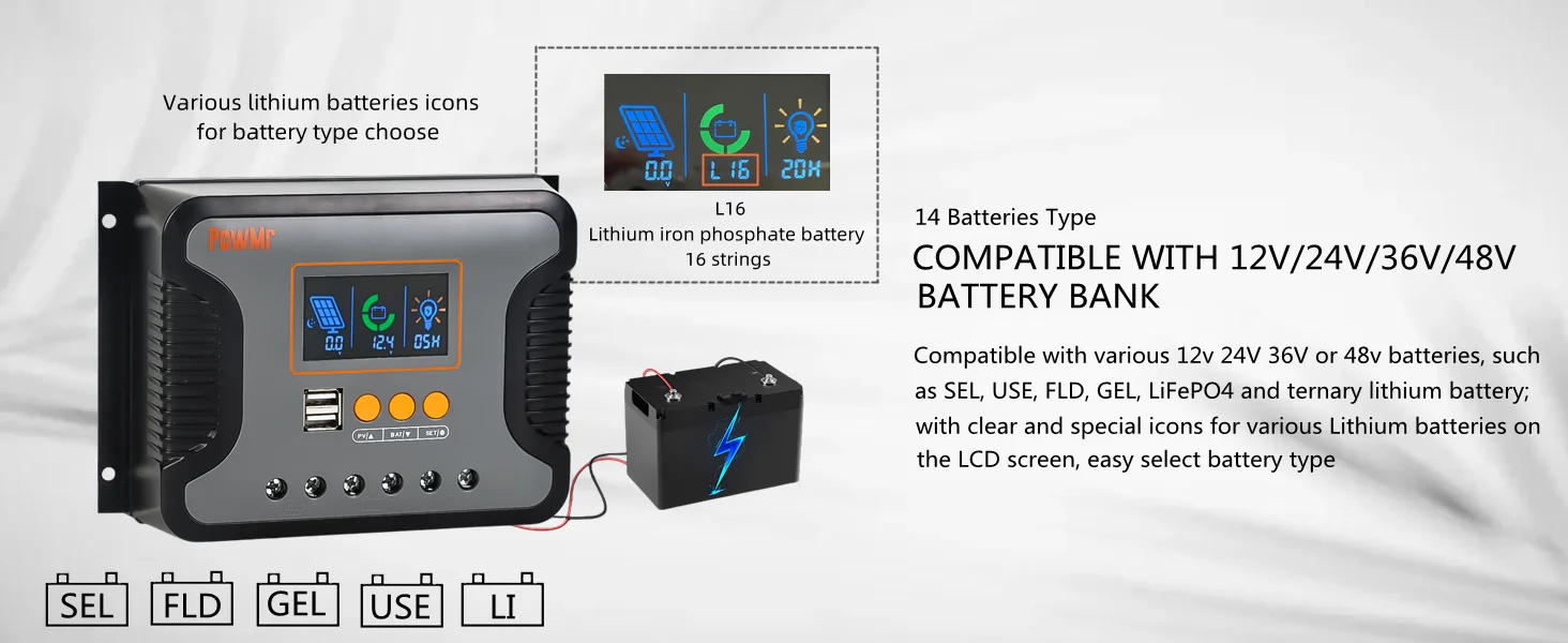 Compatible with various 12v 24V 36V or 48v batteries, such as SEL, USE, FLD, GEL, LiFePO4 and ternary lithium battery; with clear and special icons for various Lithium batteries on the LCD screen, easy select battery type; support user-defined batteries and calibrate battery voltage.